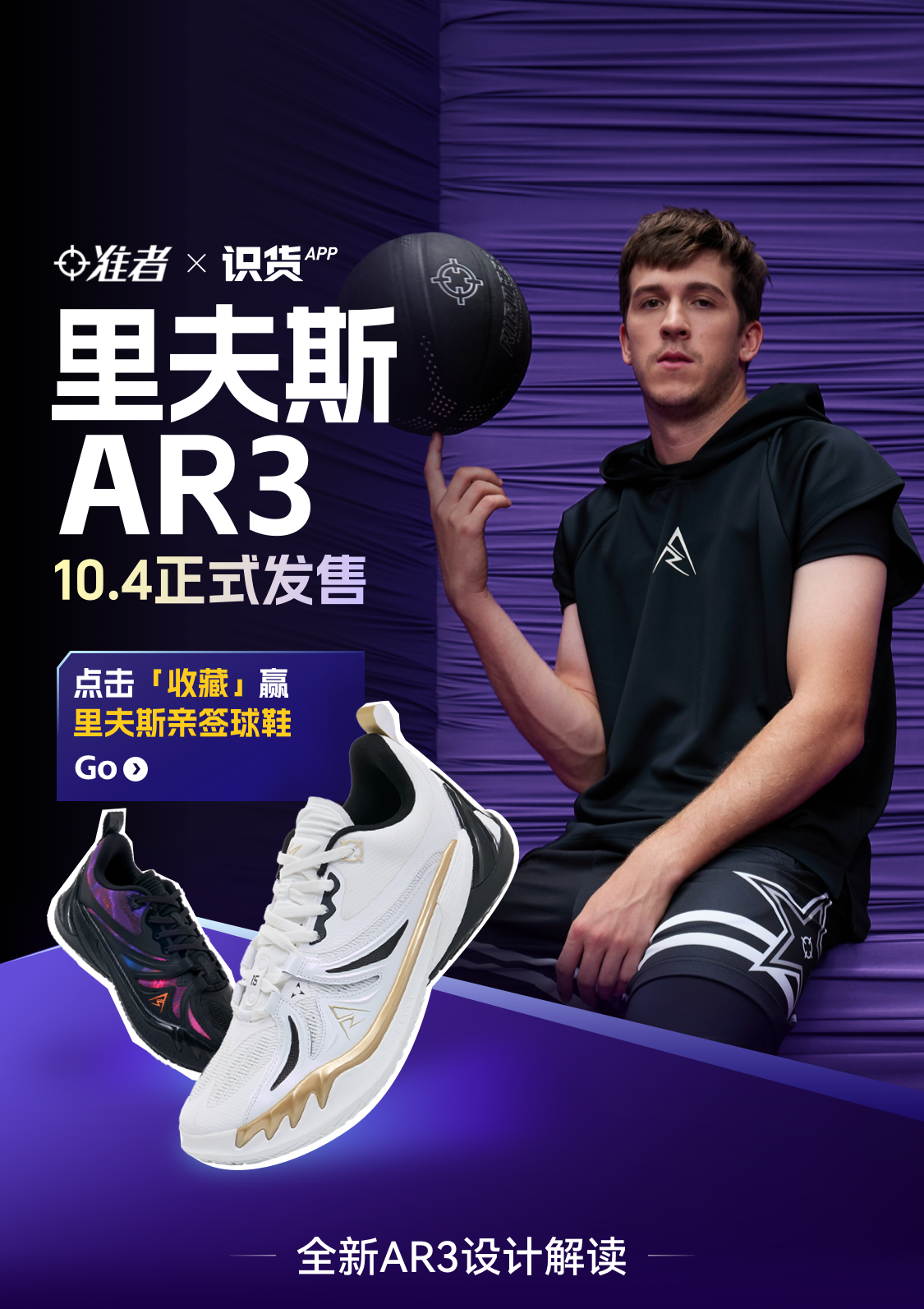 准者里夫斯AR系列再进化!第三形态【杀手】来袭!AR3正式登场!AR3侧面TPU设计灵感来源于“小李飞刀”, 鞋面俯视角度为翅膀造型,内侧为电绣工艺;前掌防侧翻结构+翼状鞋面包裹结构+后跟稳定系统组成稳定系统;异形双密度TPU结构镂空减重实现立体抗扭;升级超临界鞋垫配合全掌“咻弹”科技,带来舒适回弹。AR3首发配色【杀手】【银河】10月4日发售,里夫斯比赛穿着的同款鞋垫一同发售,两者组合实战更有实力!组合下单更优惠!此番,准者携手识货带来重磅福利!即日起在#里夫斯三代登场话题下按要求投稿准者或里夫斯相关内容,即有机会获得AR3大奖!具体活动规则如下: 【活动日期】2025.930-2025.10.17【开奖日期】2025.10.21【参与方式】打开识货APP-社区,在话题#里夫斯三代登场,话题下发布准者与里夫斯相关内容,内容创意不限于:秀出你的里夫斯AR系列产品、自用准者好物推荐、里夫斯新赛季期待等,内容需正确关联产品,并在正文内正确标注品牌名称,符合投稿内容要求的用户即有机会获得品牌活动奖励 【奖励规则】特等奖:准者里夫斯3代AR3(共5人,尺码可选)获奖规则:将在符合投稿要求的作者中通过投稿数量(20%)、内容质量(50%)、互动数据表现(30%)三方面综合比较,筛选出5名用户进行排名分别获得球鞋奖项。注:只有晒出里夫斯AR系列鞋款的投稿用户才具有免费球鞋抽取的资格 参与奖:识货限定周边(共10人,尺码可选)获奖规则:将在符合投稿要求的作者中,随机抽选10位,获得识货限定周边一份。 【活动说明】① 晒非准者产品的笔记,将视为无效投稿,无法参与本次活动评奖。② 历史发布过的个人笔记,不能重复投稿参与,识货保留监督权利。③ 本次活动各个奖项具有唯一性。④ 活动严禁盗图,非原创内容一经发现,将被永久取消社区奖励资格。⑤ 活动最终解释权归主办方所有