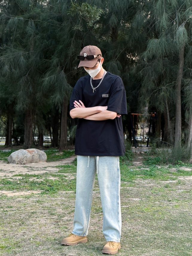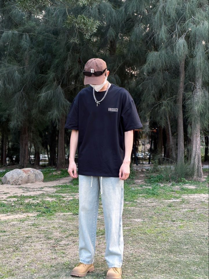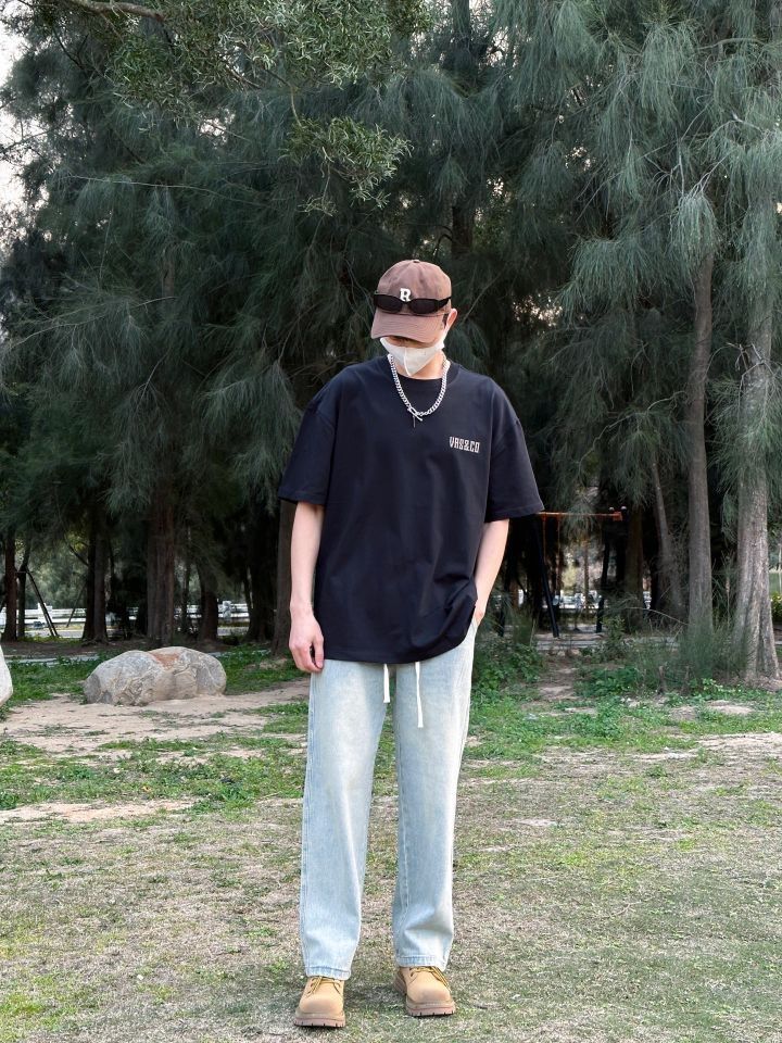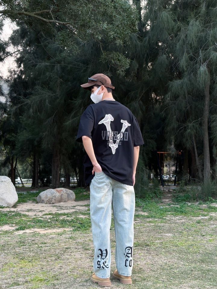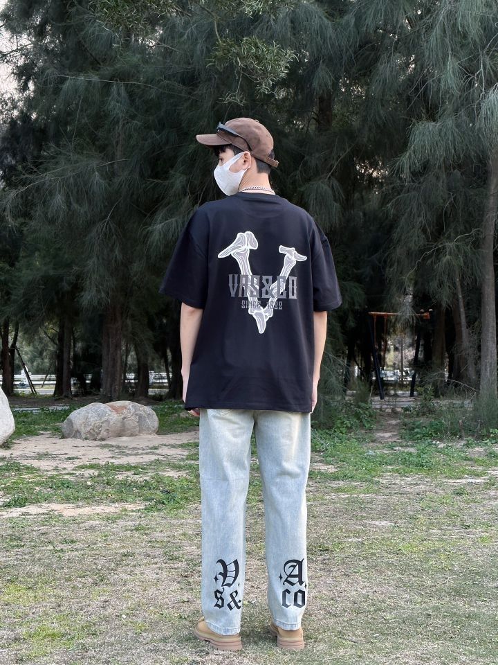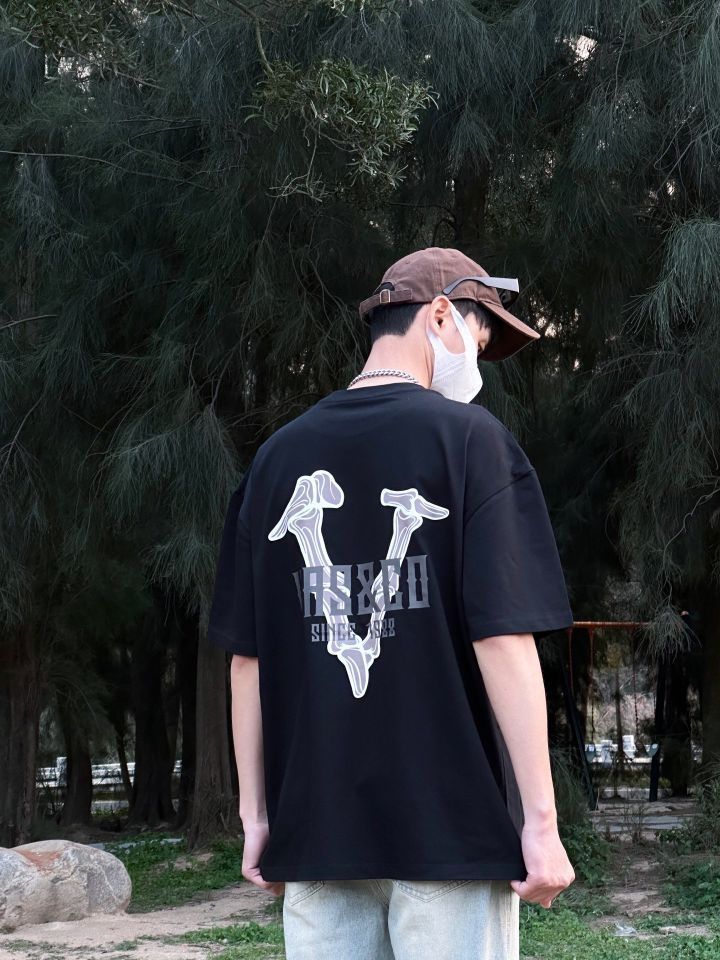 黑t上的“v”字骨头🦴印花图案即是装饰也增加趣味性,也能很好的中和黑色的暗沉,