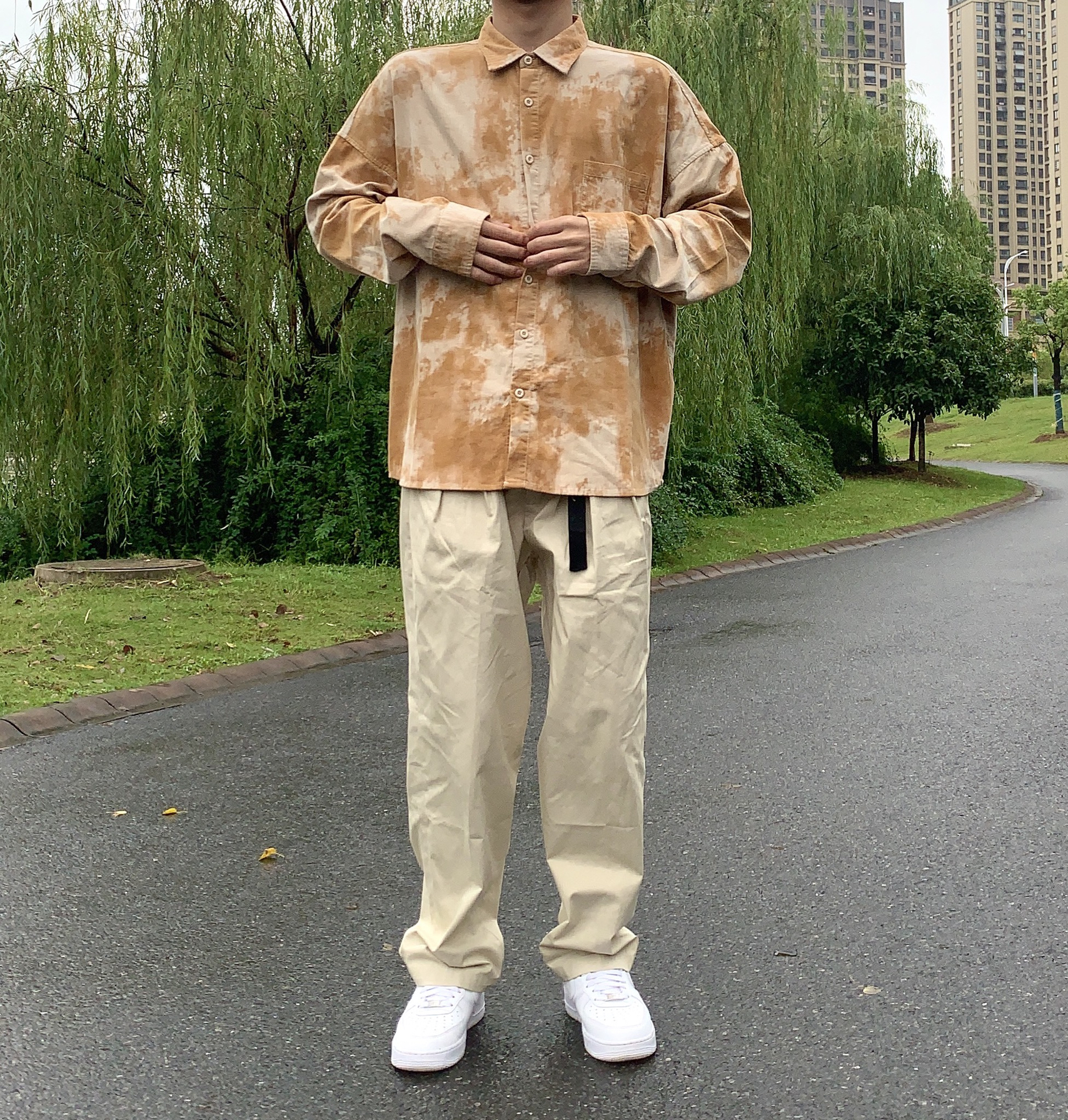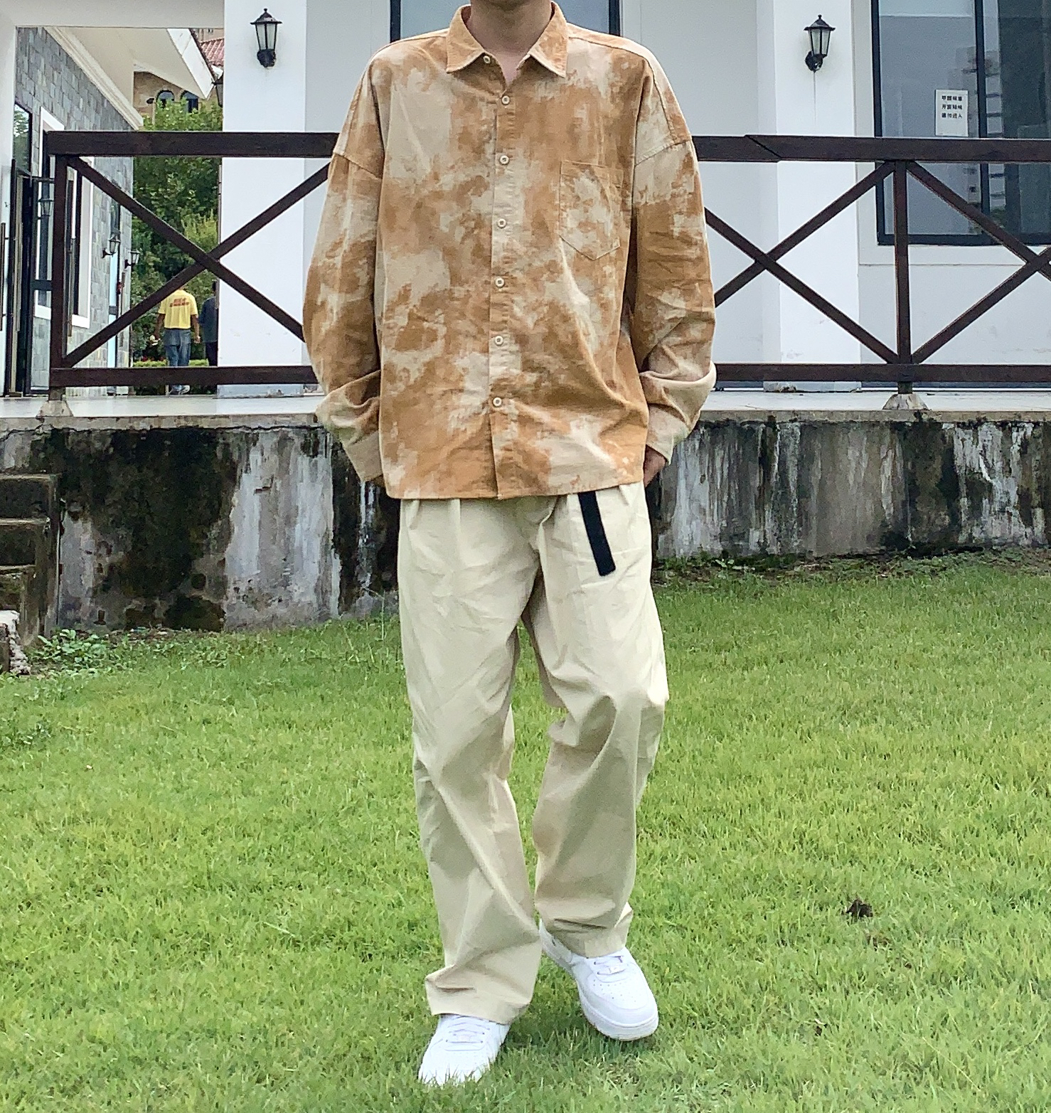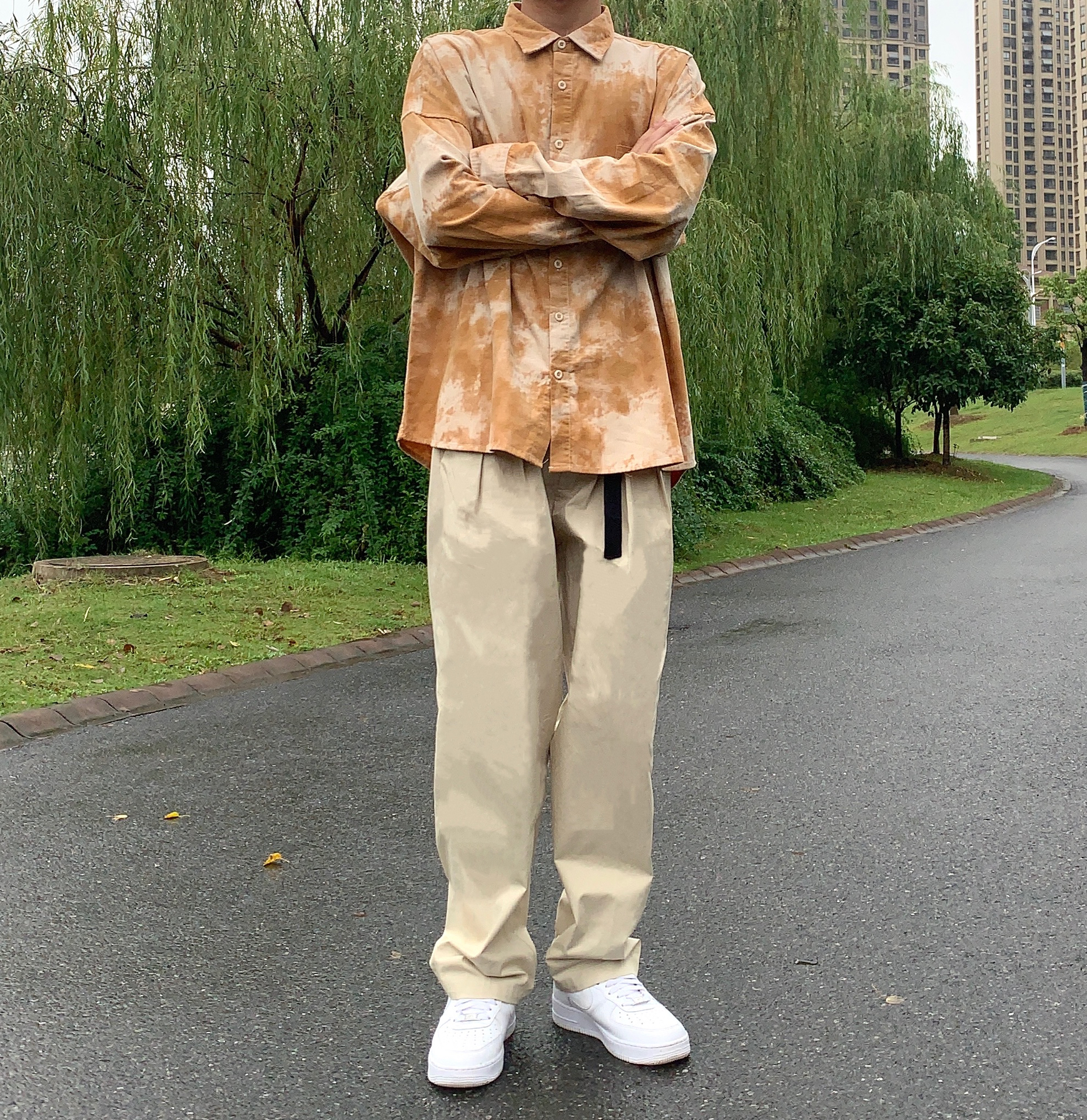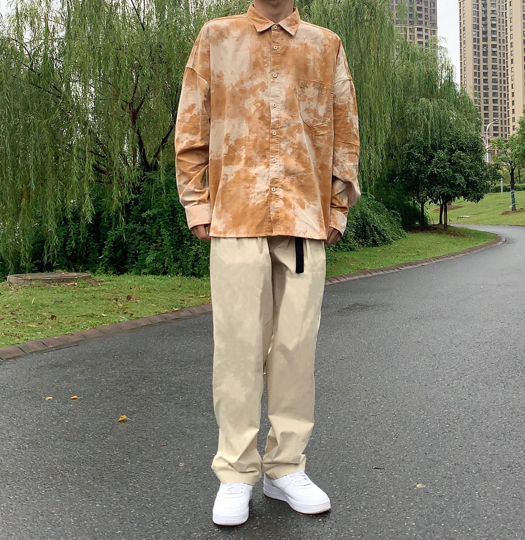 👔:可乐生活 👖:可乐生活 衬衫是扎染的 非常好看 面料是棉的 很厚 冬天作为棉服的内搭很好看 颜色也很显白 版型非常好 裤子是工装版型 卡其色 与衬衫呼应 鞋子选择空军 一身非常协调
