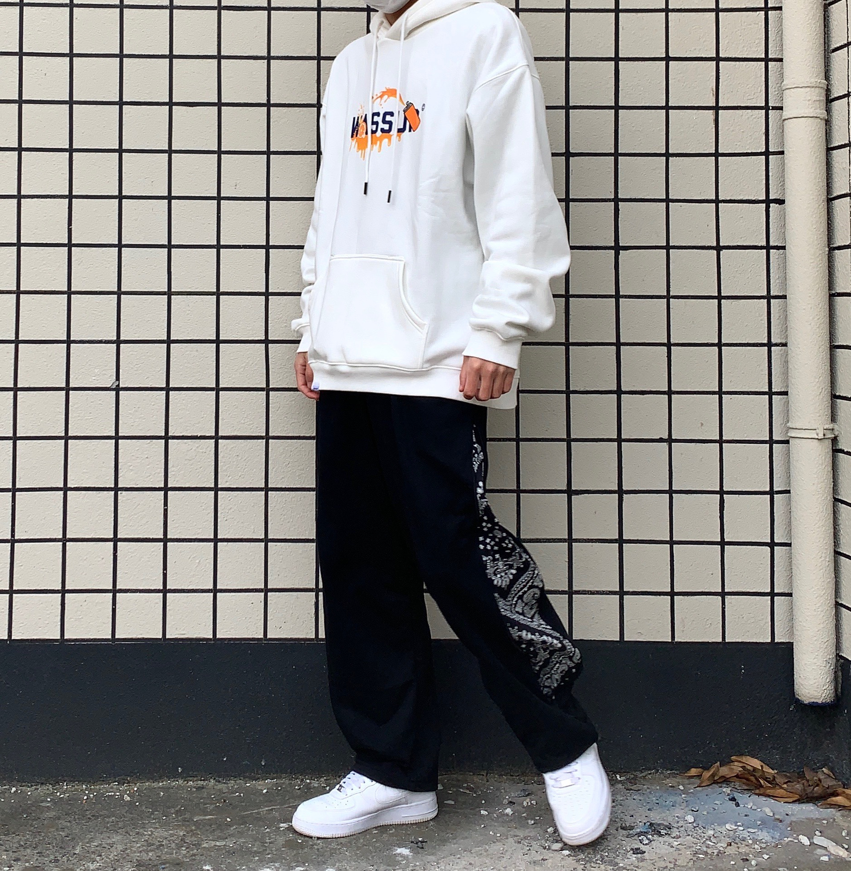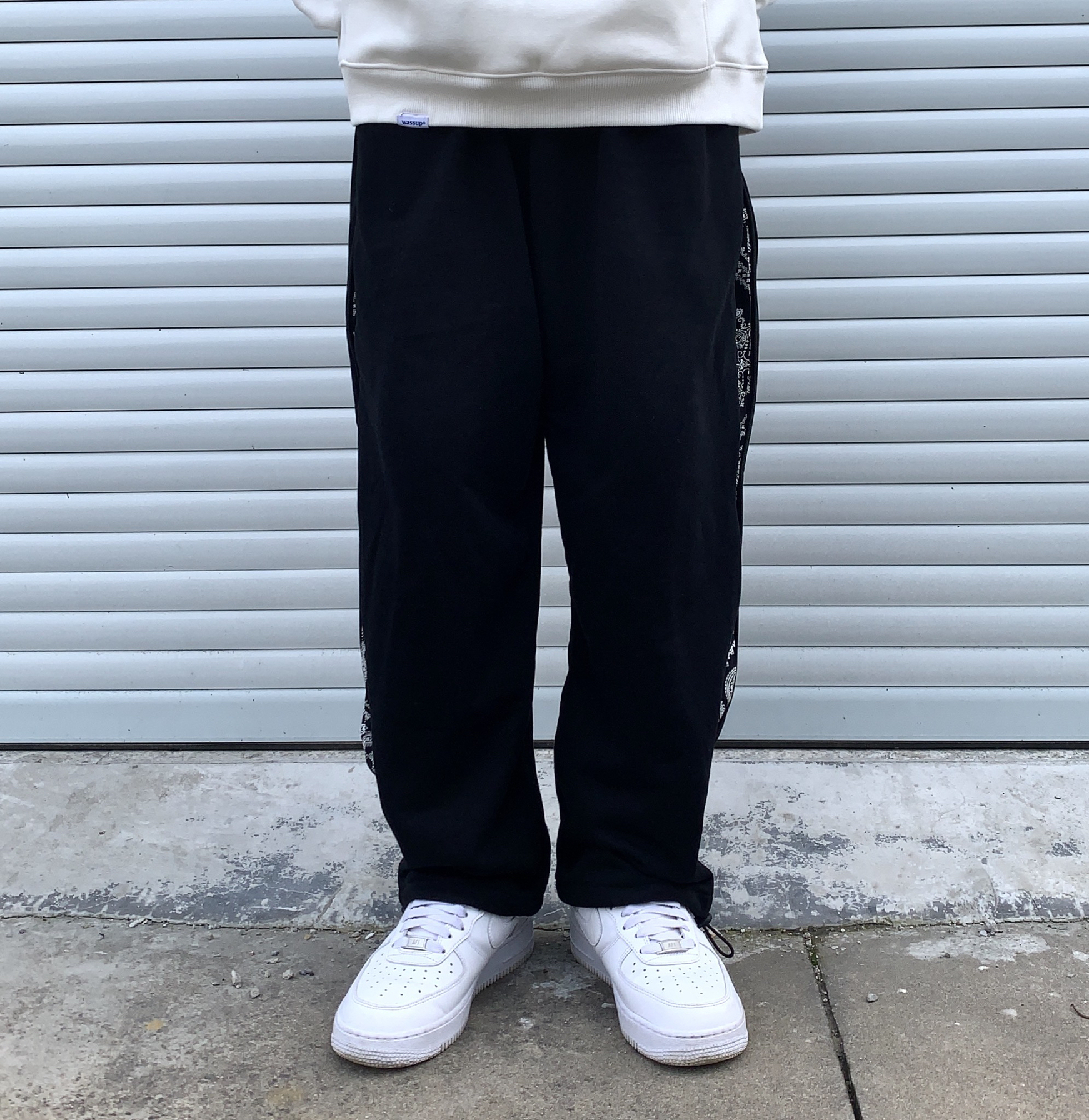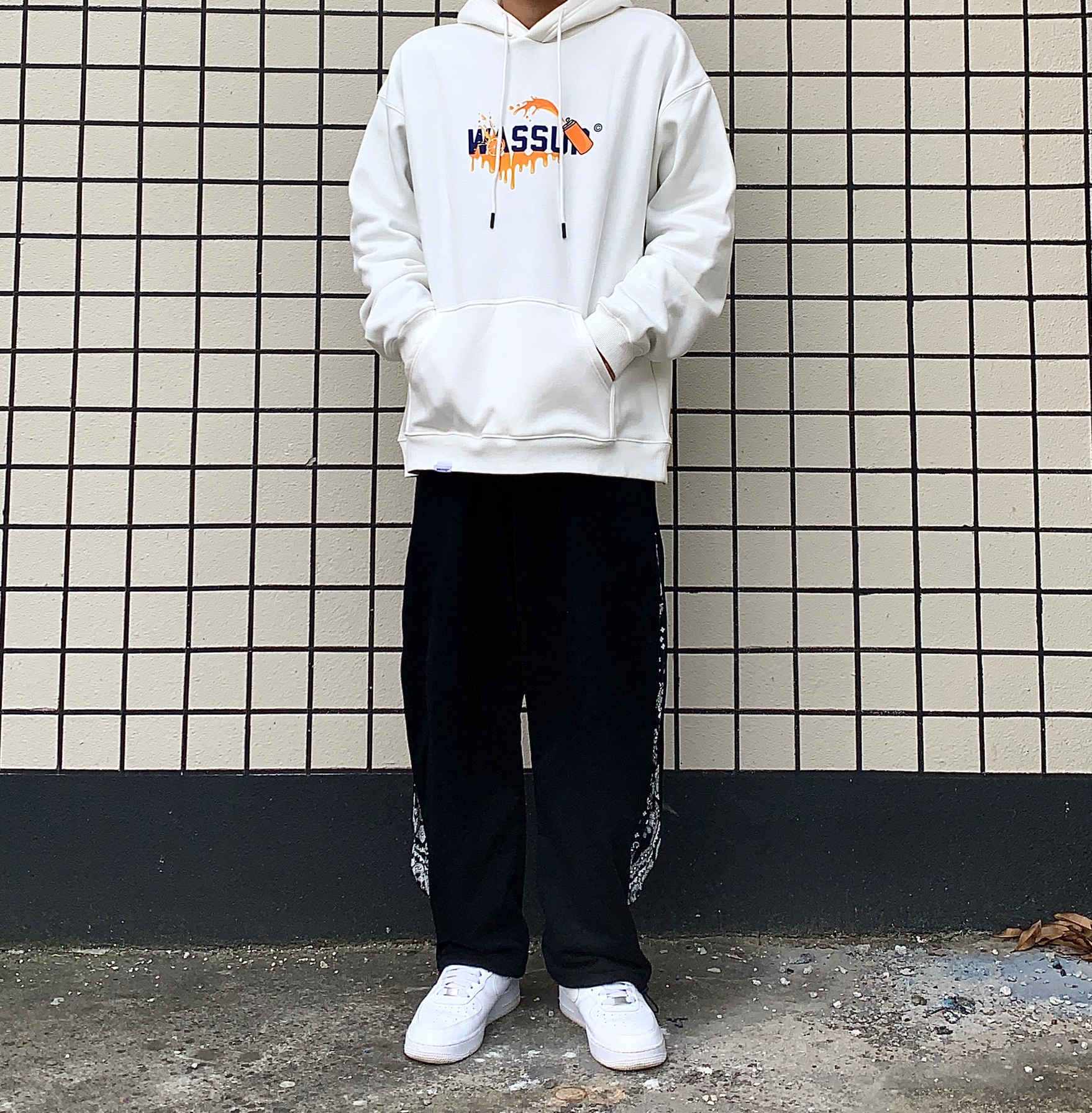 👔:WASSUP 👖:ICEREVERIE 今天带来一套黑白穿搭 白色卫衣是加绒的 用料很足 质感很棒 秋天单穿 冬天作为内搭套在羽绒服里面也很不错 袖口有wassup小标 系列很到位 裤子是拼接腰果花拉链直筒抽绳束脚裤 侧边腰果花可以通过拉链拉开显示出来 也可以拉链拉上 作为一条纯黑卫裤来搭配 两种风格随意切换 设计的别有用心 裤脚抽绳设计 可束脚 可直筒 这样一条裤子就可以穿出四种不同...