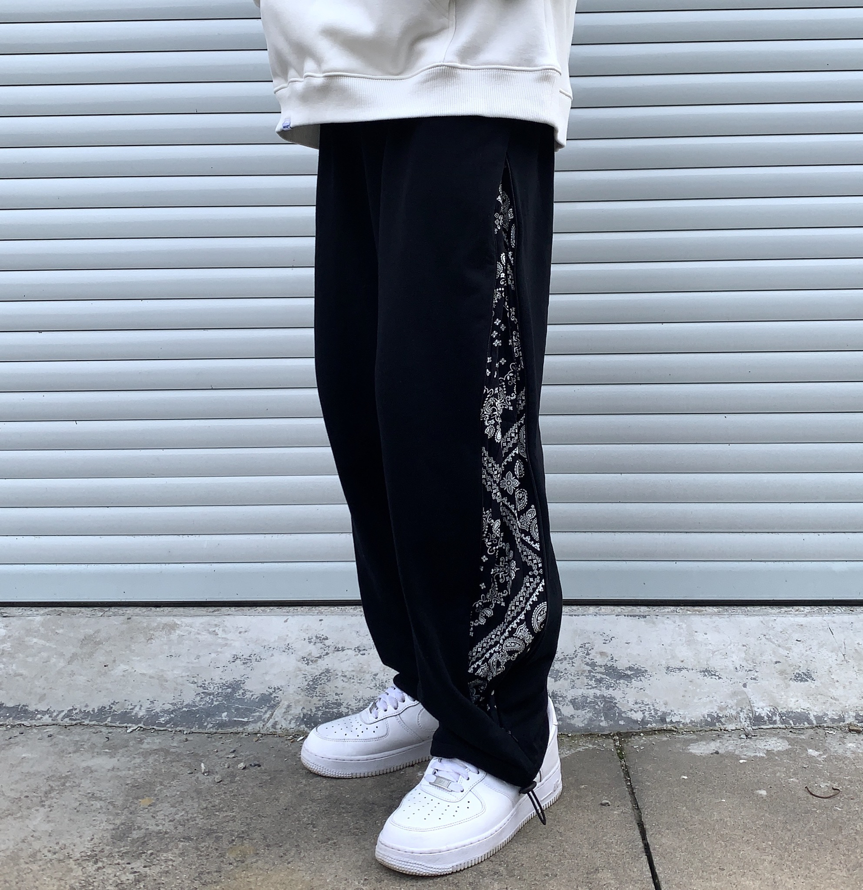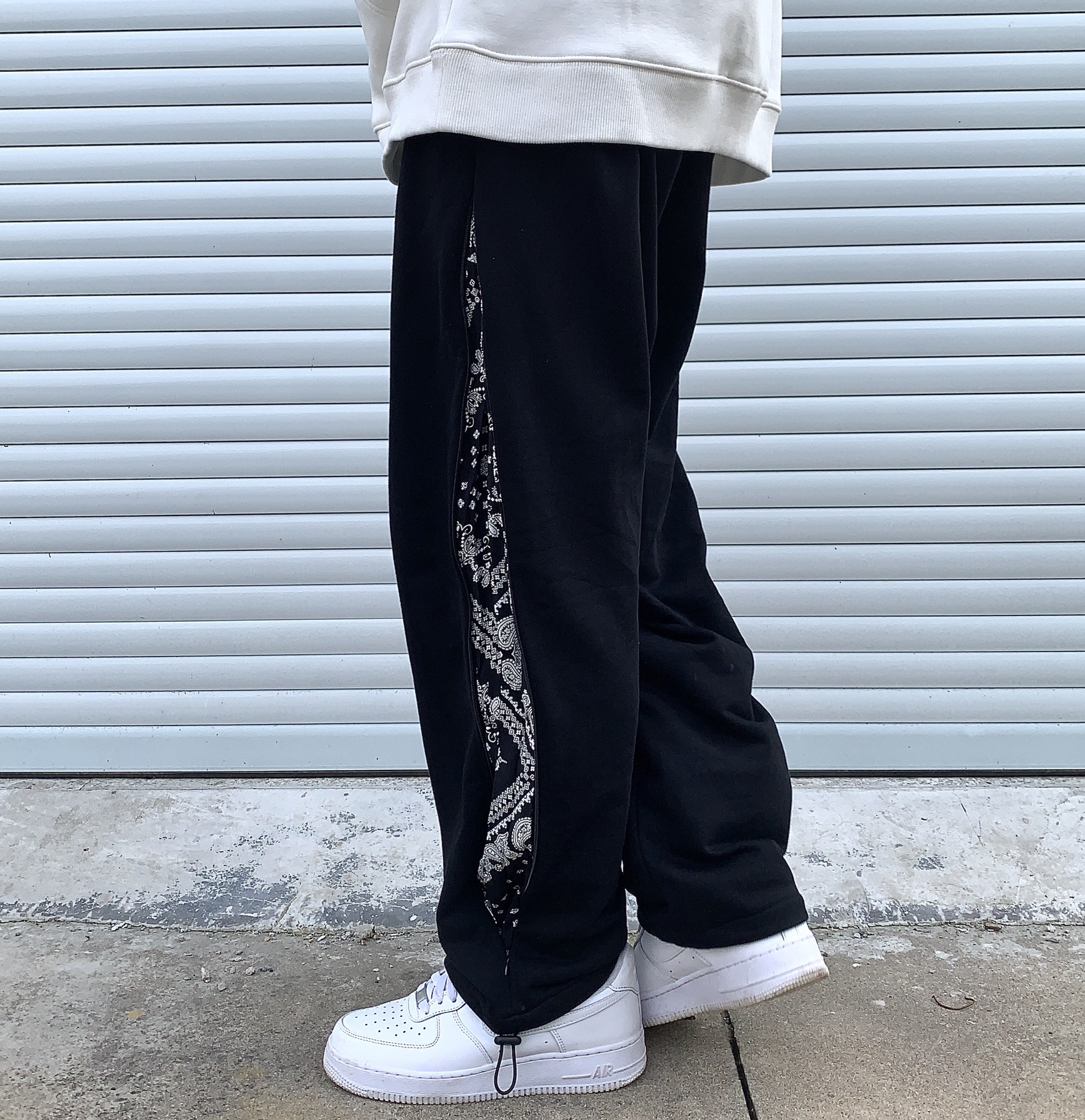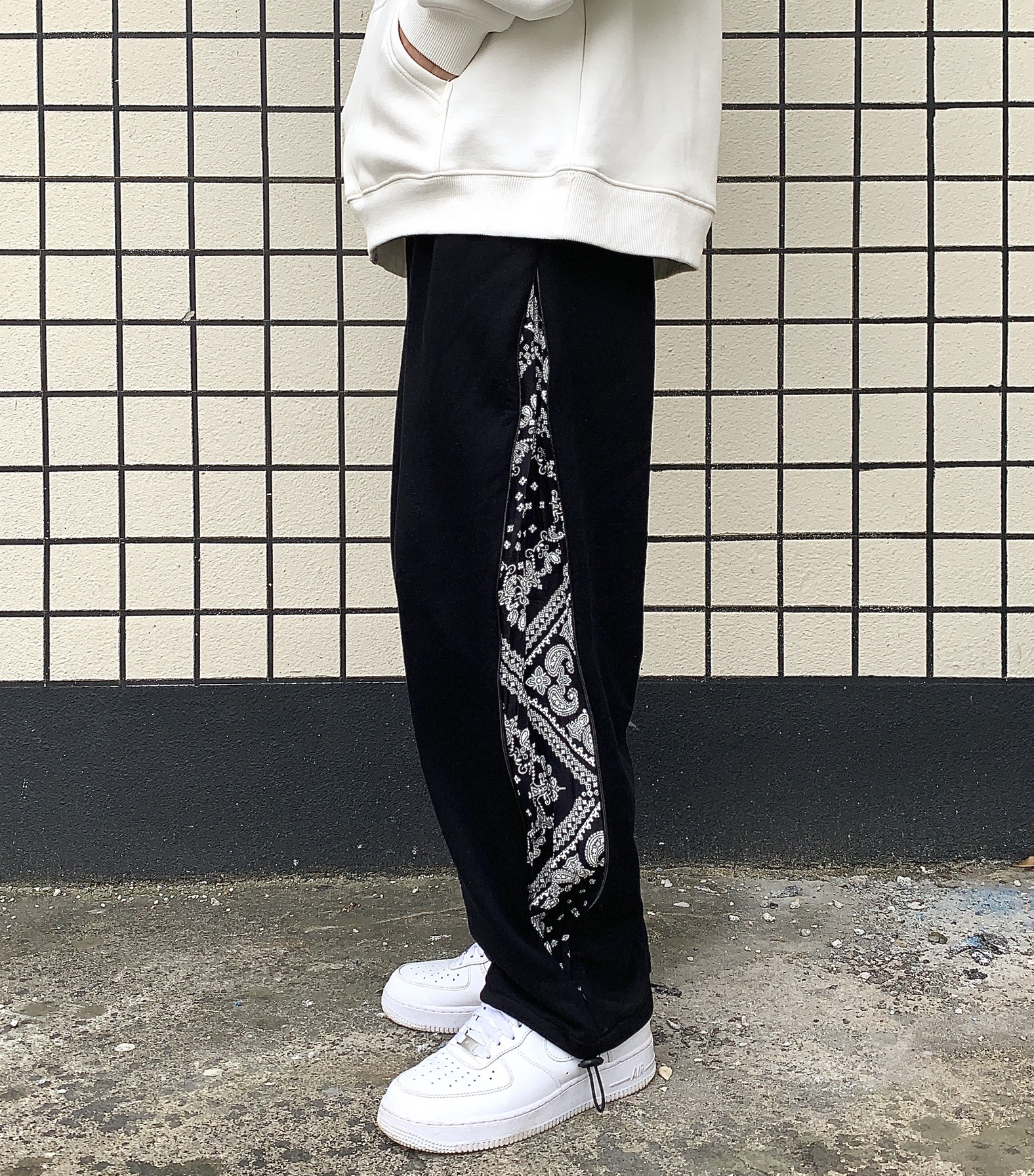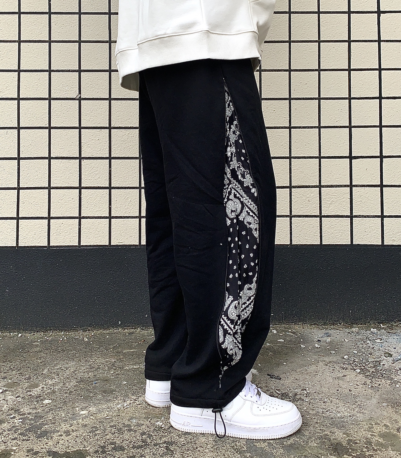 👔:WASSUP 👖:ICEREVERIE 今天带来一套黑白穿搭 白色卫衣是加绒的 用料很足 质感很棒 秋天单穿 冬天作为内搭套在羽绒服里面也很不错 袖口有wassup小标 系列很到位 裤子是拼接腰果花拉链直筒抽绳束脚裤 侧边腰果花可以通过拉链拉开显示出来 也可以拉链拉上 作为一条纯黑卫裤来搭配 两种风格随意切换 设计的别有用心 裤脚抽绳设计 可束脚 可直筒 这样一条裤子就可以穿出四种不同...