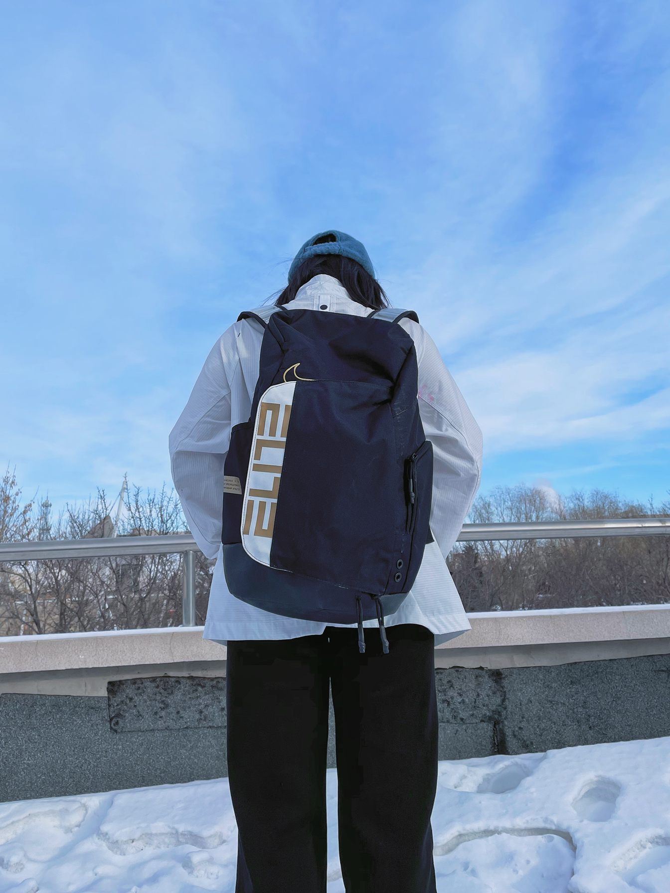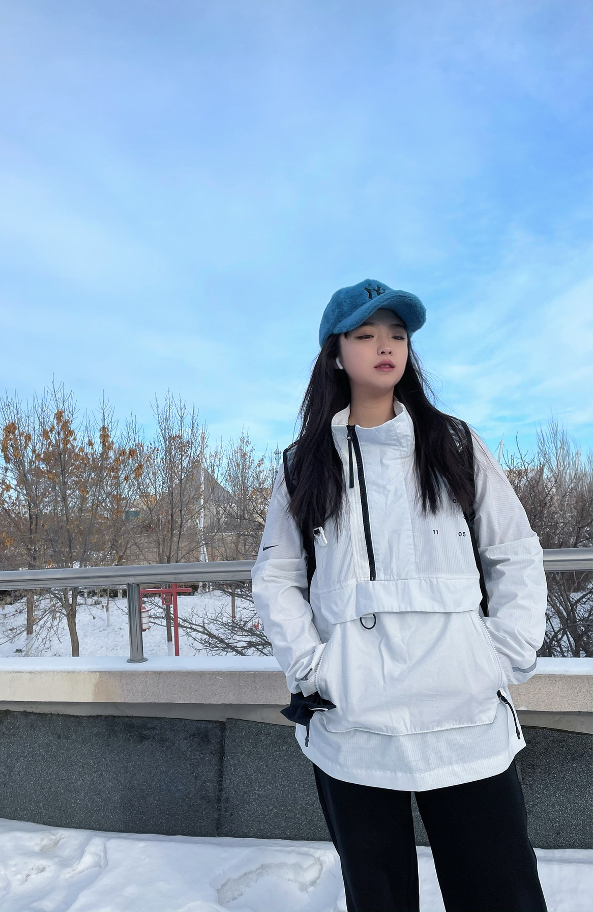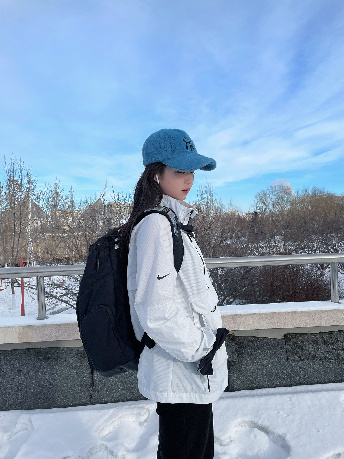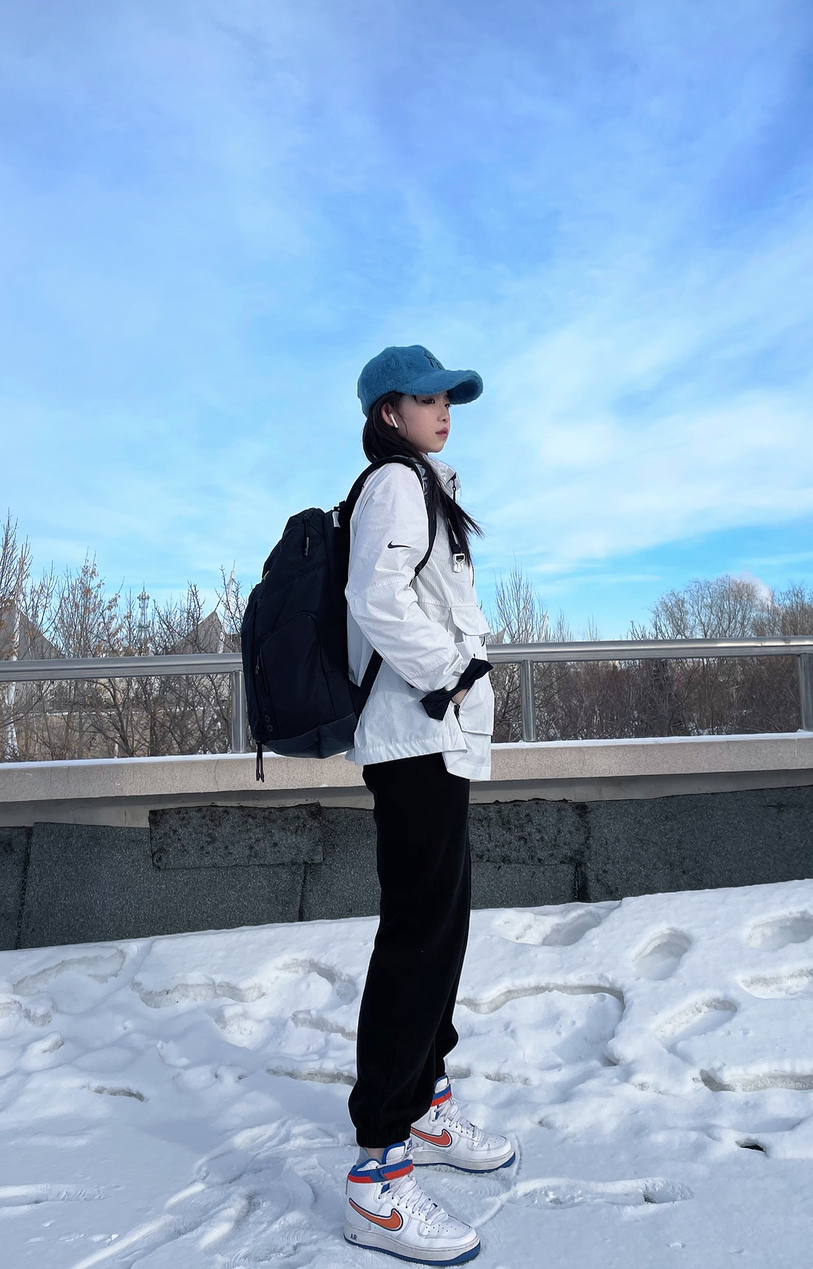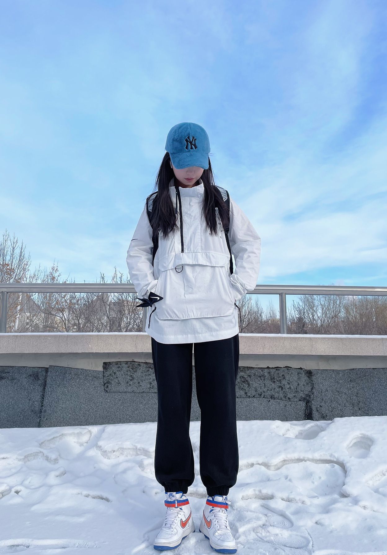 🎩:mlb毛绒款 👔:冲锋衣-NIKE王一博同款立领拉链上衣 羽绒服-Adidas 👖:美伢fuzzykon 👟:AIR FORCE 1 HIGH NBA 尼克斯联名 🎀:NIKE蝴蝶结发带
