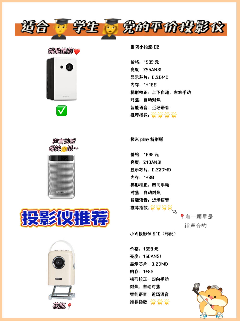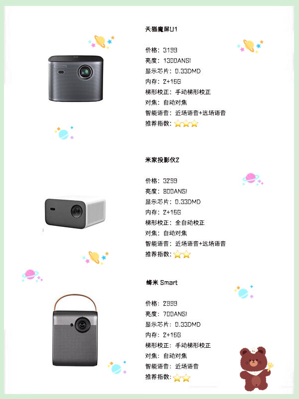 我收集了1⃣️5⃣️款3000元💰左右的热门🔥投影仪,分别从亮度、显示芯片、内存、梯形校正、对焦、智能语音等几方面来比较 💜 接下来,我们慢慢地分析: · 从图片上,我们看出3000元💰价位的投影仪大部分用的显示芯片是0.33DMD的,所以在这个价位显示芯片小于0.33DMD的不❌推荐购买 · 显示芯片是0.33DMD的有11款(如图),这些进行亮度💡对比,有些亮度高,但梯形校正不是自动是👋手动,...