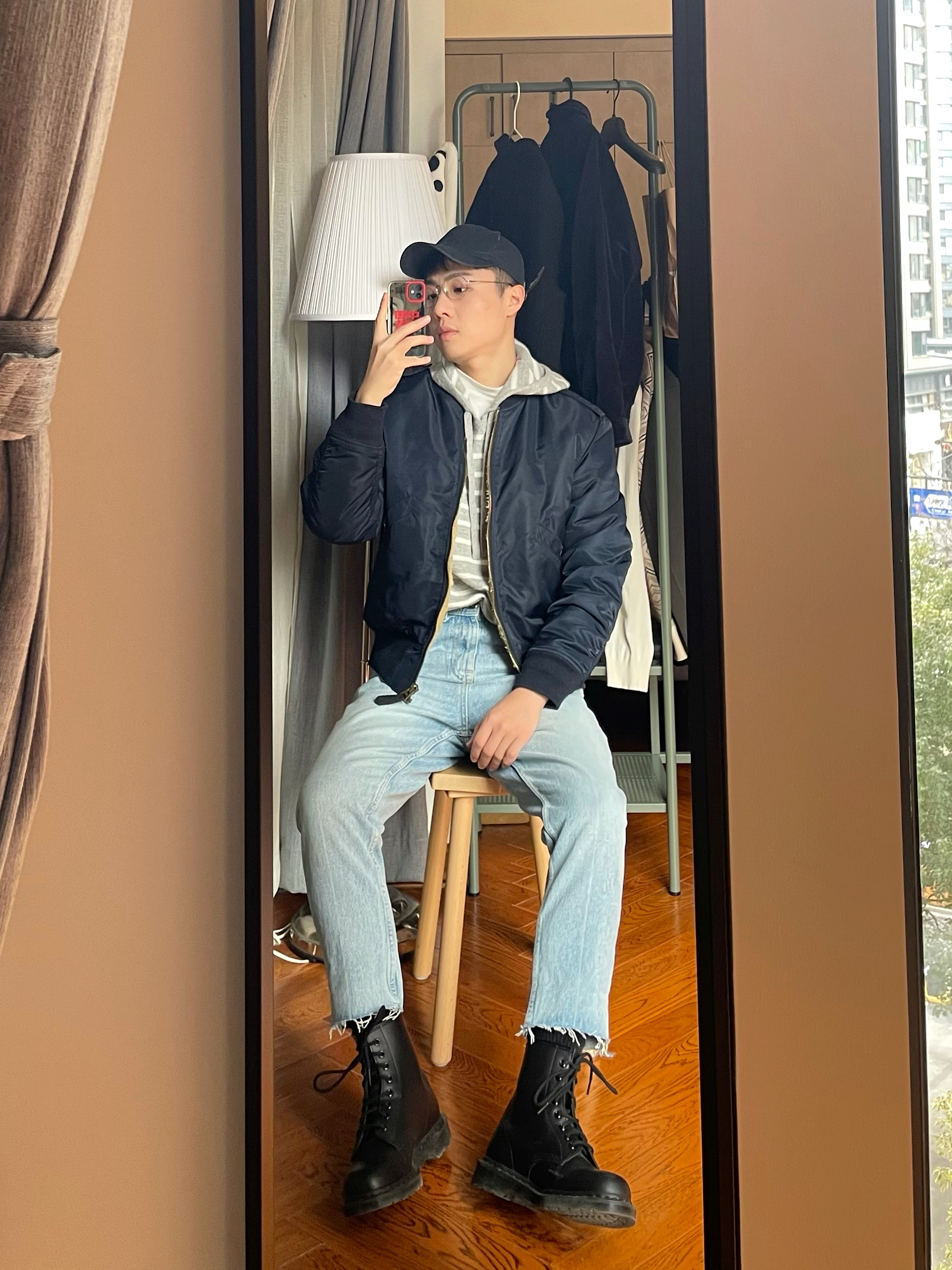 ➡️脚踝决定了温度下限,冬天一双长筒靴是一定要的,既能保暖又能凹造型。考虑到黄色走线的马丁靴实在太常见了,我特意买了黑色走线的纯黑款,果然没有挑错。百搭又低调。刚买回来穿着有点磨脚,不过穿了两周就比较跟脚了,跟鞋子也是需要培养感情的。 🧥外套是前两年买的sandro,里面有一层厚厚的长绒毛,非常保暖。 🧶内搭是Uniqlo的条纹针织衫,在冬天清一色的神色外套之中,一件条纹衫显得年轻有活力。
