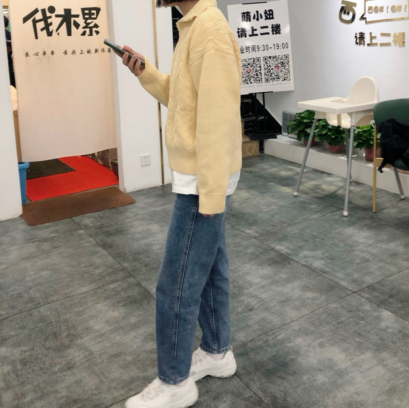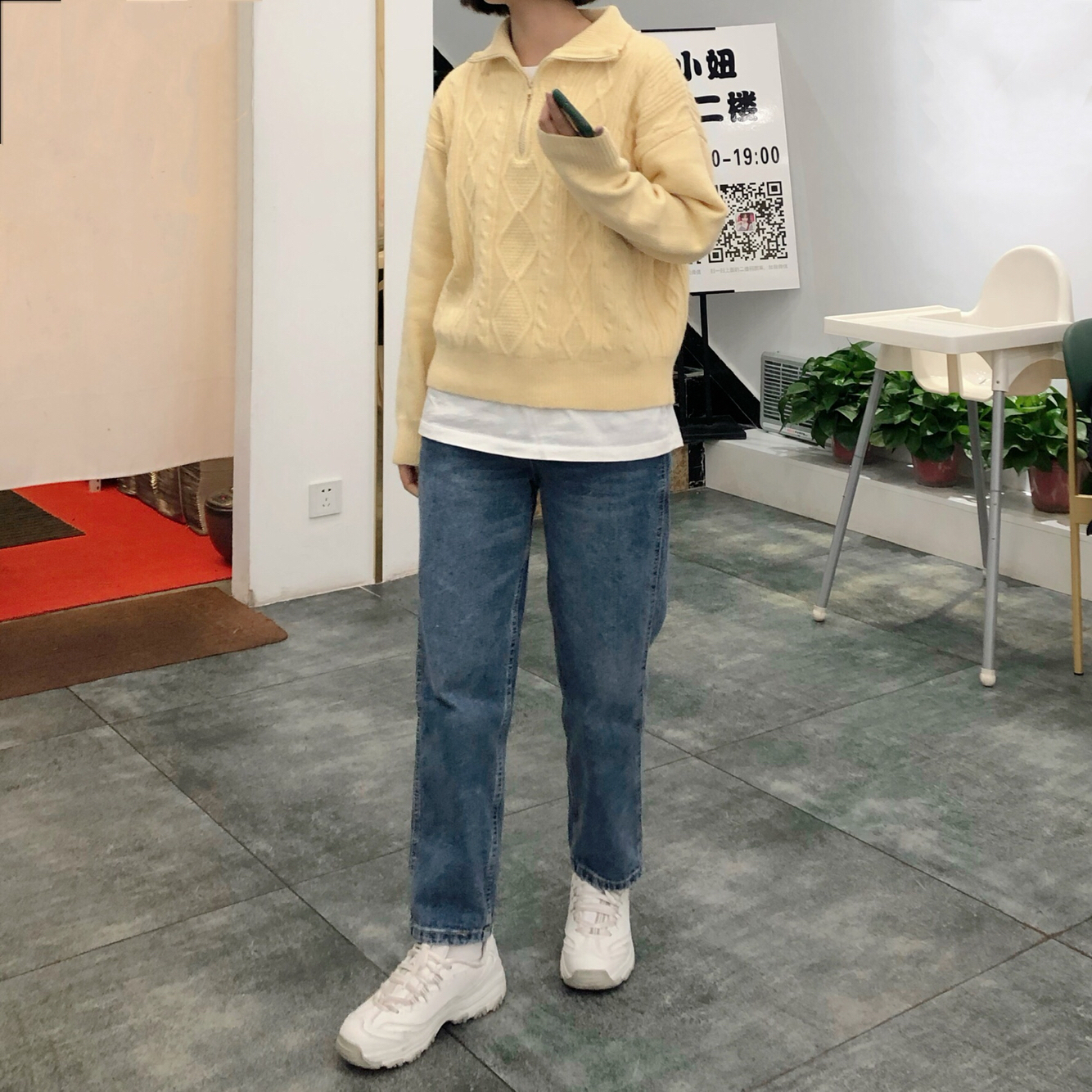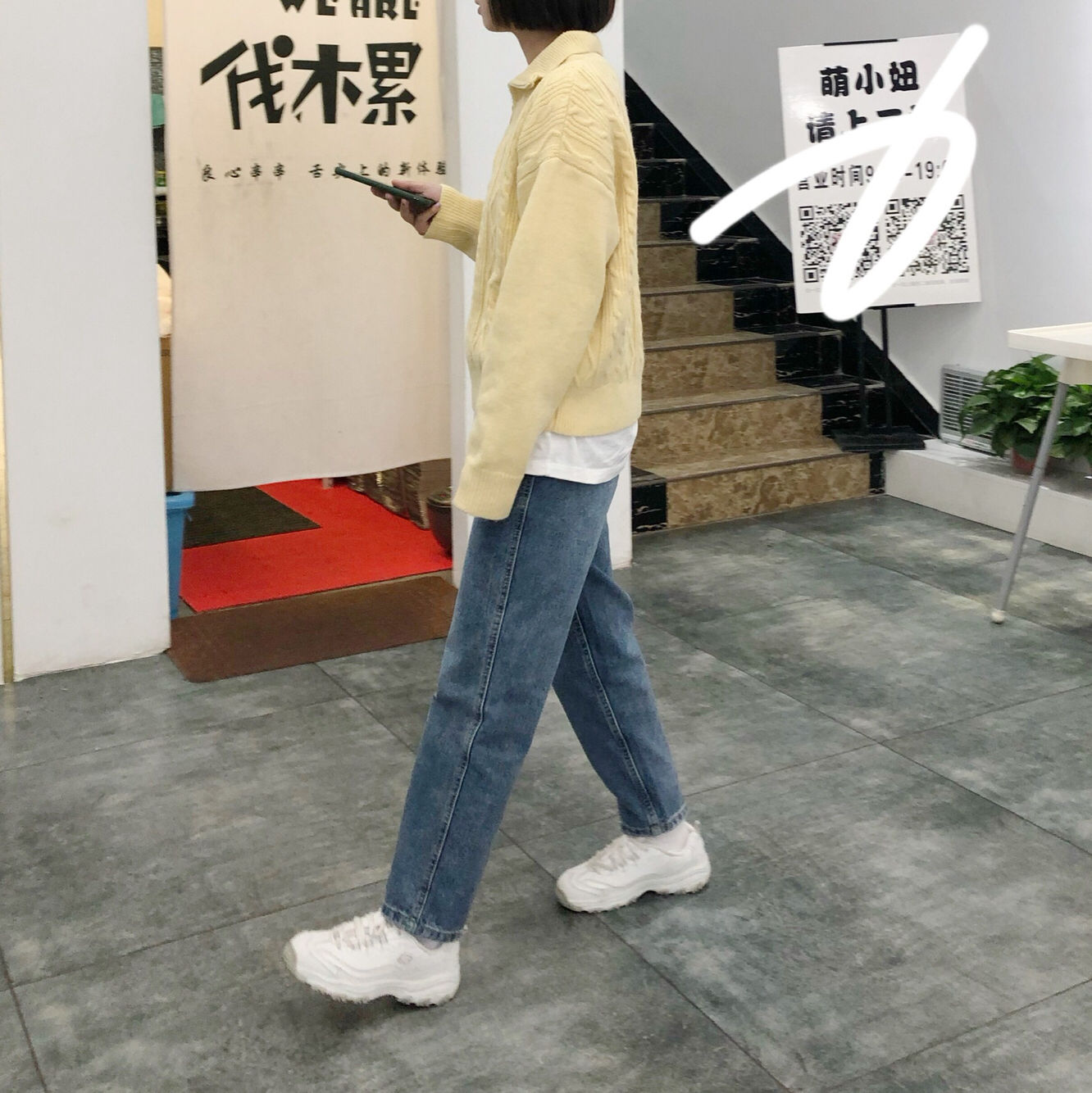 👔:不油 👖:不油 这家的衣服这么爱了!上身超级韩,颜色是奶油黄色,秋冬内搭超级吸晴,版型也很奈斯。 👟:斯凯奇 小个子女生必备啊!真的太显高啦!纯白色真的超级爱!