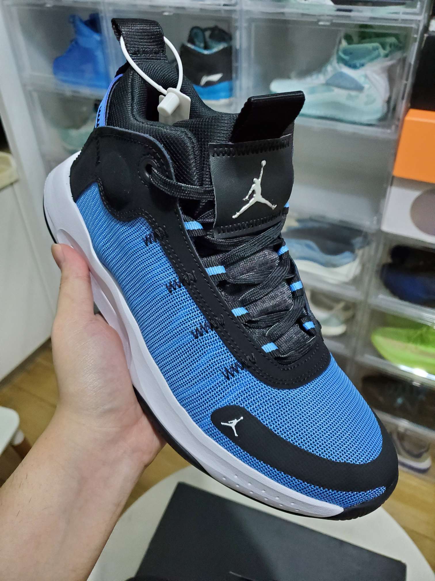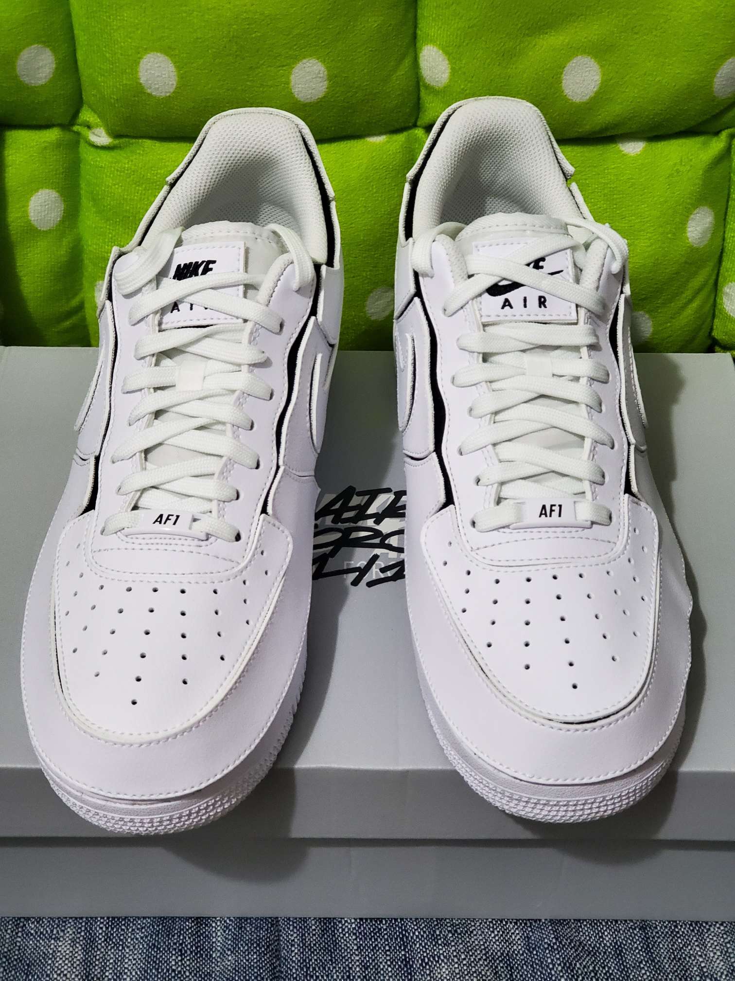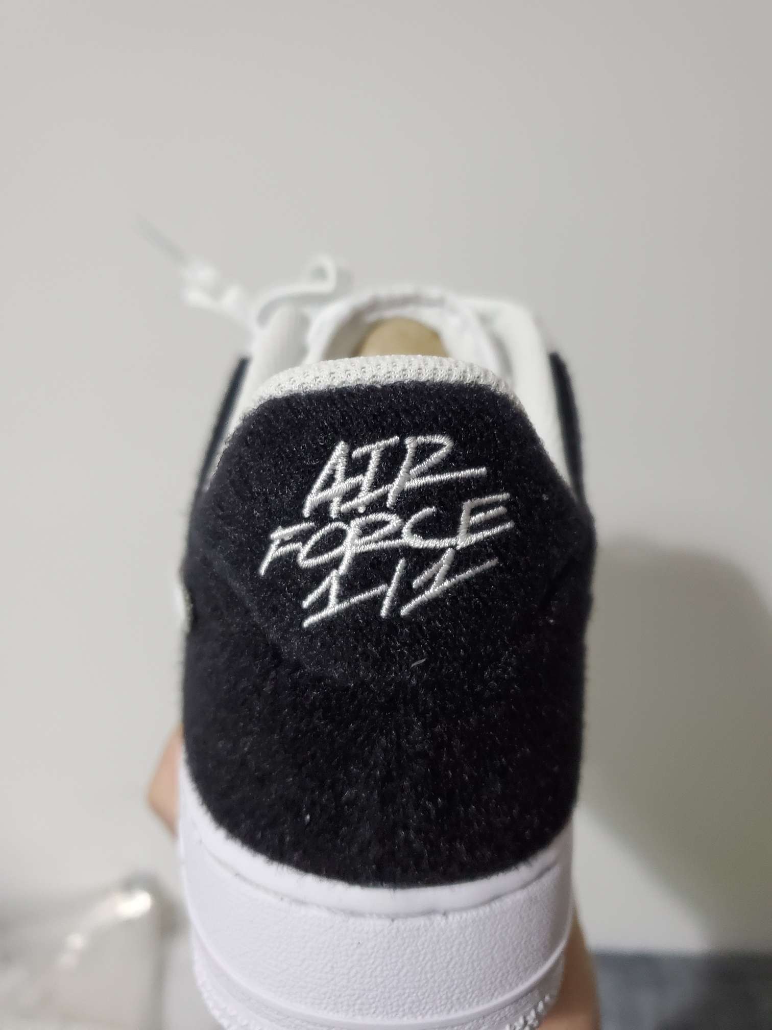 这是一双可玩性不错的空军一号,999的发售价对应的就是可玩性,如果是喜欢质感的朋友可以Pass了,这双鞋的材质都是合成革,没有真皮,所以我本人也不是非常喜欢。 这款af1魔术贴的鞋盒比起其他普款af1的鞋盒稍有不同,区别在于盒盖上的logo上又多了一层黑色特殊字体的AIR FORCE 1/1特指此款鞋,而且鞋纸上也印有相同的字体内容。鞋子鞋面除去鞋带鞋眼片和鞋舌部分以外基本都是魔术贴的属性...