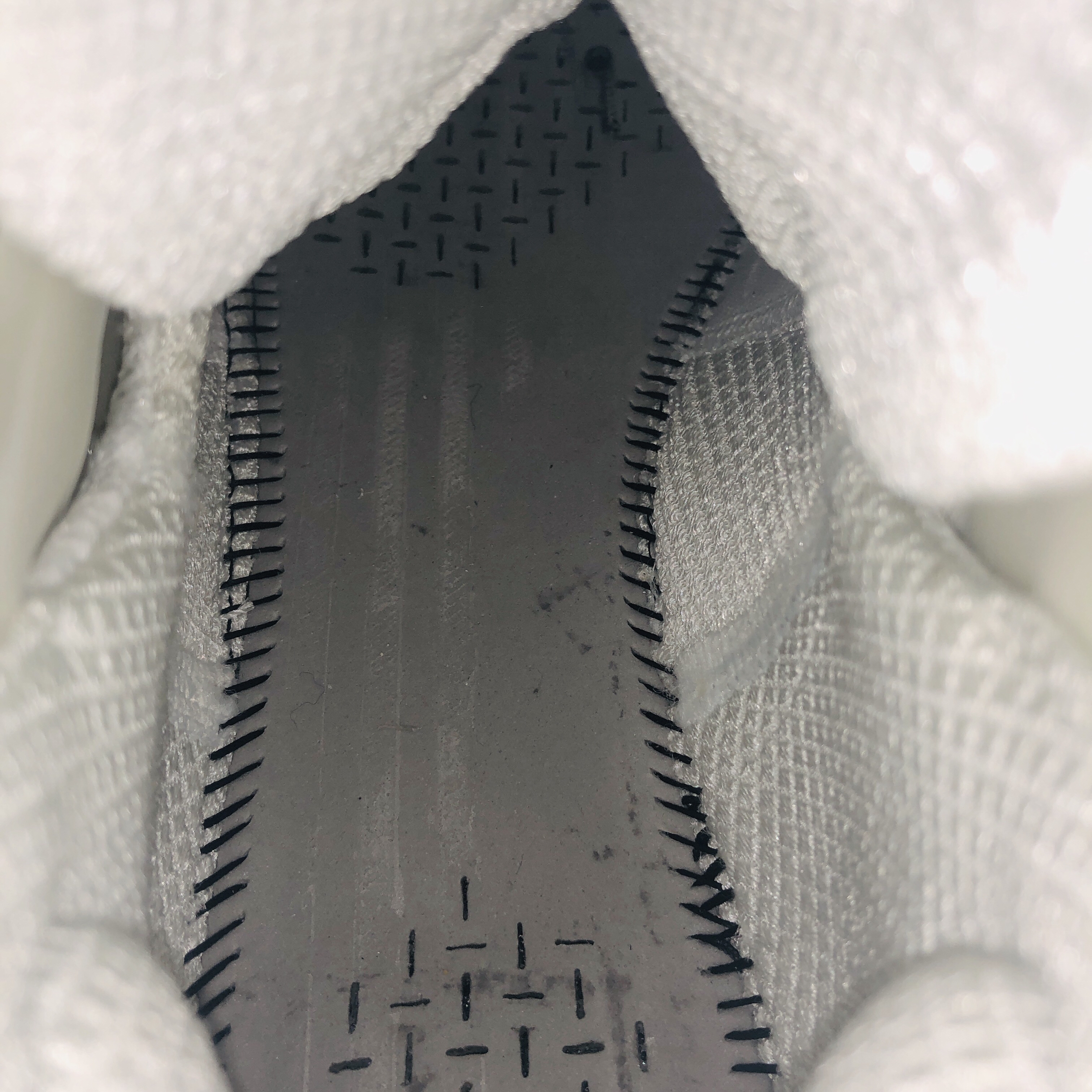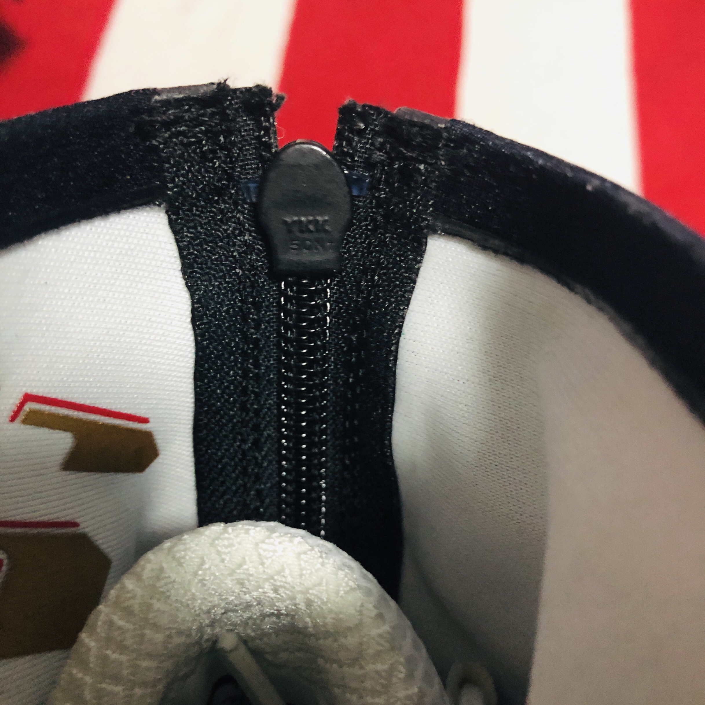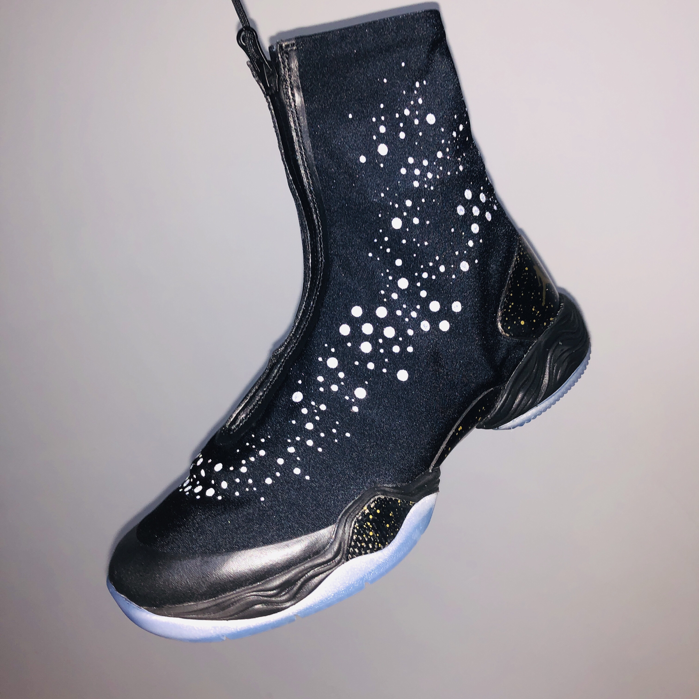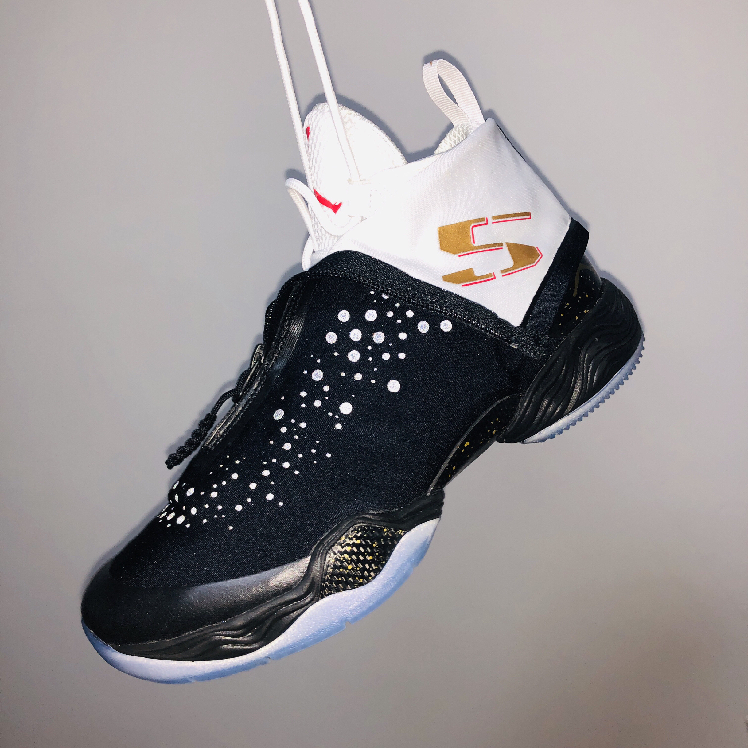 鞋面一共两层:外部高耸的YKK拉链鞋罩采用防水面料,内侧分别印有“9”和“5”,寓意雷阿伦那记三分之后的95平的比分,通体黑色的鞋身上印有3M反光点缀打开闪光灯十分惊艳。拉下拉链就能立刻化身成传统中帮球鞋,黑白配色一前一后颇有黑脚趾的意味~