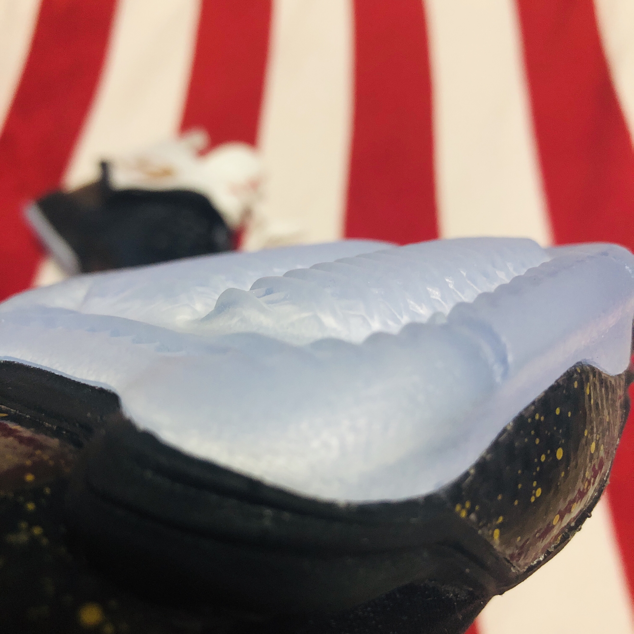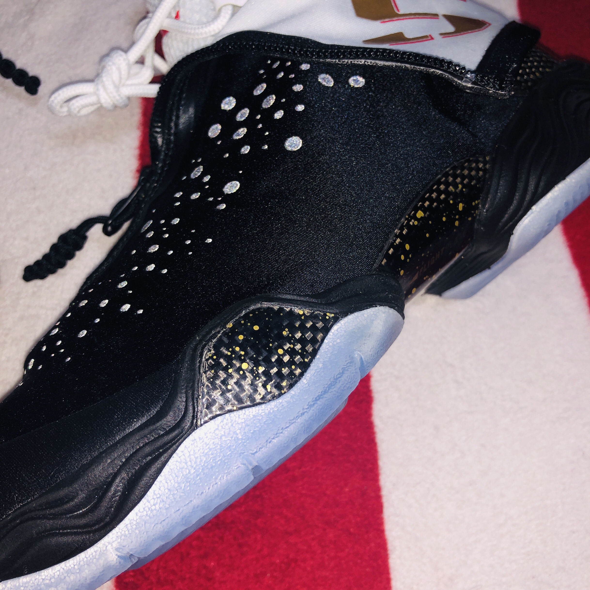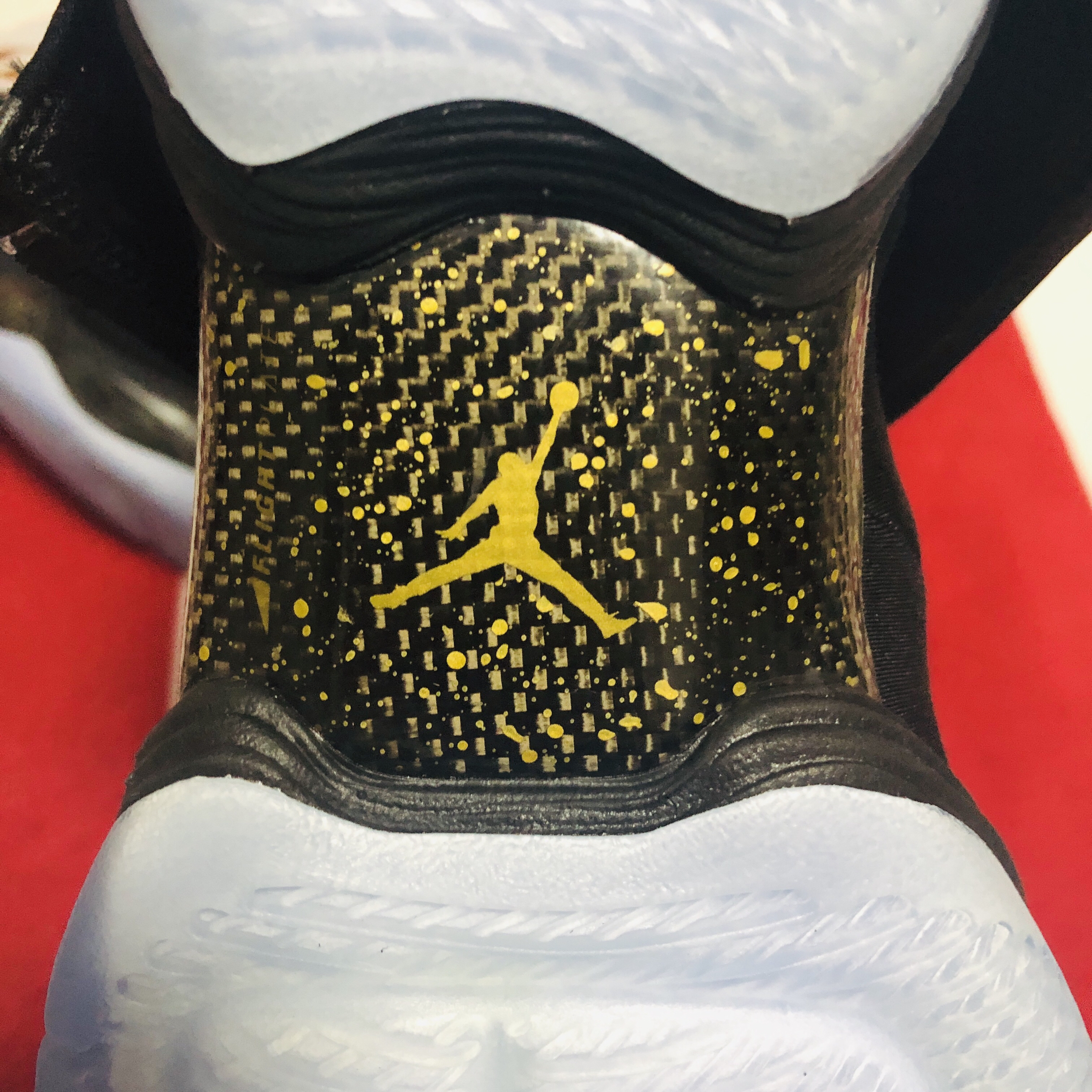 作为AJ2012之后重新回归正代的第一双,它的登场近乎完美,前后掌分离的phylon框架搭载flightplate作用在前掌肌肉饱满的分室zoom上为穿着者带来前所未有的澎湃脚感,后跟容量可观的马蹄形zoom缓震体验一度超过了双层zoom的喷泡。史无前例的五块碳板针对不同区域精准补强,PU中底布着力区上的几何纹理冲孔为气垫释放更多形变。