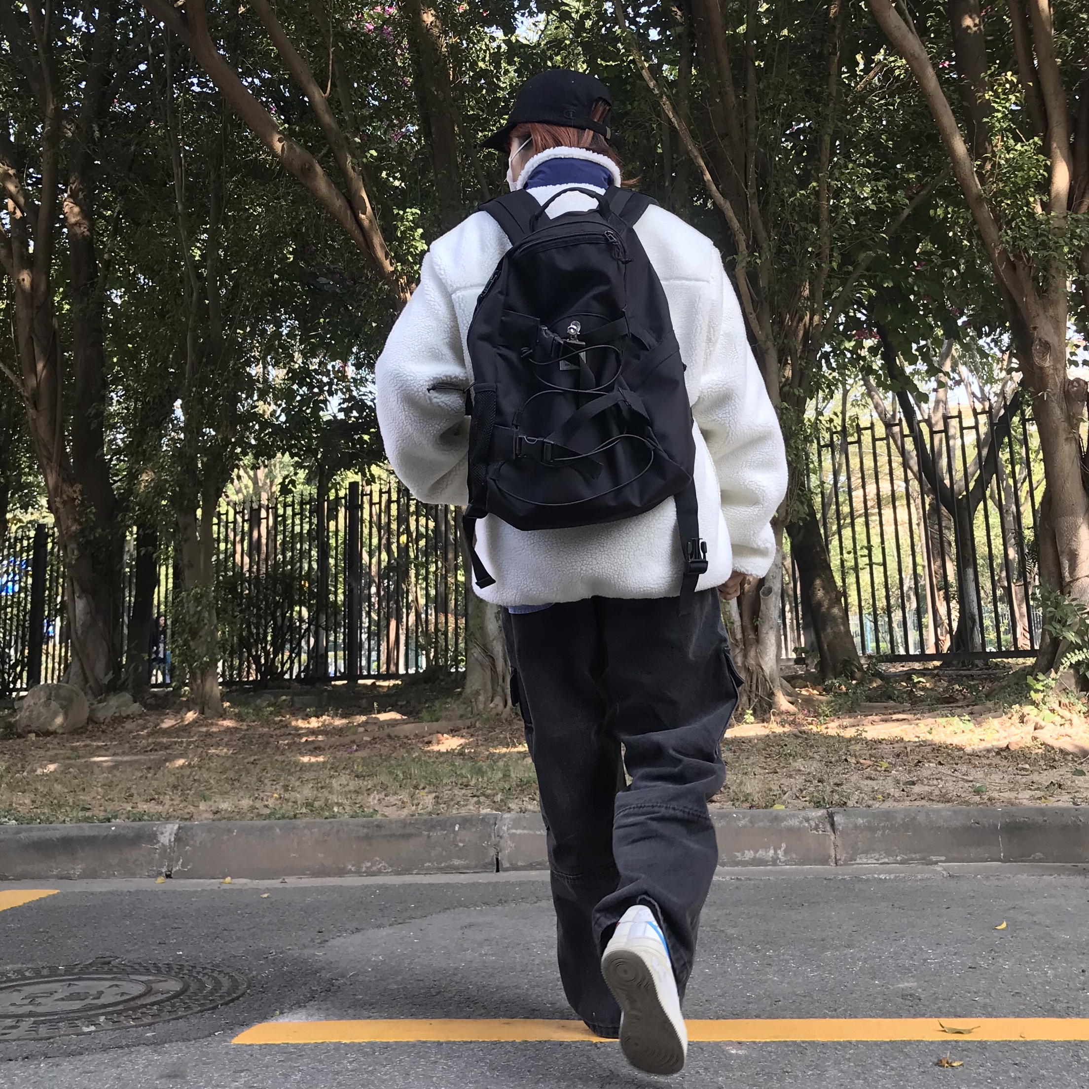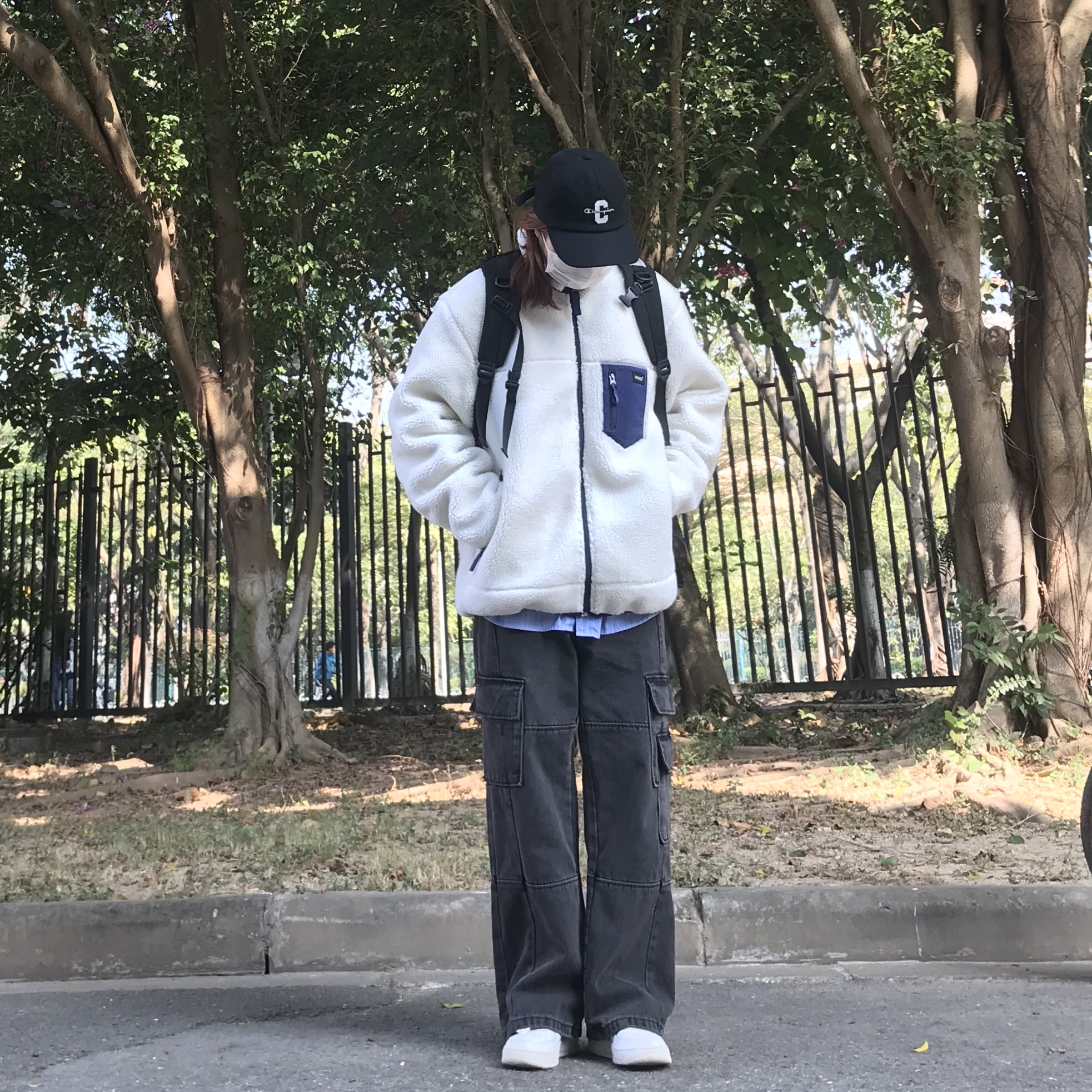 衣服👔|buttbill 鞋子👟|air force 1 帽子🧢|champion 摇粒绒外套真的是很暖和,冬天穿上它里面穿的很少也不会冷,但是唯一的缺点就是容易显得臃肿。这件摇粒绒来自逼格家,版型不错,胸前的贴布口袋和衣领的蓝色相呼应,非常和谐。内搭我也选择了一件蓝色衬衫与外套的蓝色相呼应。