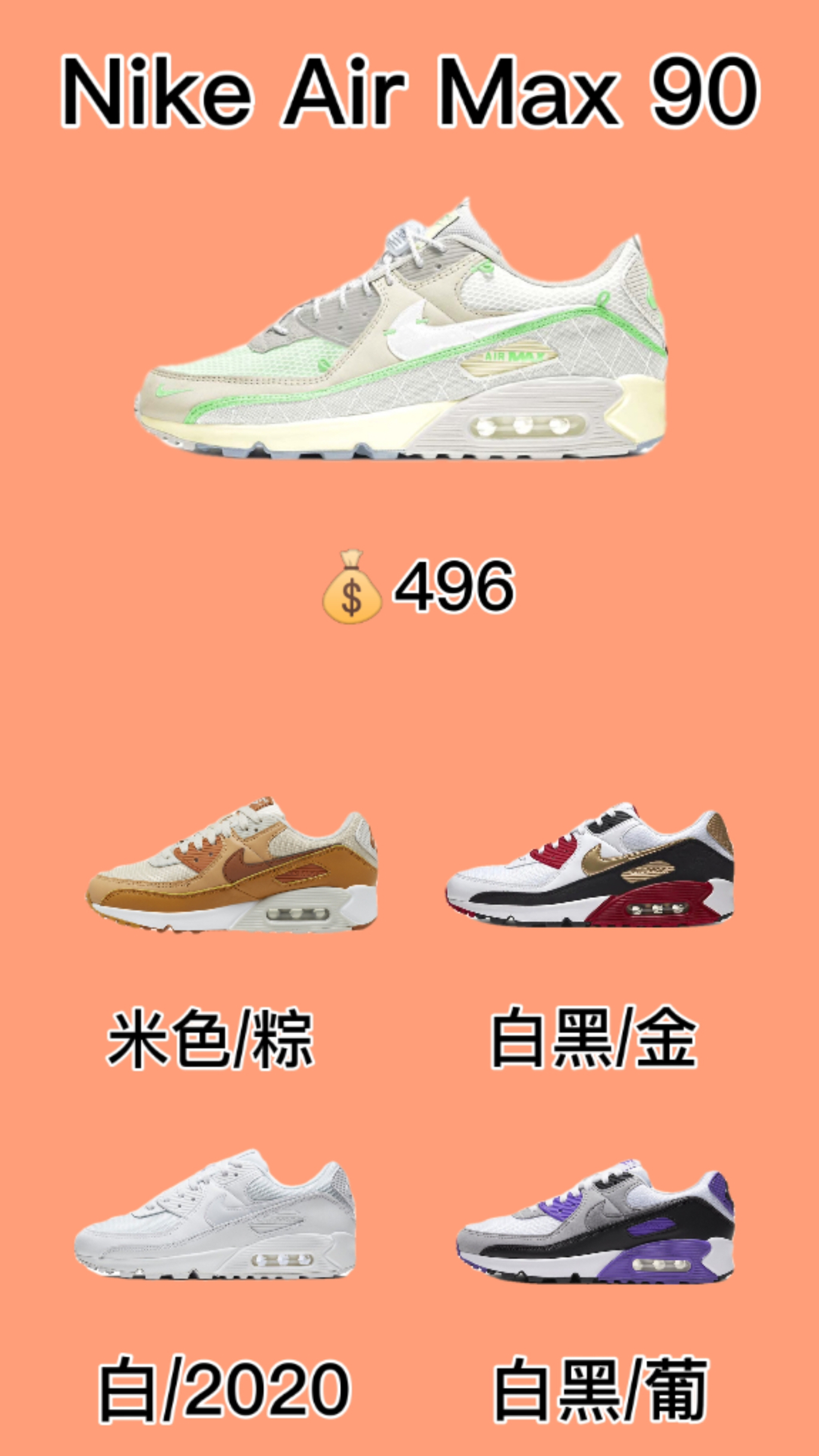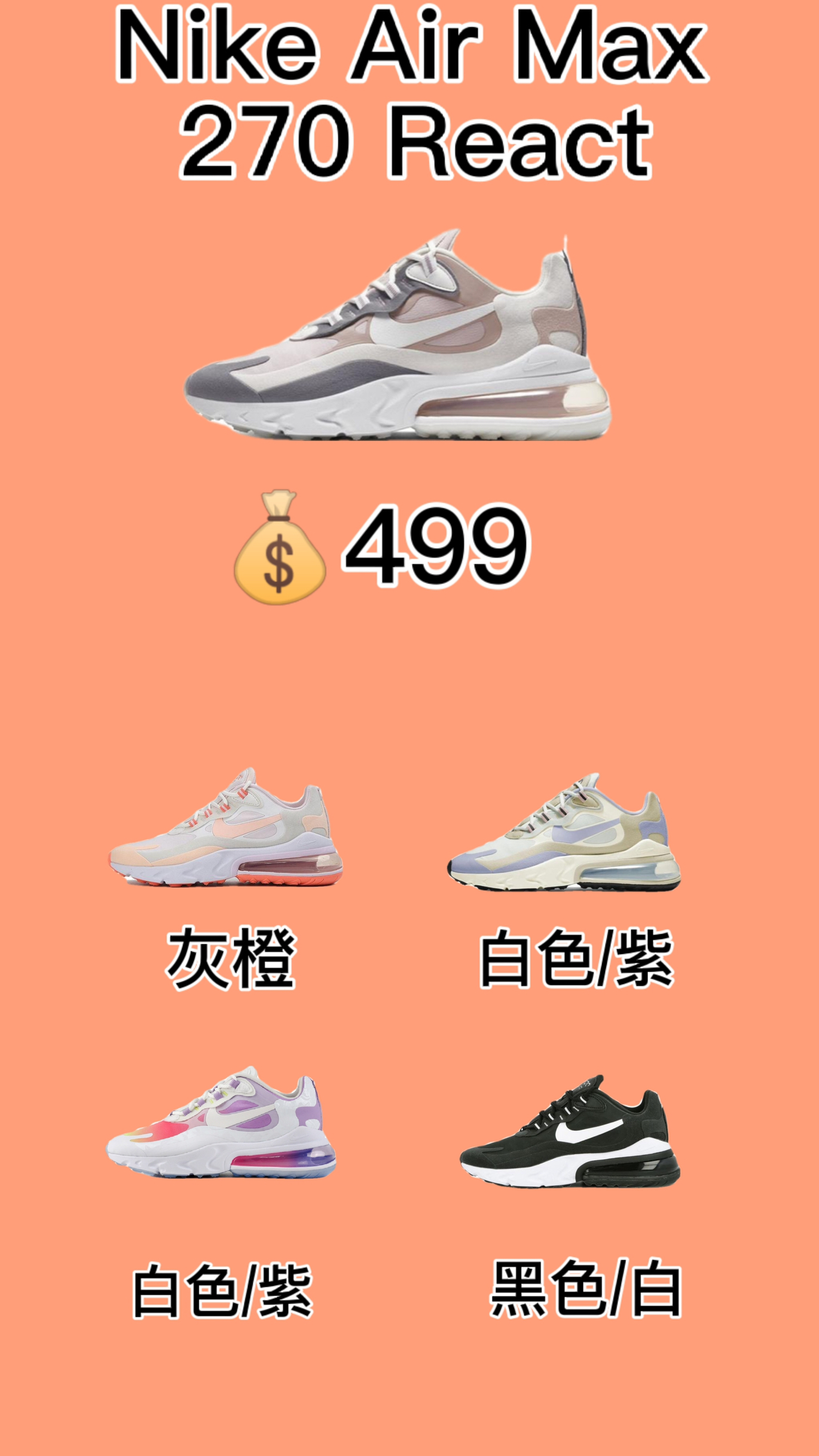 ☁️ ☁️ 每一个成功的跑步人背后都少不了一双好的跑鞋,本期小编就给大家推荐几双好看又实用的跑鞋吧! ①Nike Air Max90 全新配色日常运动鞋融合经典设计线条和丰富材质,沿袭元年款经典元素,焕新演绎出众外观,整体视觉表现活力满载,上脚效果满分! ②Nike Air Max 270 React 这款鞋在配色方面是大胆个性的鲜艳方案,多种色调的组合拼接,以白色、蓝色、红色以及亮黄色共同演绎,...