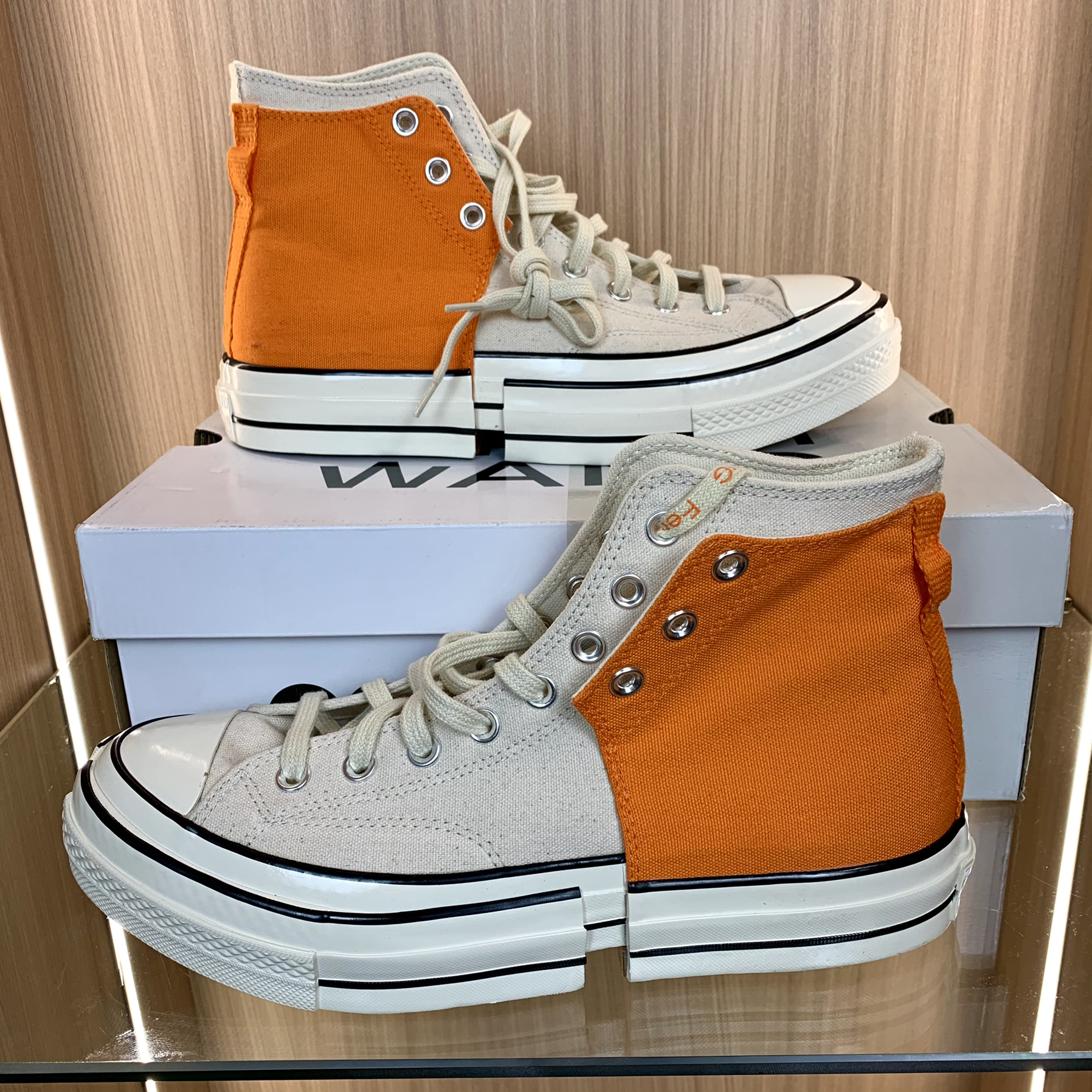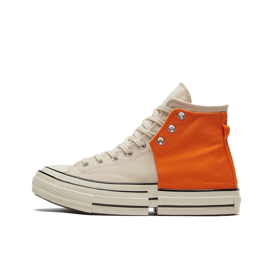 这款FENG CHEN WANG也是一款非常的不错的匡威鞋款了,以Chuck 70为基底打造的2款配色,概念为二合一。充分把玩解构设计,鞋头开口的鞋头包裹了鞋的外底,而类似结构的鞋跟则平衡了鞋的底脚。鞋子的外部零件可以绑在主孔眼中, 颜色方面,鞋子采用了米白色跟活力橙的颜色搭配非常的好看看,也很适合天气渐暖穿着,活力十足哦,中底也选用了白色的中底,颜色搭配非常的帅气,解构的大地让鞋子非常的增高...