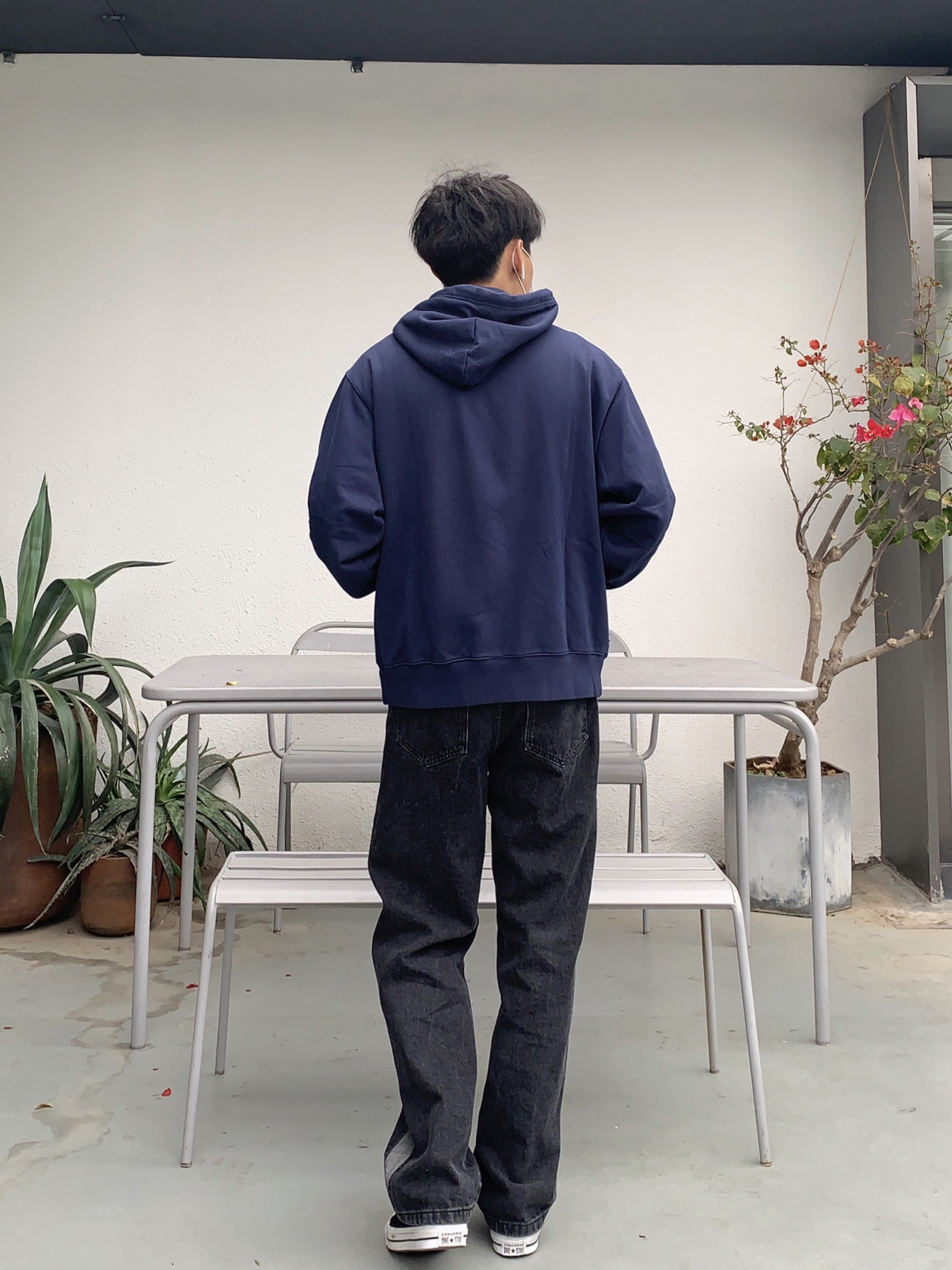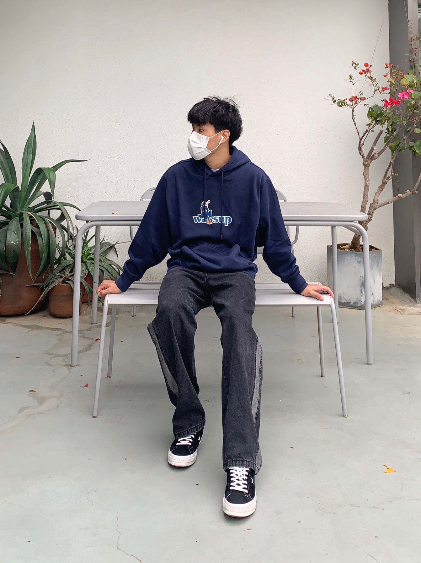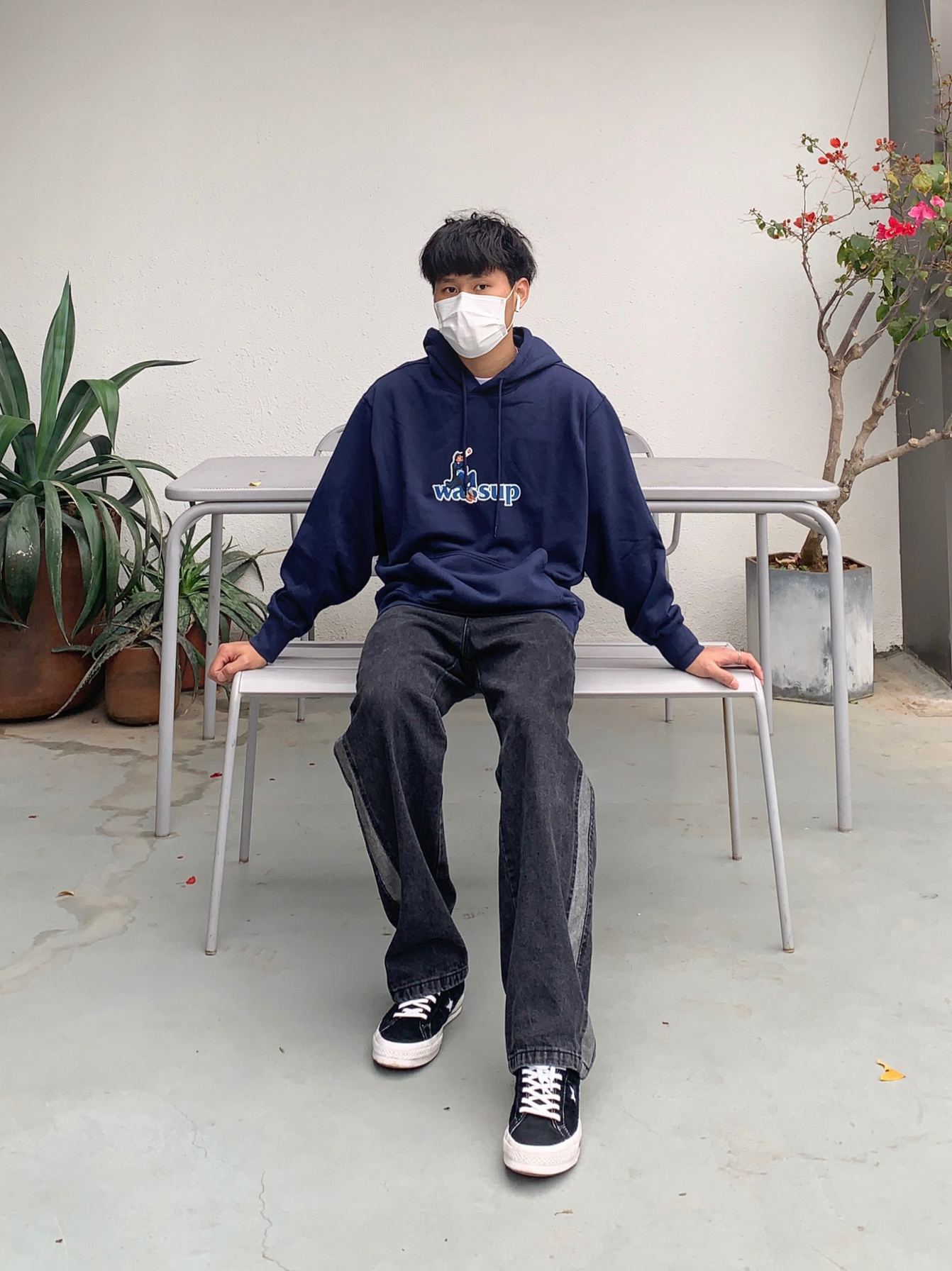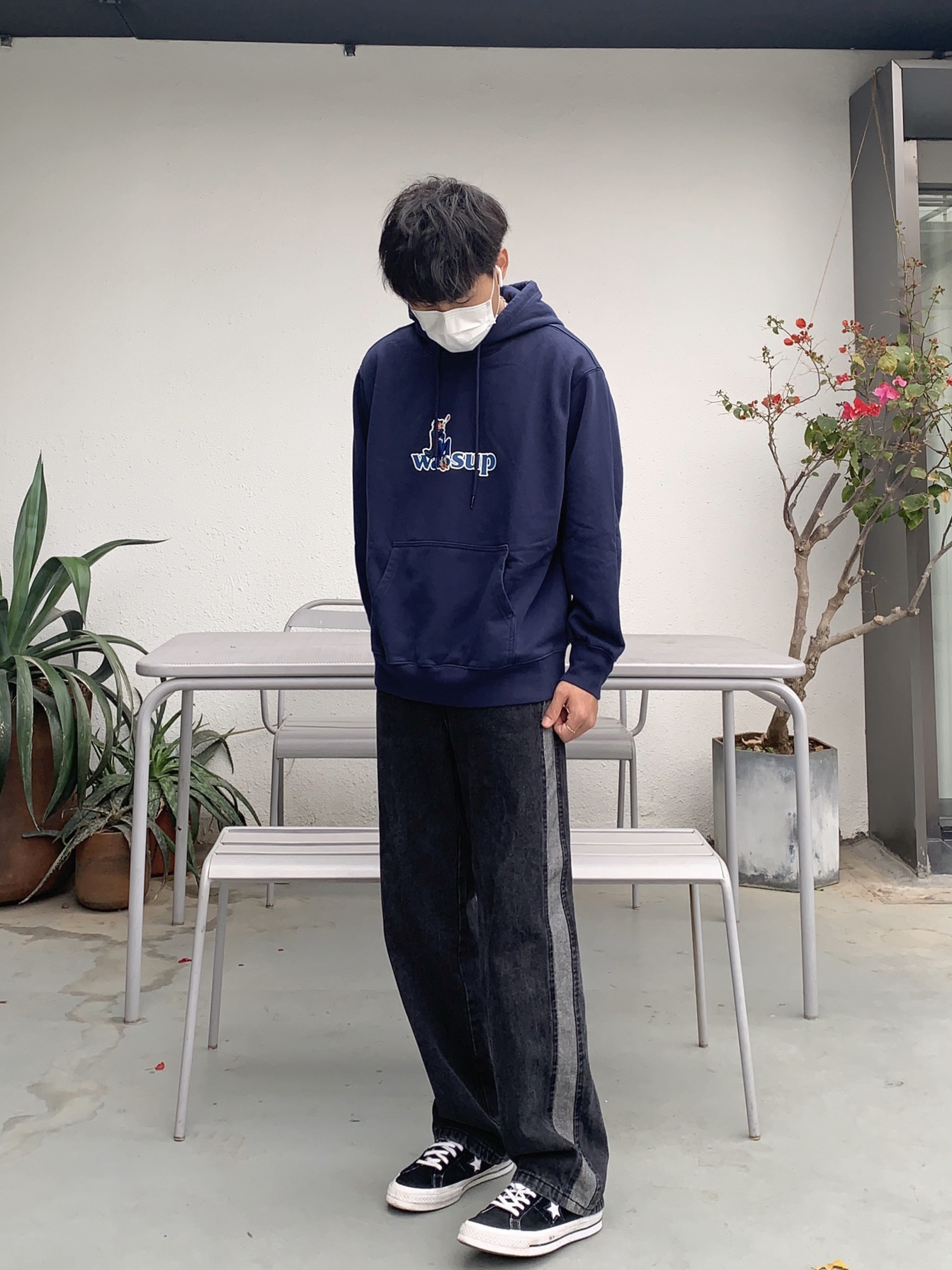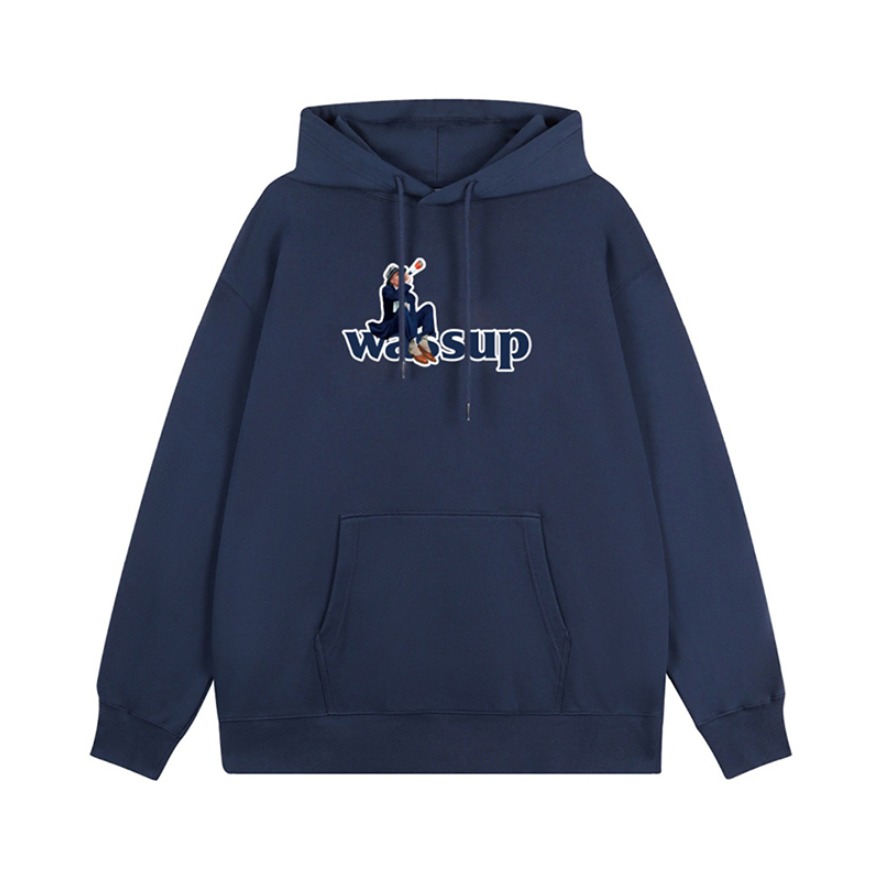 上衣:WASSUP 一件卫衣在秋冬是必备的!舒服的卫衣更不能少,卫衣前面有大大的英文字样logo印花!使其卫衣不单调!非常好看!卫衣采用藏蓝色系!颜色非常独特!小细节设计满满!卫衣版型宽松!适合潮搭! 裤子:M5is 水洗牛仔裤的做旧风格非常高街!设计很修长腿型,水洗色的色调,也非常酷!很百搭!高街的设计风格!使其裤子不单调! 鞋子: 匡威一星标 高街必备!百搭利器!很有高街感!