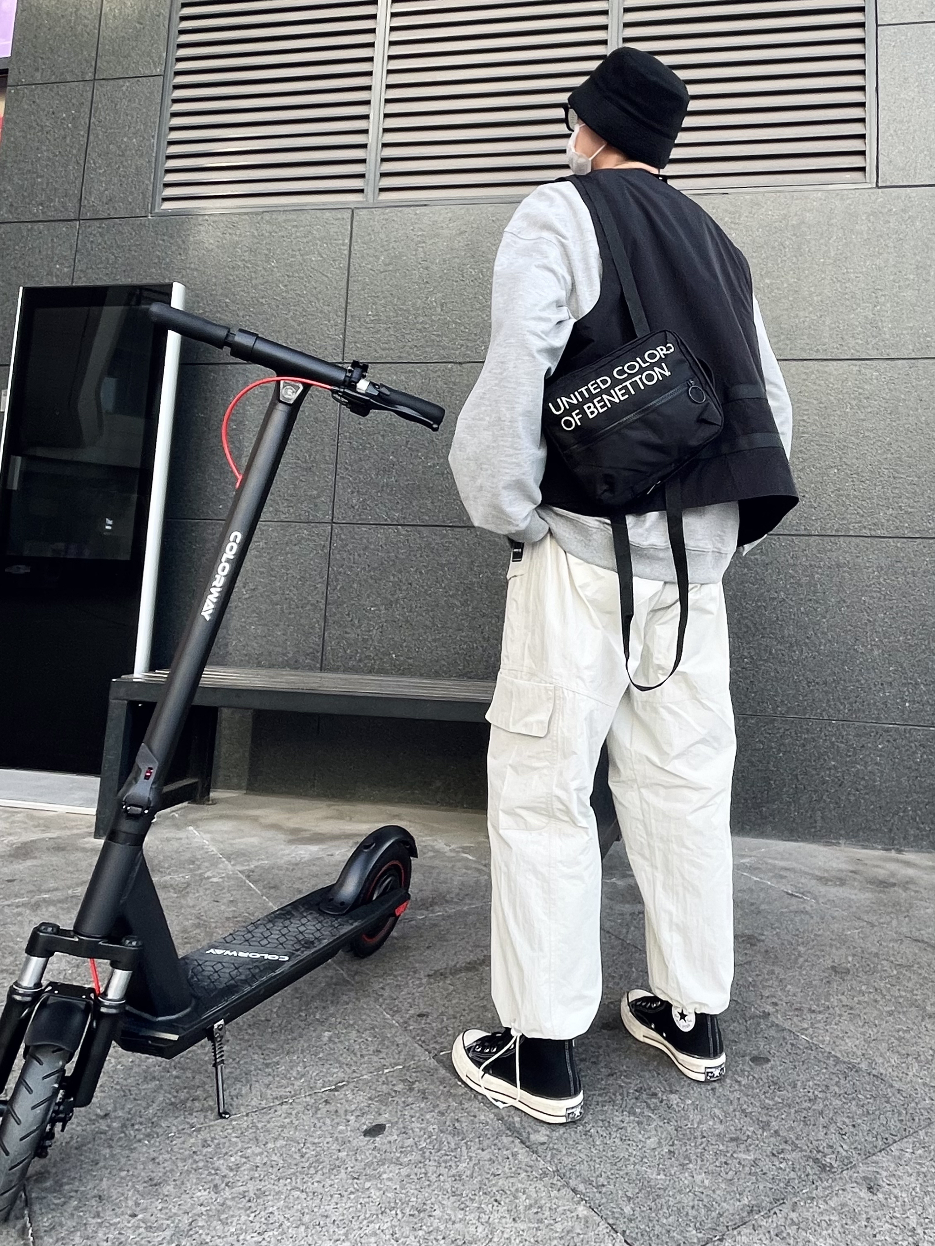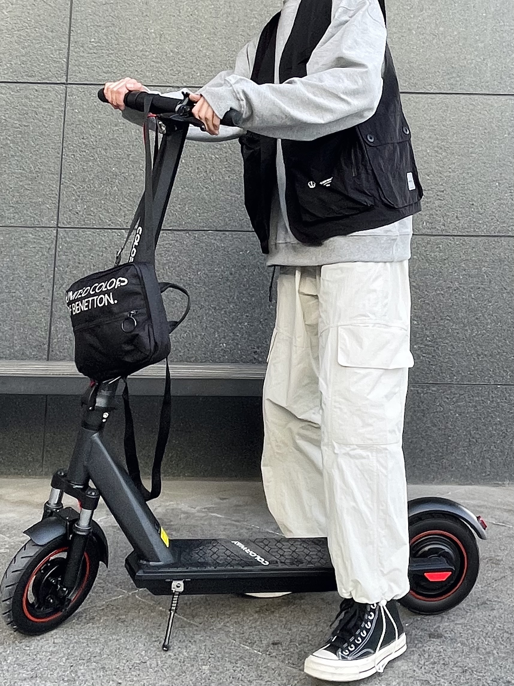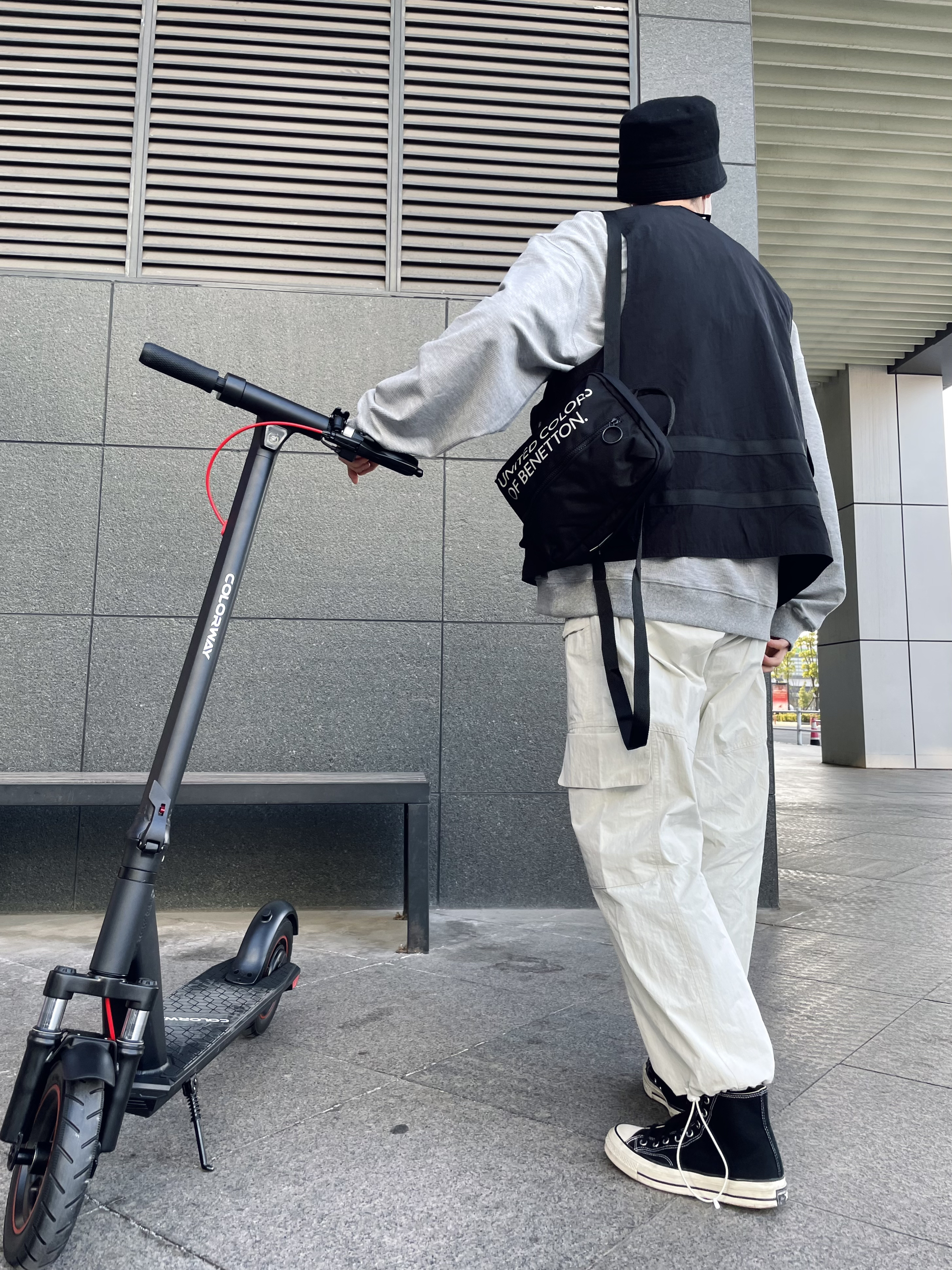🛴今天带新入手的科洛威滑板车出来兜兜风,当时就是看中了这款车的便携性才买的。折叠起来很轻松,而且能骑到电梯里直接到家,平时出门取快递买菜都🉑️ 还能app智能锁车很方便。 ▪️马甲 fromwrting字由 质感很不错的一件机能工装马甲,口袋带拉链,内搭T恤或者卫衣衬衫都很好看。 ▪卫衣 fromwrting字由 落肩版型的一件灰色卫衣,偏大一些 面料垂感很足,这种卫衣不挑裤子。 ▪️包包 #贝纳...