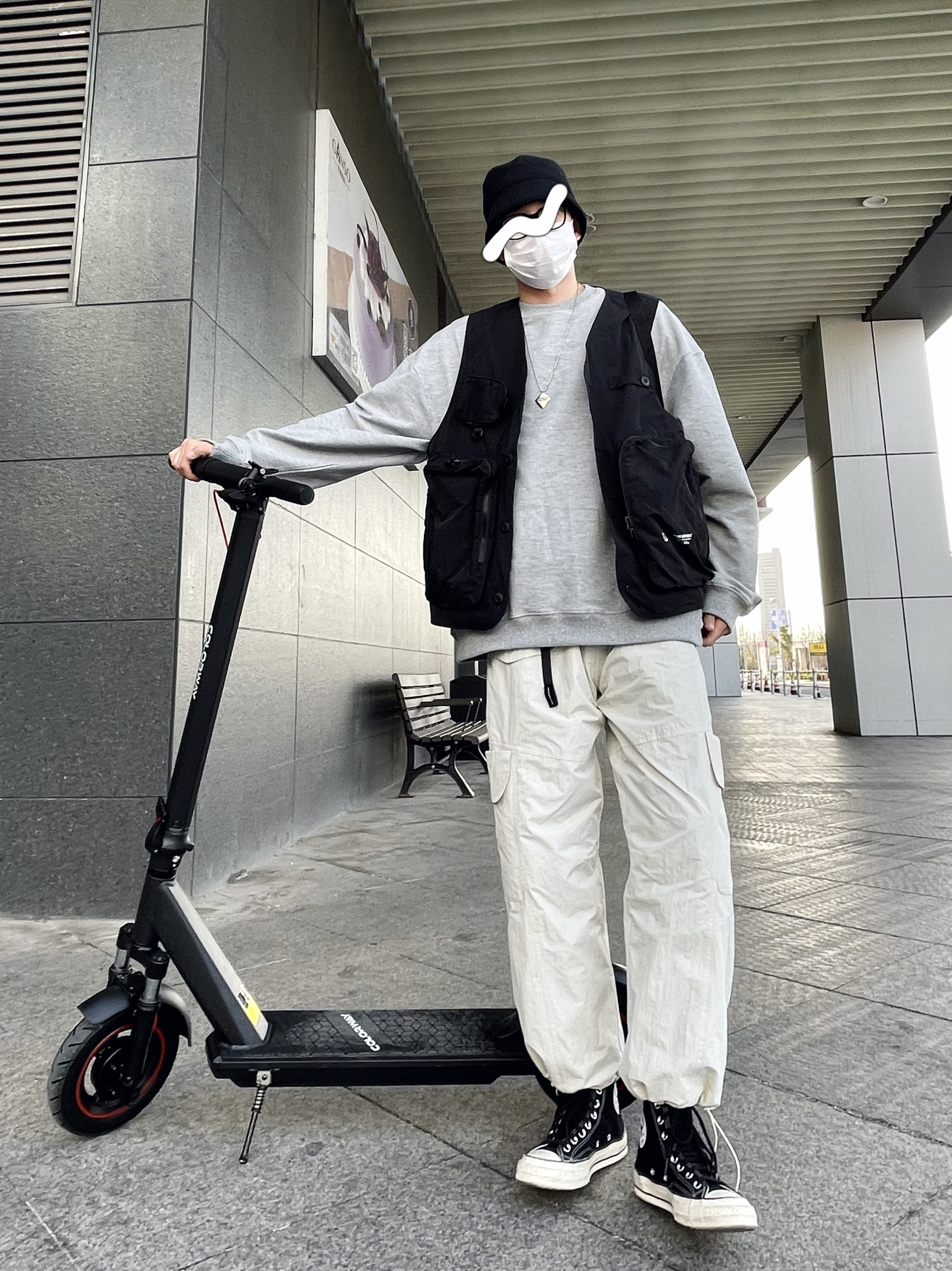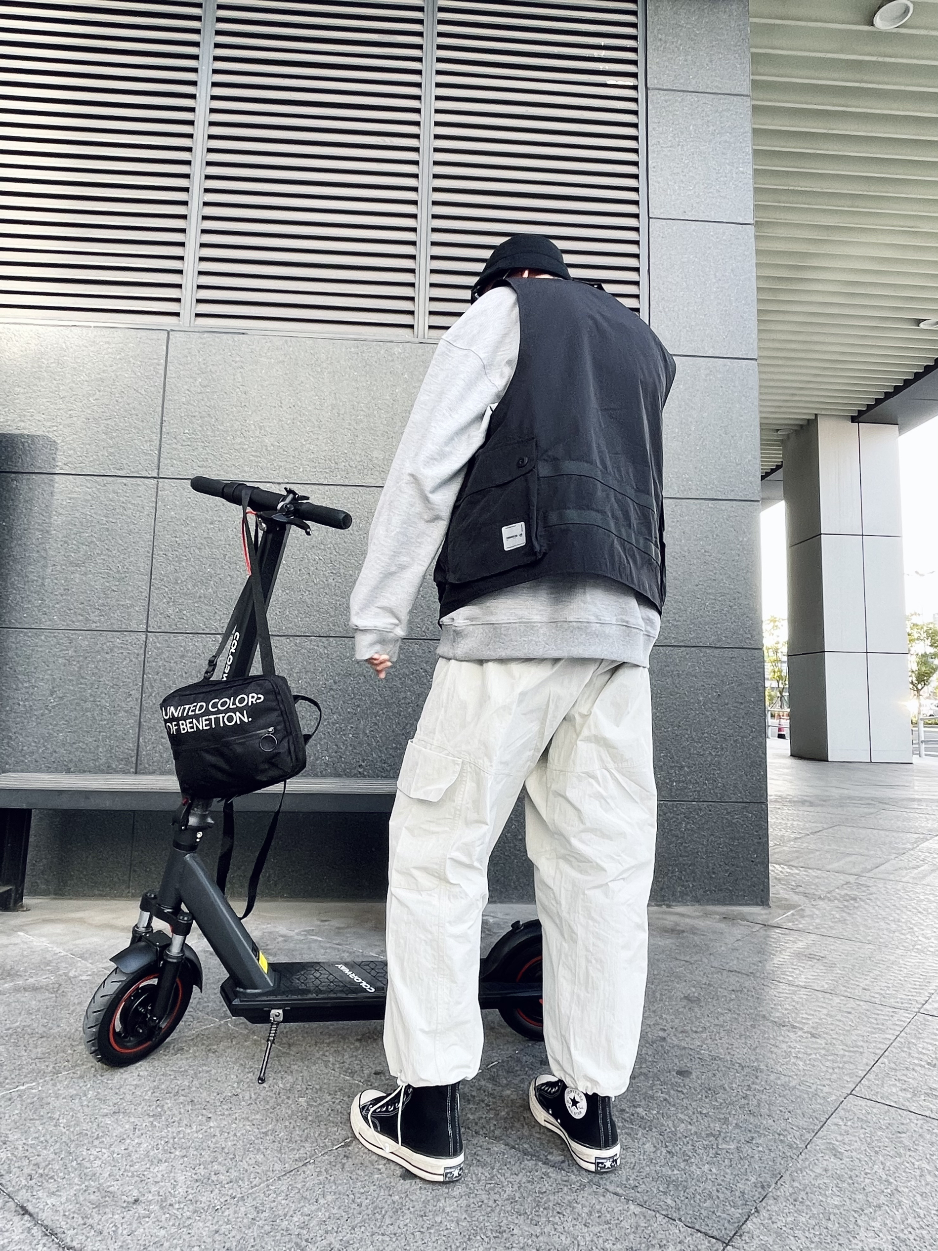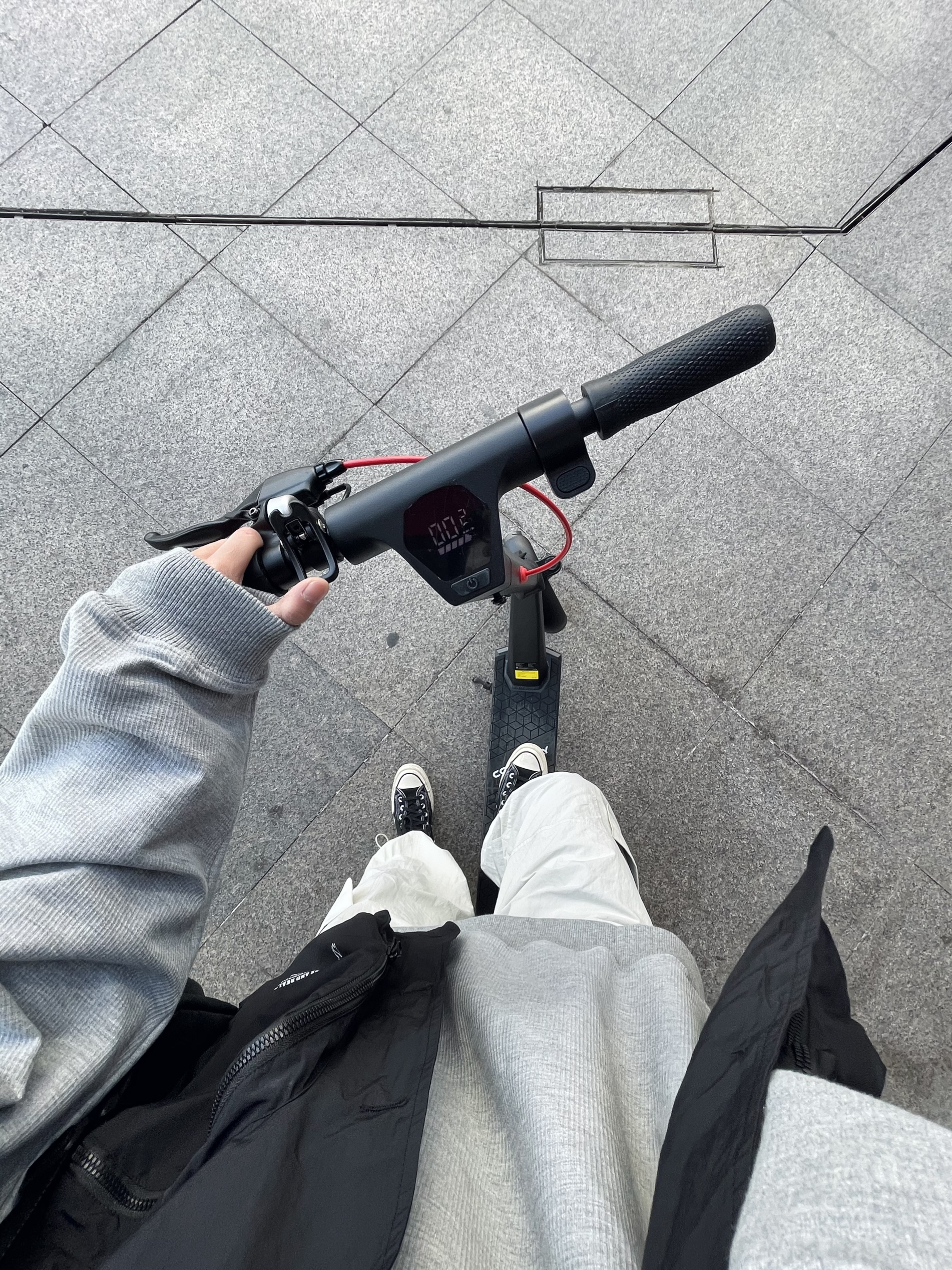 🛴今天带新入手的科洛威滑板车出来兜兜风,当时就是看中了这款车的便携性才买的。折叠起来很轻松,而且能骑到电梯里直接到家,平时出门取快递买菜都🉑️ 还能app智能锁车很方便。 ▪️马甲 fromwrting字由 质感很不错的一件机能工装马甲,口袋带拉链,内搭T恤或者卫衣衬衫都很好看。 ▪卫衣 fromwrting字由 落肩版型的一件灰色卫衣,偏大一些 面料垂感很足,这种卫衣不挑裤子。 ▪️包包 #贝纳...
