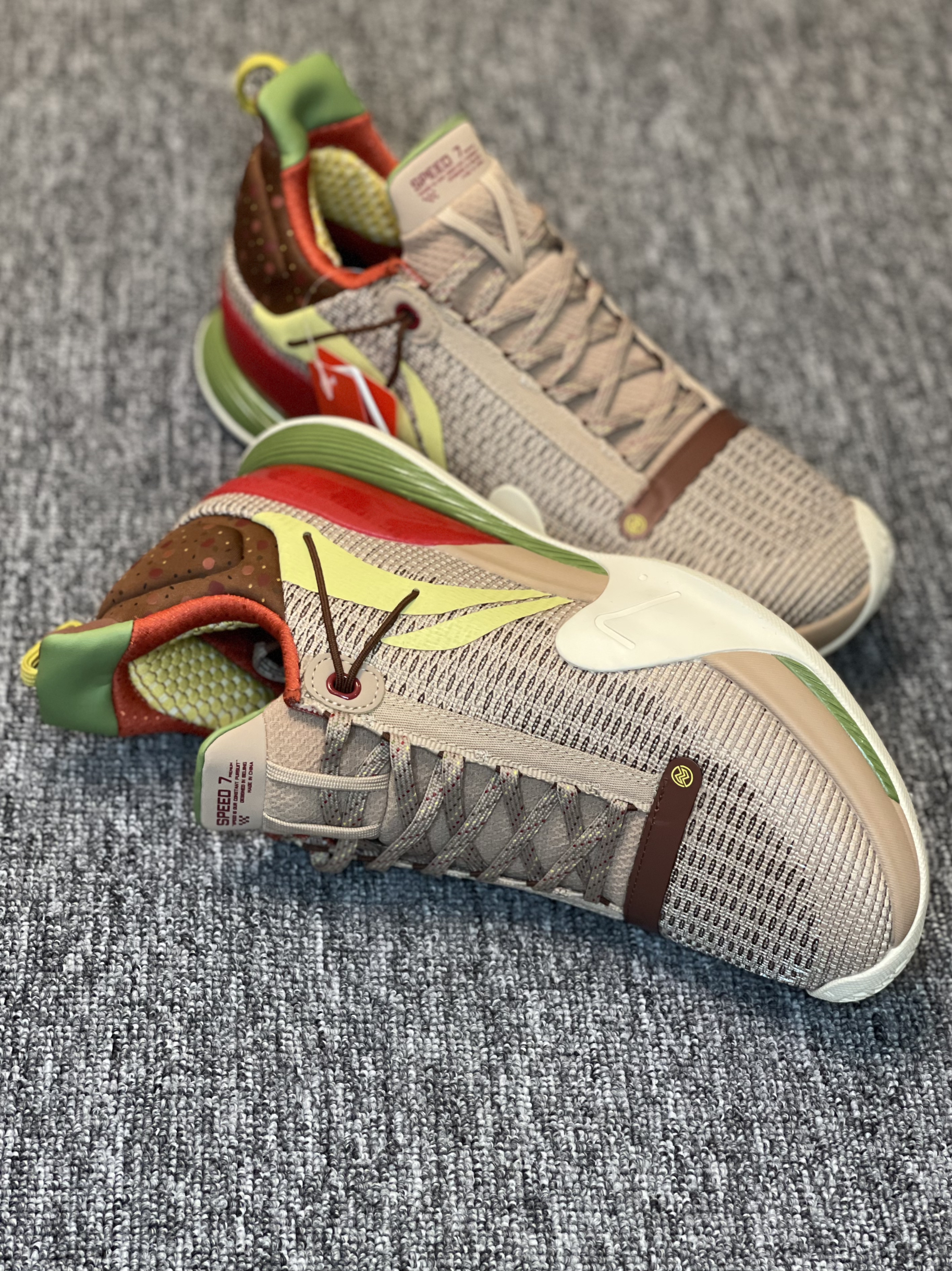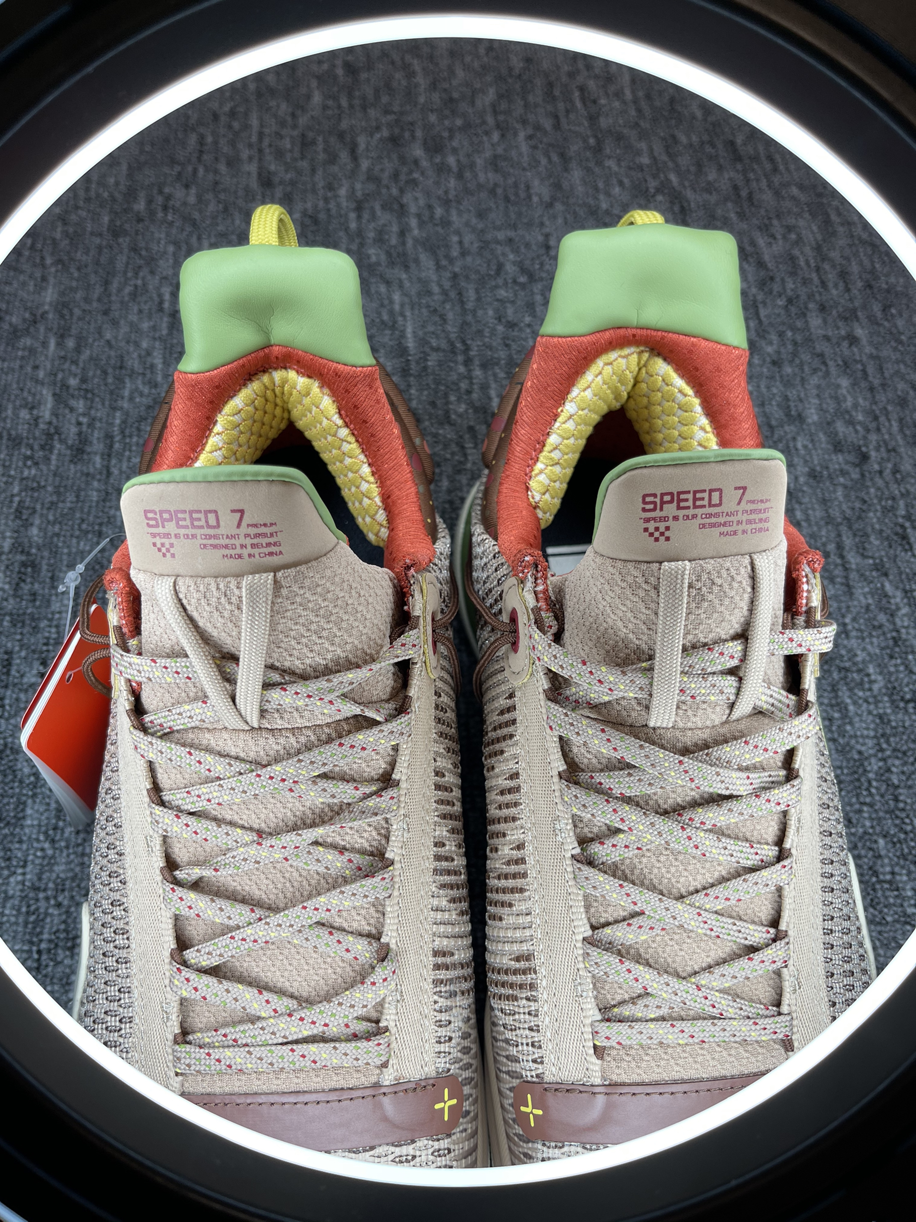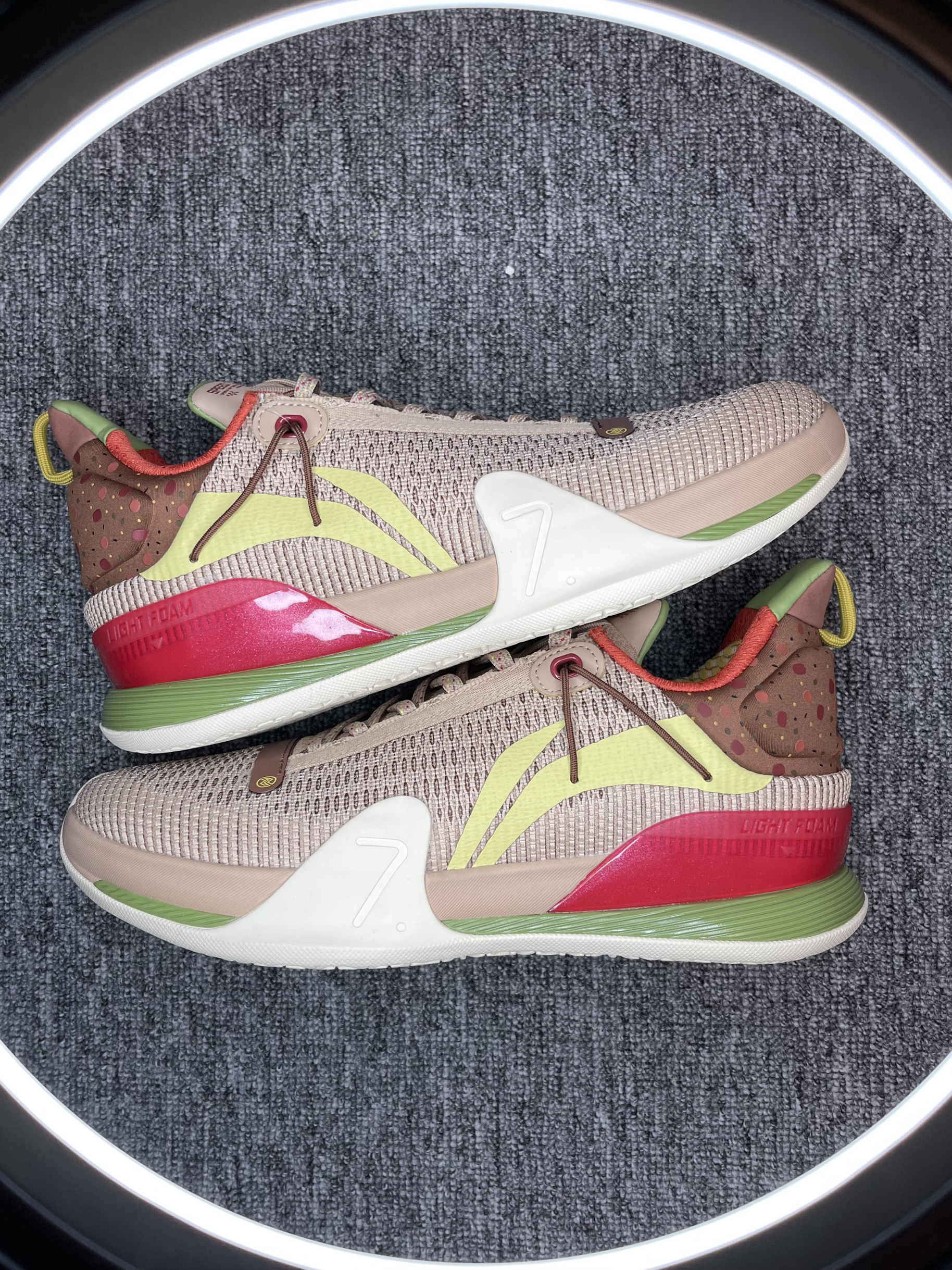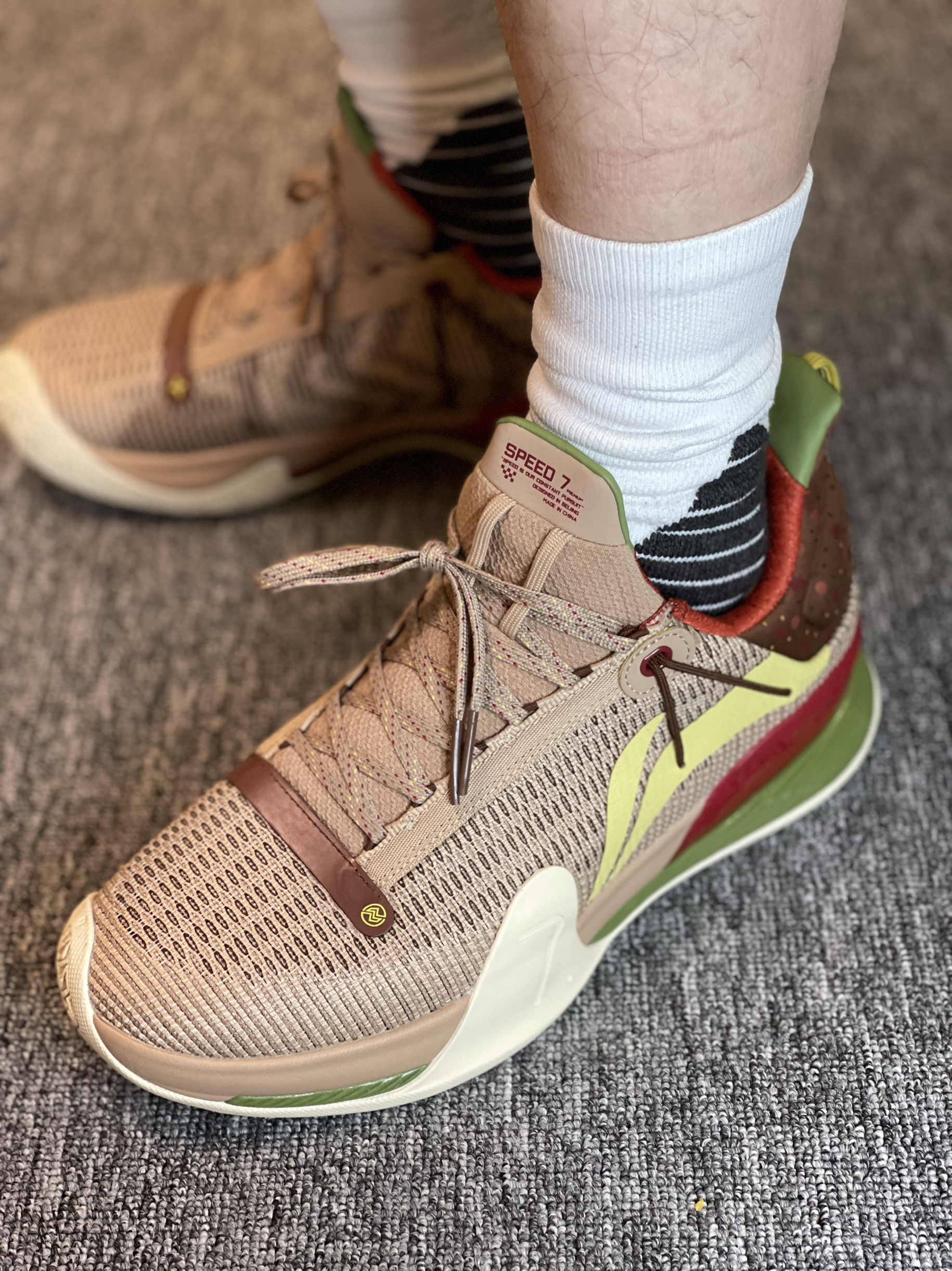 得益于NBA球场极高的上脚曝光率 最近对李宁闪击7来了兴趣 买了三个配色 先到了这双腊八节 简单开个箱 对于开学季学生党室外实战鞋来说 400左右这个区间应该是具有极高的性价比了 性能均衡 没有硬伤 高强度的一体织鞋面 双材料缓震 稳健的抓地 基本能满足大部分的需求了 这双腊八节配色还是比较有意思的 鞋后跟的腊月初八 搭配整体颜色的小点缀 腊八粥的形象跃入脑海 栩栩如生
