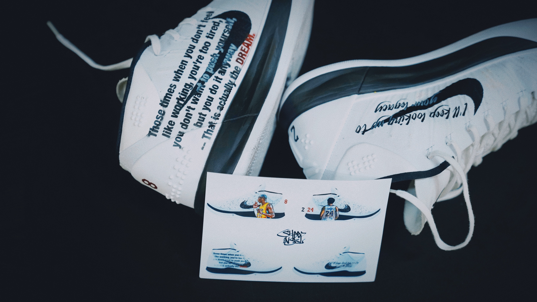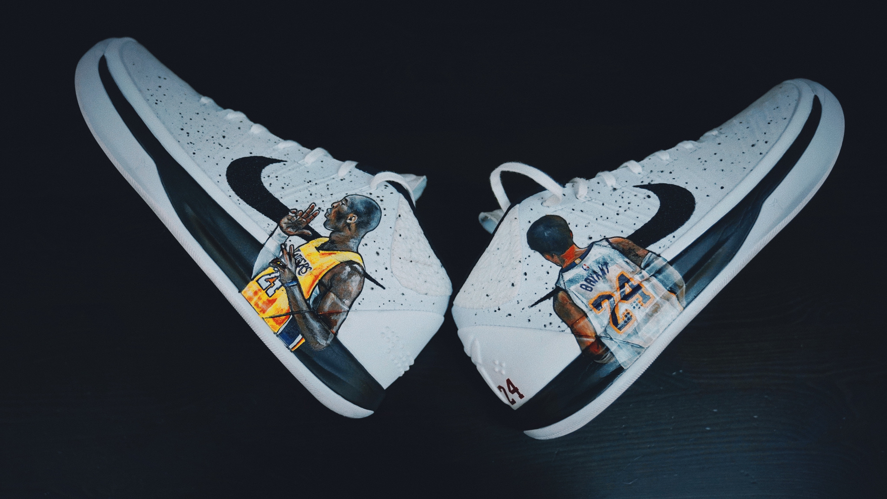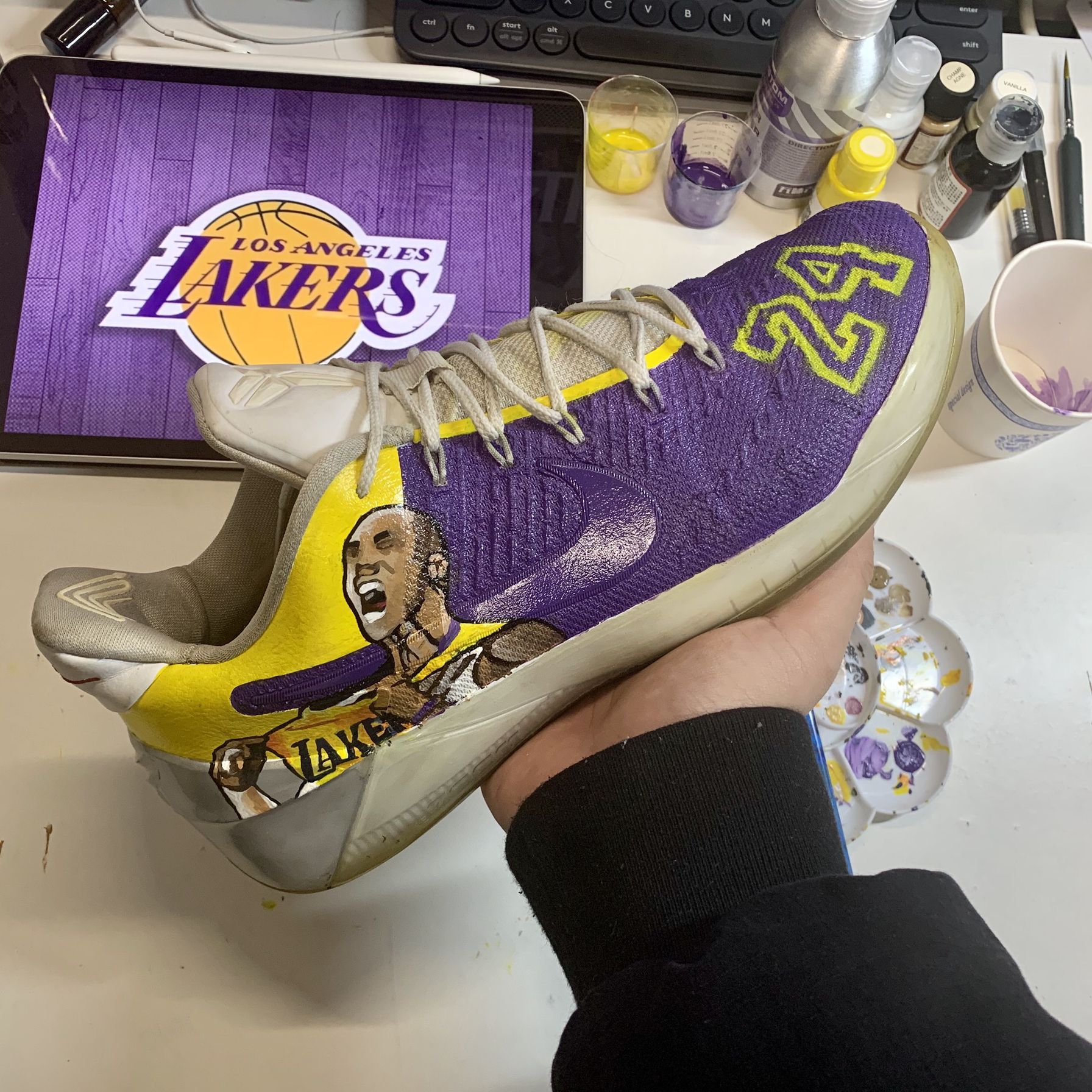 这是一双为球鞋博主沸才定制的Kobe主题球鞋 灵感来自于他最喜欢Kobe的一张照片以及他穿着Kobe球衣时的背影,希望能够更好的把曼巴精神继承下去 mamba this is for you #US95ART球鞋定制