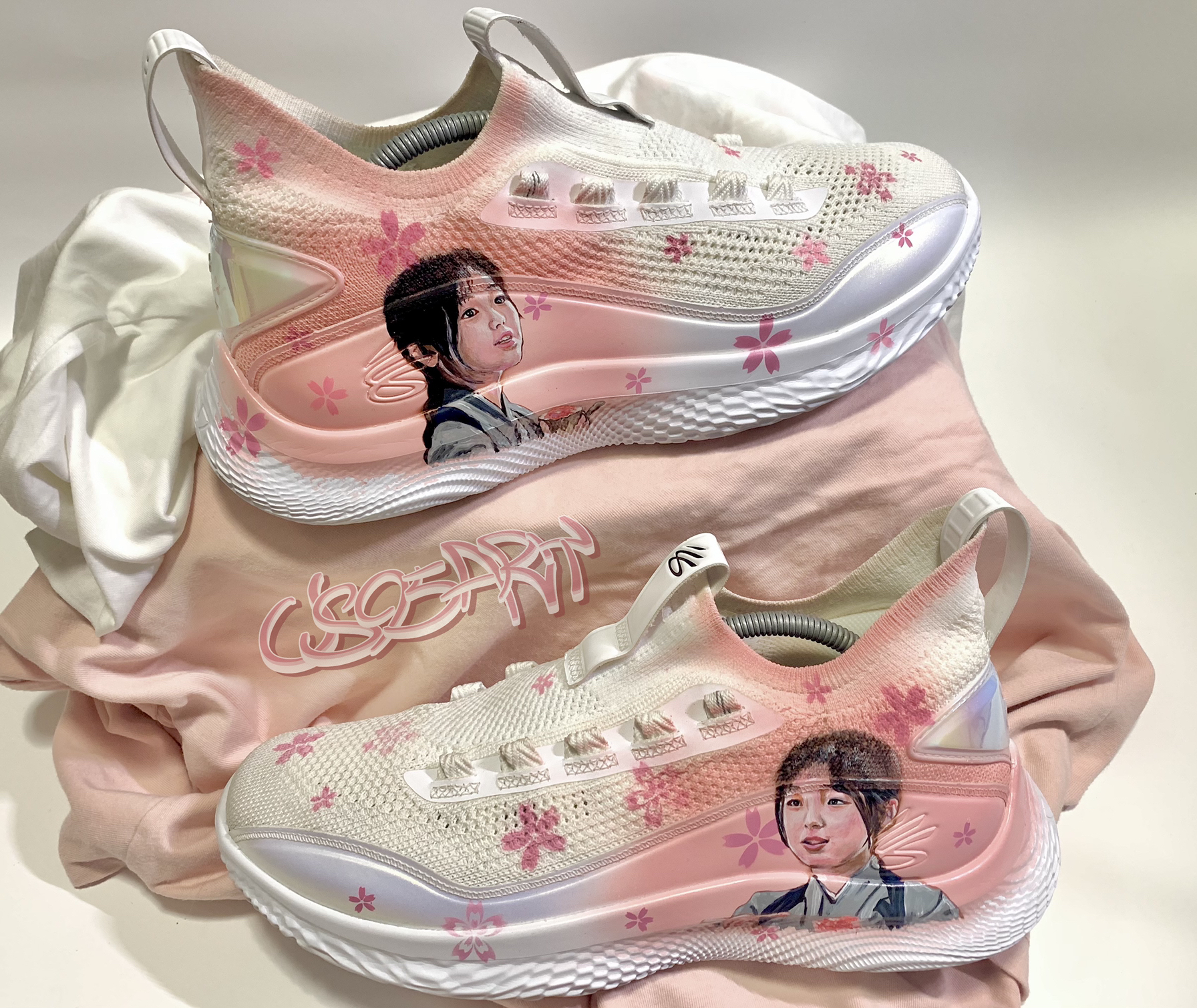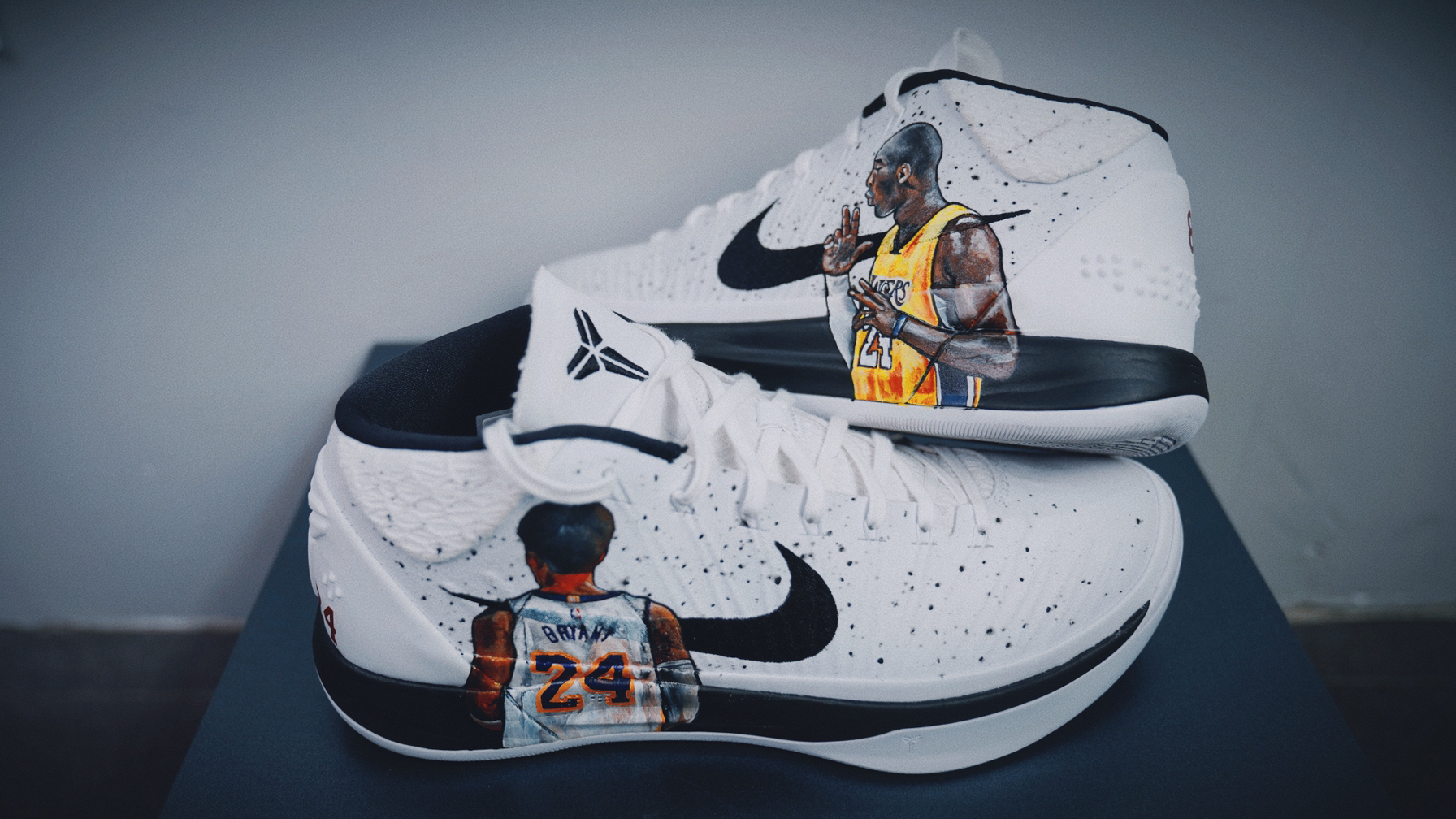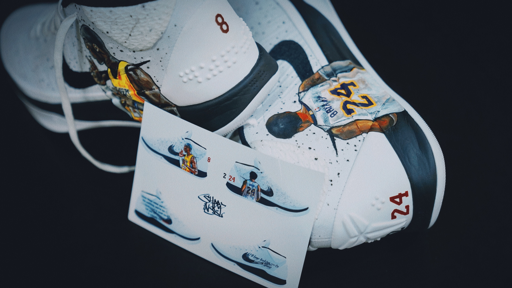 这是一双为球鞋博主沸才定制的Kobe主题球鞋 灵感来自于他最喜欢Kobe的一张照片以及他穿着Kobe球衣时的背影,希望能够更好的把曼巴精神继承下去 mamba this is for you #US95ART球鞋定制