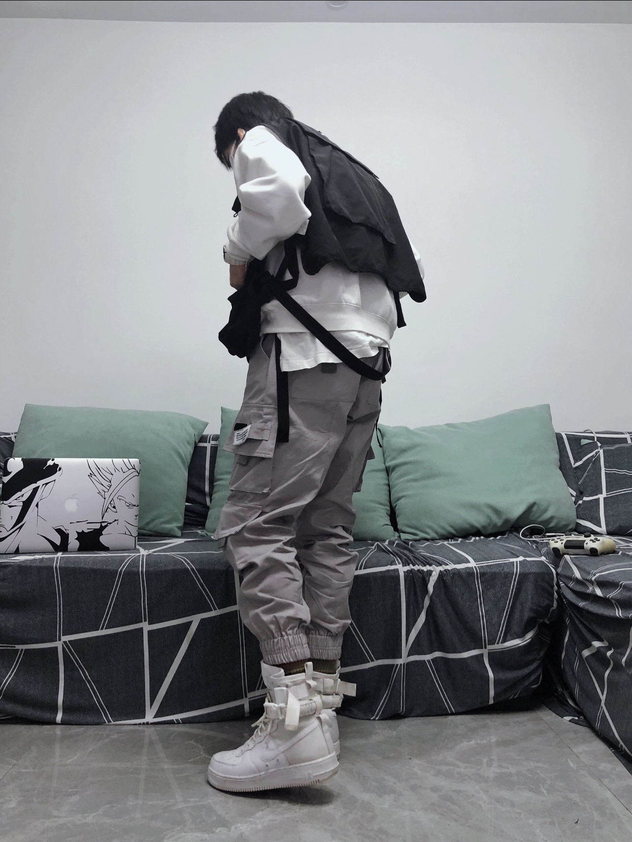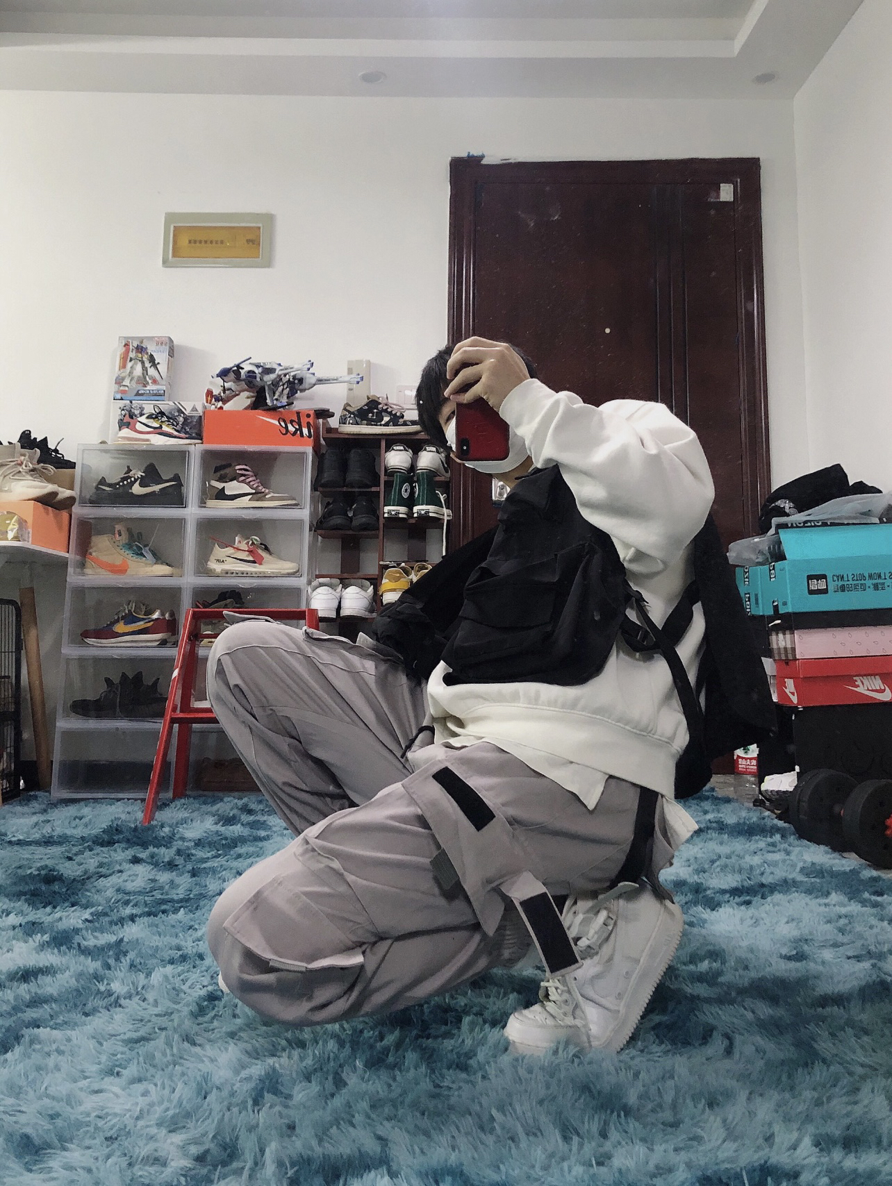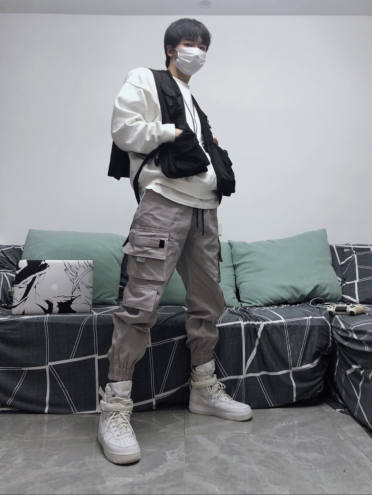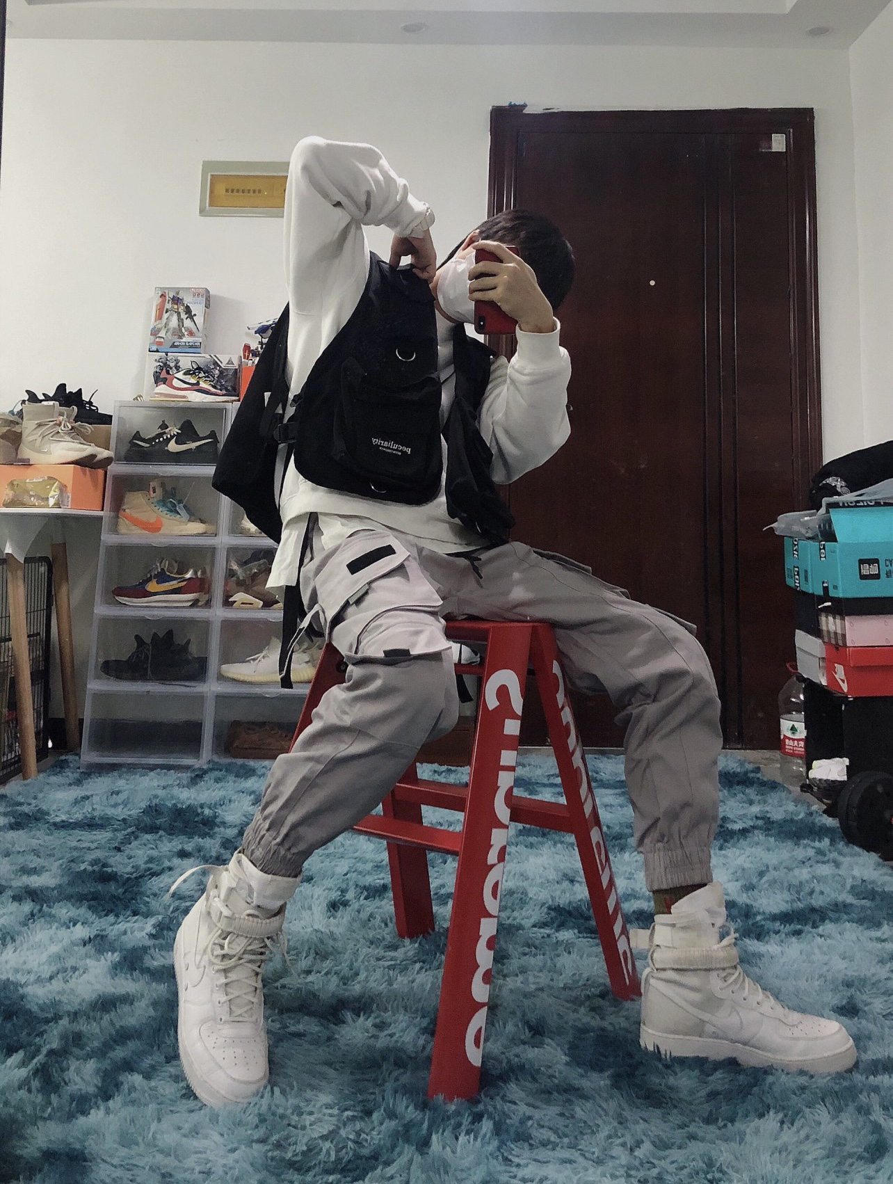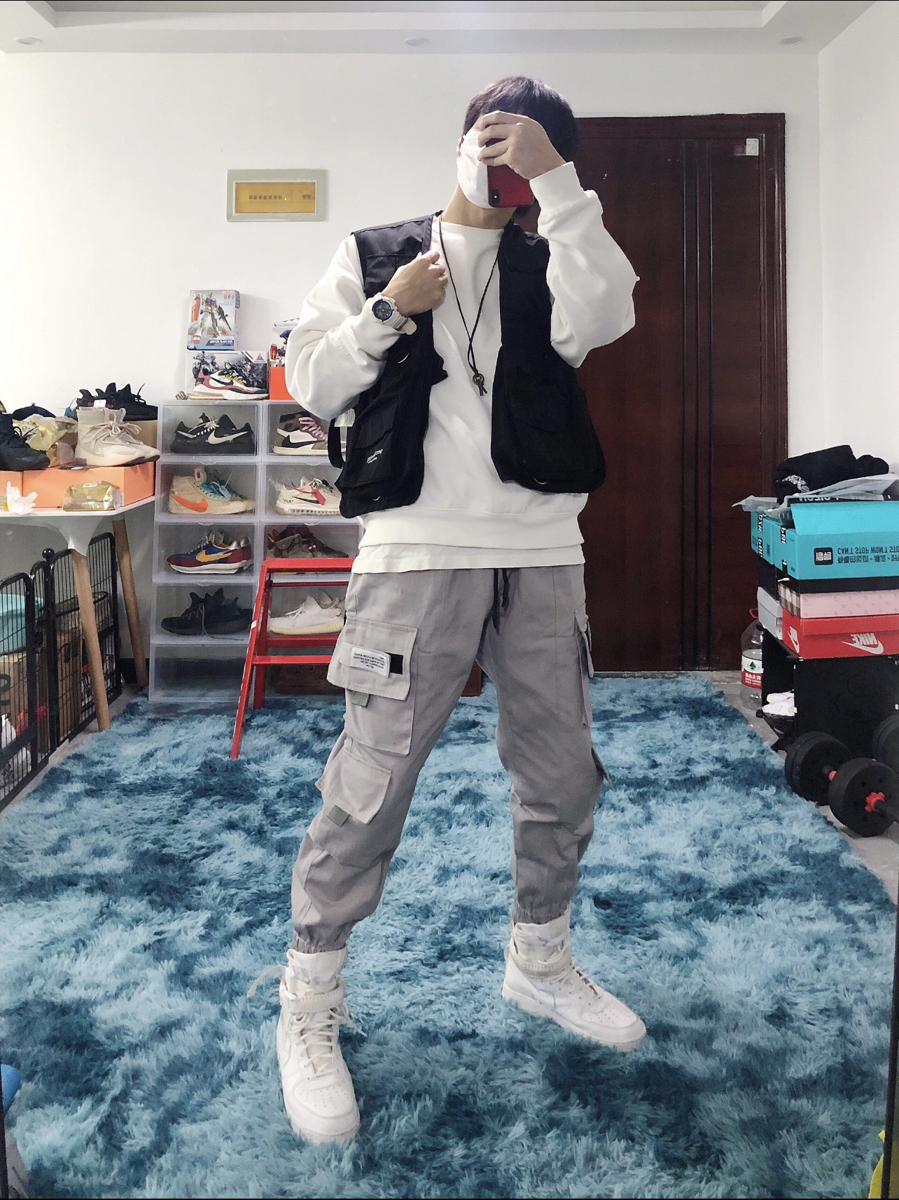 🧥衣服:战术马甲+fog副线 👖裤子:M5is 👟鞋子:AF1 军事高帮 这双鞋子当年发售的时候就被惊艳到了 满满的军事风和机能风 所以搭配了一身以工装裤 战术背心为主的套装 裤子来自 M5is的工装浅粉色束脚裤 功能性强大 包包能满足各种需求 内搭fog副线圆领长袖卫衣 简约舒适
