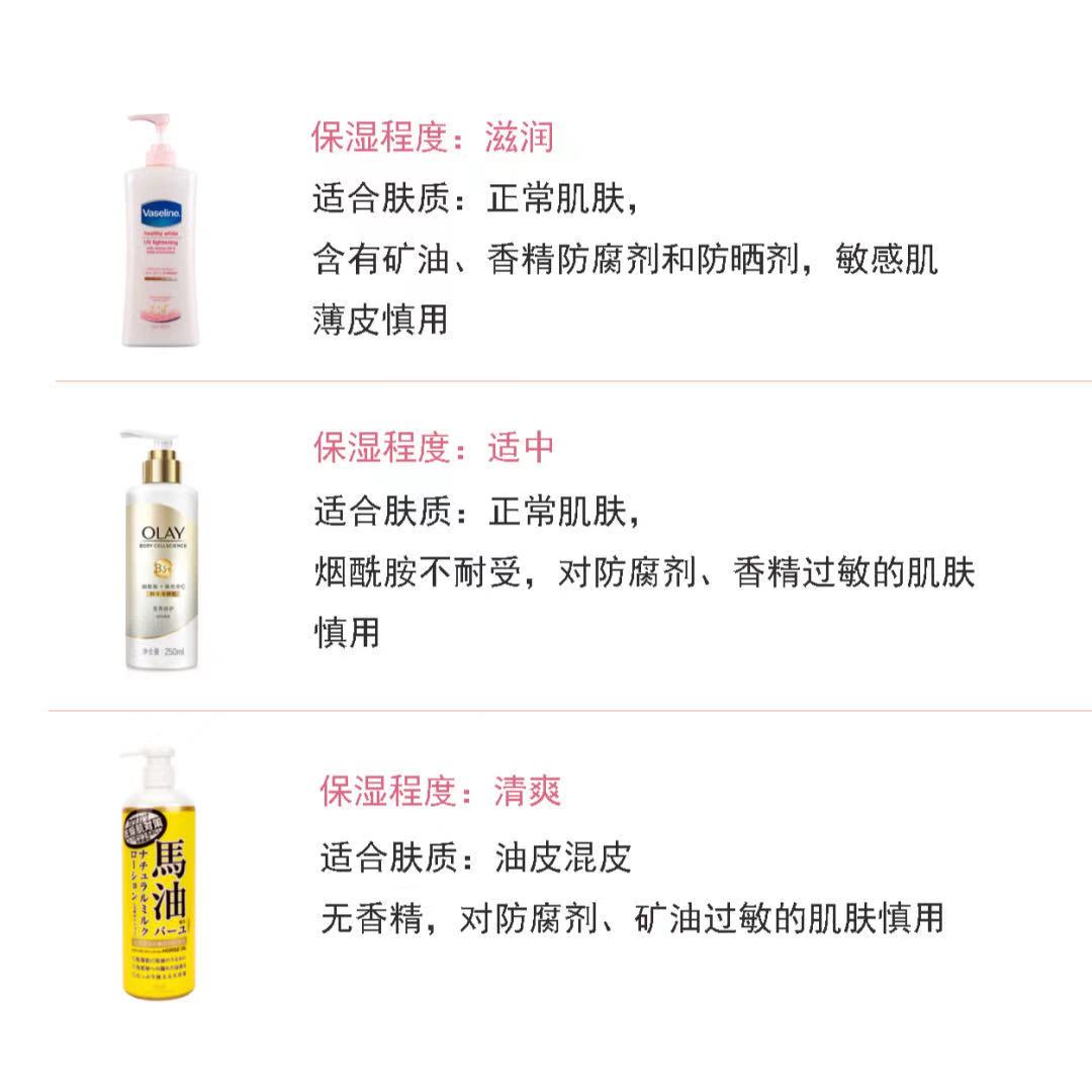 这次小林挑了10只热门产品,从成分入手,为大家分析它们的功效,以及适用肤质。 😇😇😇 1⃣️凡士林美白身体乳 这款平价美白身体乳,烟酰胺排6位,含量应该不会超2,矿油成分保湿效果不错,加上低含量的防晒成分,坚持使用能看得到变白效果,若不是超干皮,南方冬天用足够。 . ✨适合肤质:正常肌肤, ✨含有矿油、香精防腐剂和防晒剂,敏感肌、薄皮慎用 . 2⃣️Olay烟酰胺身体乳 烟酰胺含量大概在3.5左右...