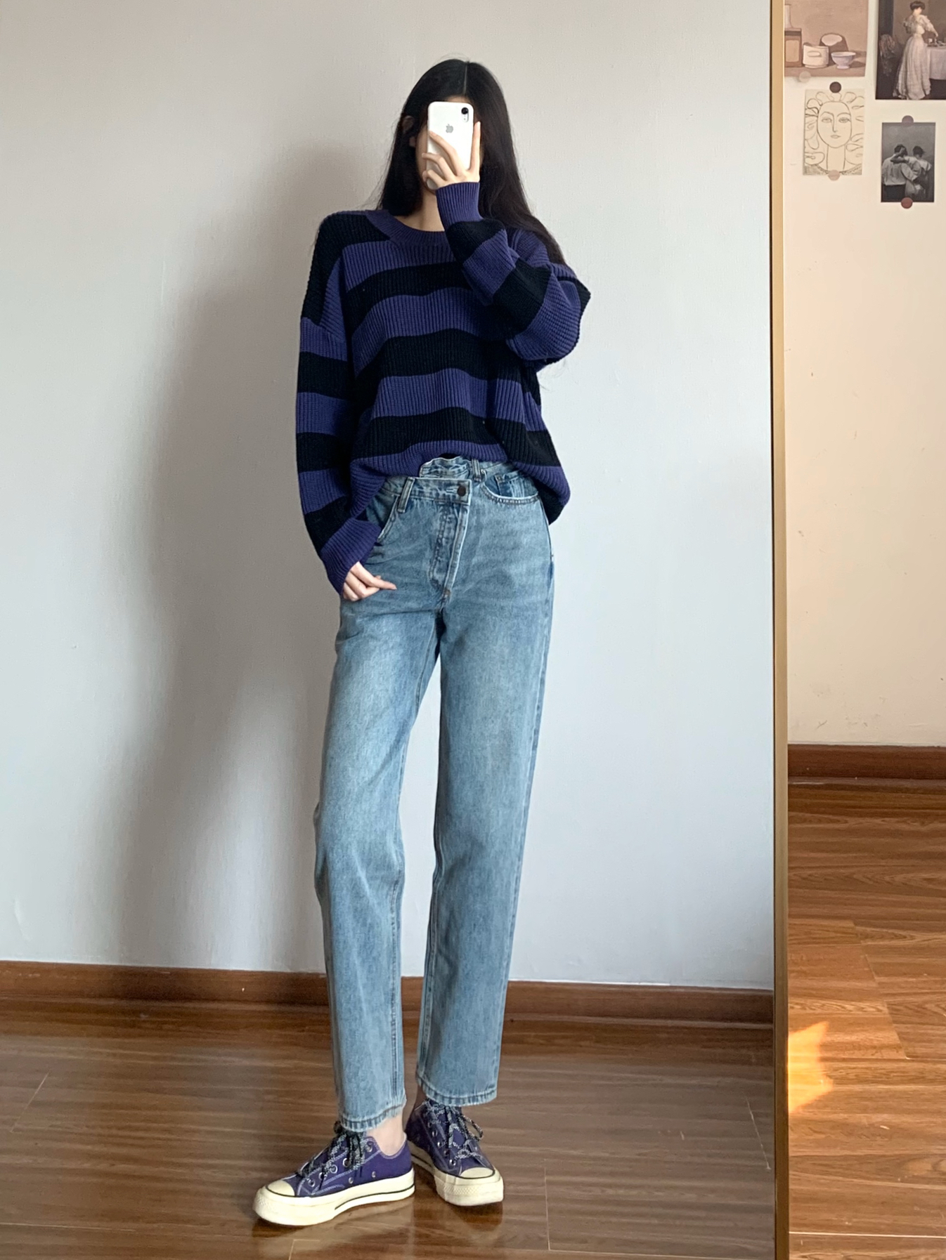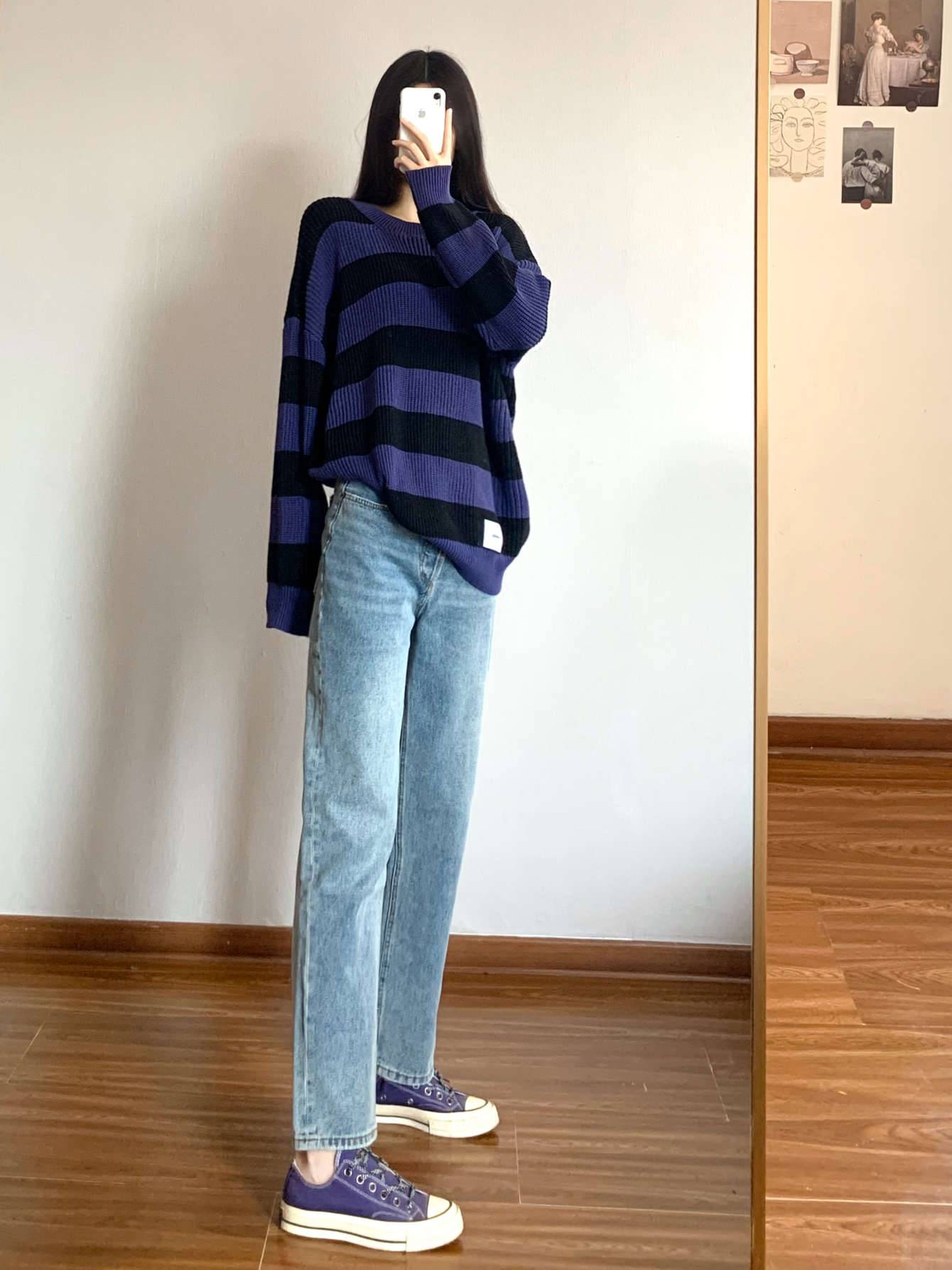 ⚫️ Look1⃣️(图1左 图3 图6) ▪️毛衣:PIANNING(紫黑配色很显白 宽条纹搭配宽松版型 很有美式复古的味道 面料含棉量很高 贴身穿也很舒服 ) ▪️牛仔裤:THREE12(直筒裤加老爹裤的版型 长度我很喜欢 搭配帆布鞋很清爽利落 腰部也很有设计感 水洗蓝色经典百搭) ⚫️ Look2⃣️(图1中 图2 图5) ▪️毛衣:HHYEE(毛衣开衫实用又好穿 做外套或者内搭叠穿都可 深...