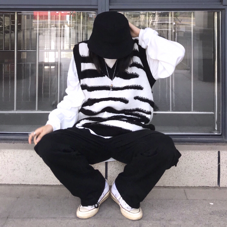 女生酷起来就没男孩子什么事了(手动狗头) 这个帽子太好拍了哈哈哈哈🐷 马甲:Take off咖喱人 裤子:Wtaps 鞋子:Converse 1970s白色 项链:AMBUSH玫瑰花项链 马甲真的是穿搭的搭配单品鸭 前面斑马纹 黑白相间很是适合简约的穿搭 背后是纯白色滴 下面搭配工装裤 多口袋设计出门都不用背包哈哈哈 脚口有抽绳设计 拖地裤 / 束脚裤 两穿 用白色帆布鞋呼应白色的上衣 😝