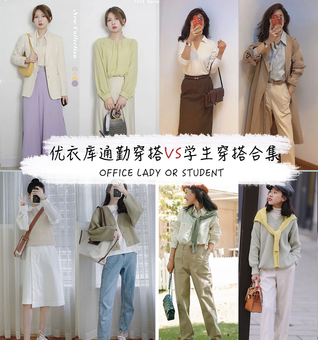 优衣库的单品不仅简单大方,还很百搭,相信很多小仙女都被优家种过草。那今天就来跟大家聊聊优家那些既适合上班族又适合学生妹的绝美穿搭叭~ LOOK1-2:哇塞,这一眼看过去简直就是仙女本仙啊,淡紫色的阔腿裤搭配鹅黄色西装外套,尽显女士的端庄优雅,穿着这一套去上班,职场气质立马就有了。第二套淡绿色的上衣太适合初春了,不仅养眼有气质,还展示出来你的干练果敢,总之就是绝了! @Jenny66 米色衬衫(4...