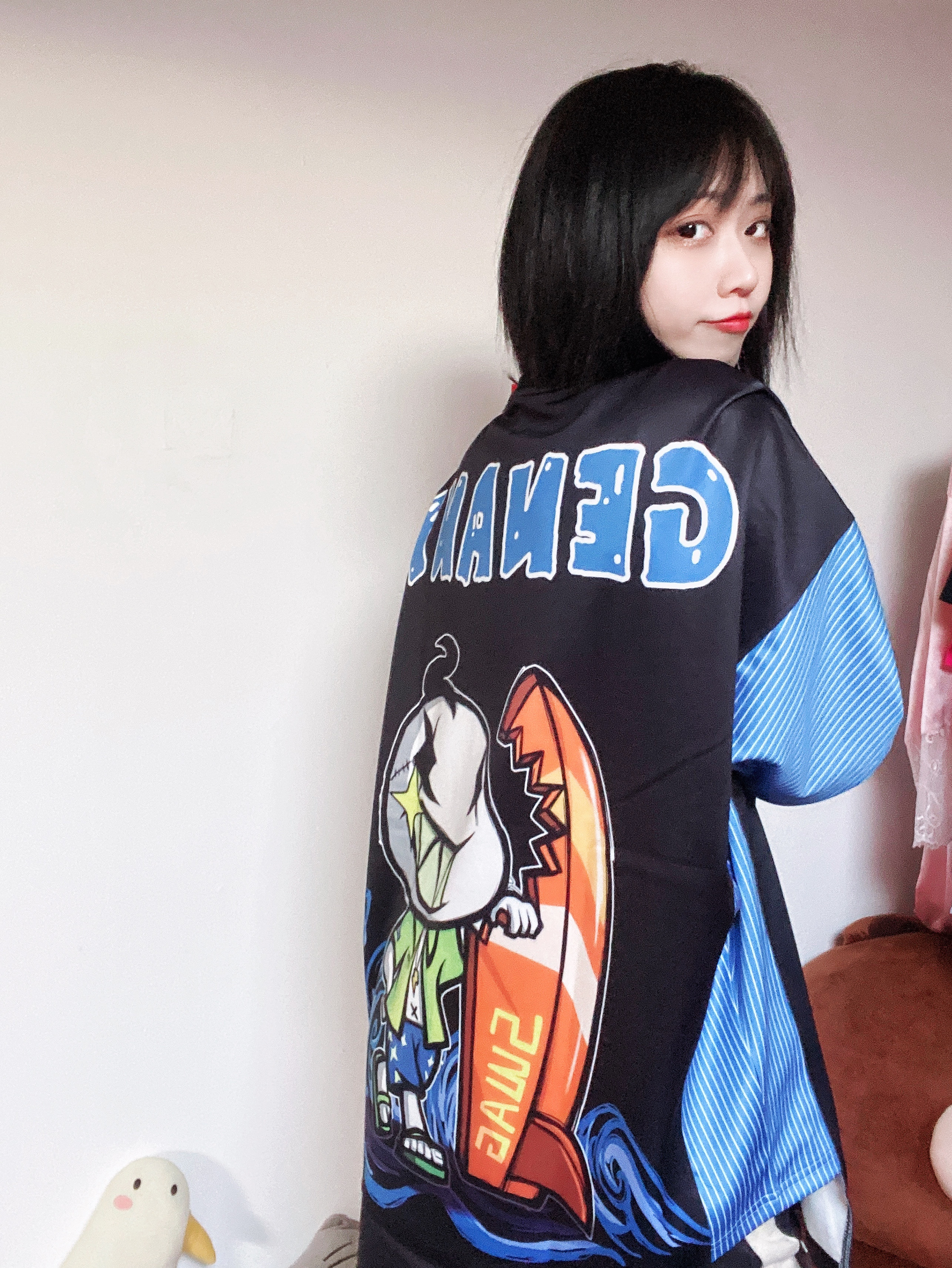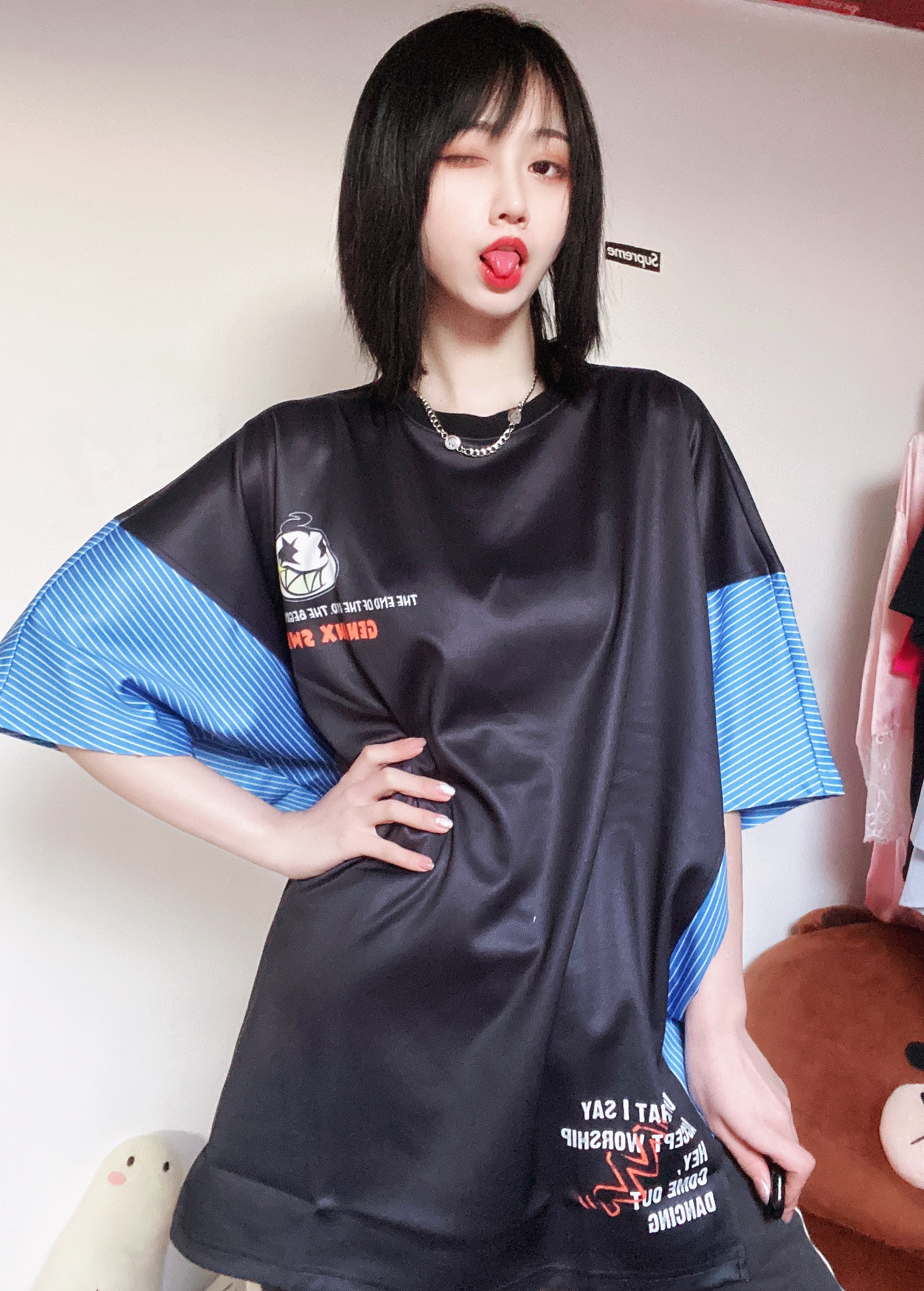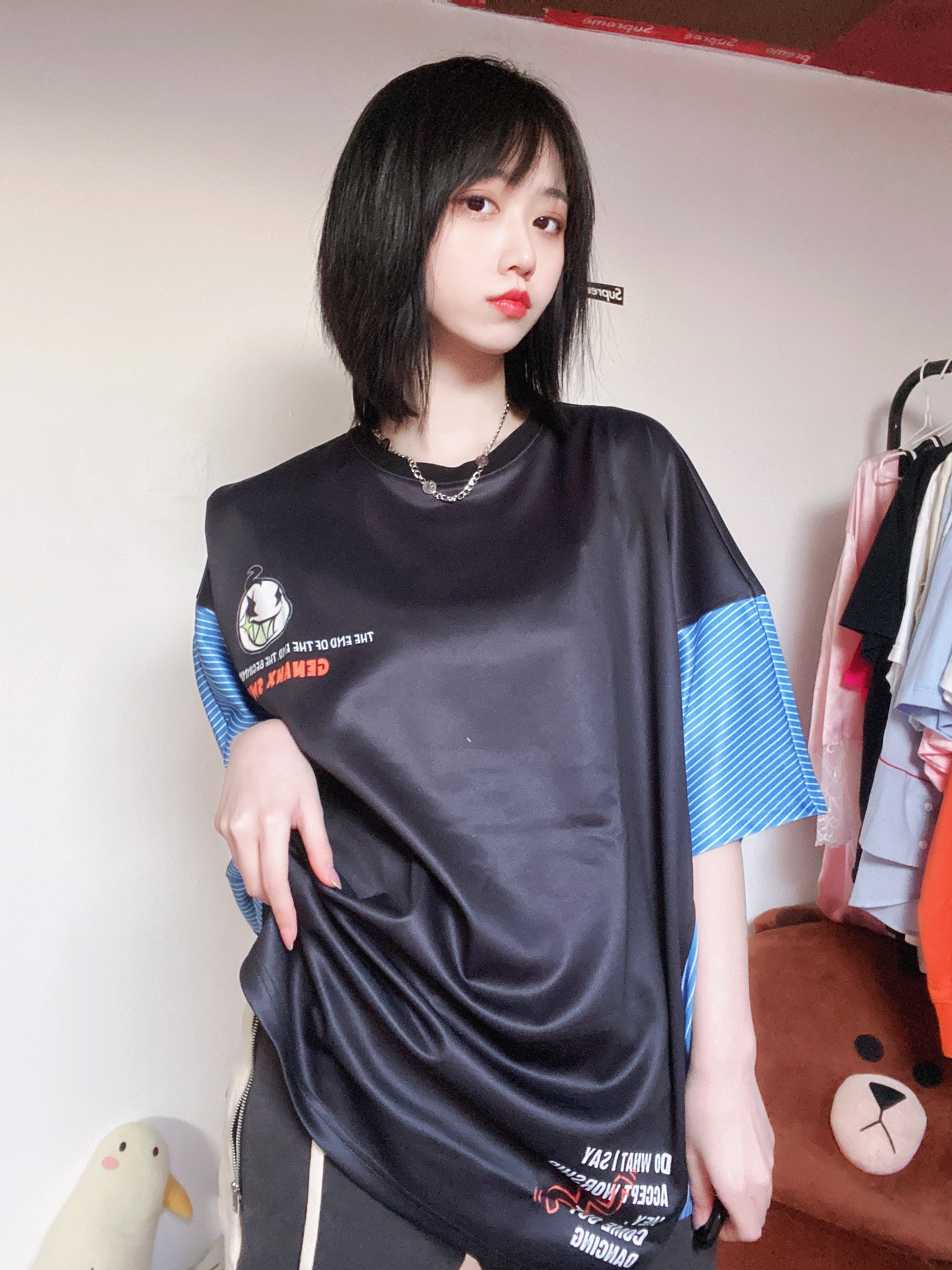 👔 GENANX 这个长度简直可以当小裙子穿了 垂感爆炸好 穿起来凉凉快快特别舒服 夏天要到了还不抓紧看短袖 冷色调的搭配看着就很舒服 穿个短裤踩双匡威就是夏日舒适穿搭 背后的大面积涂鸦非常可爱