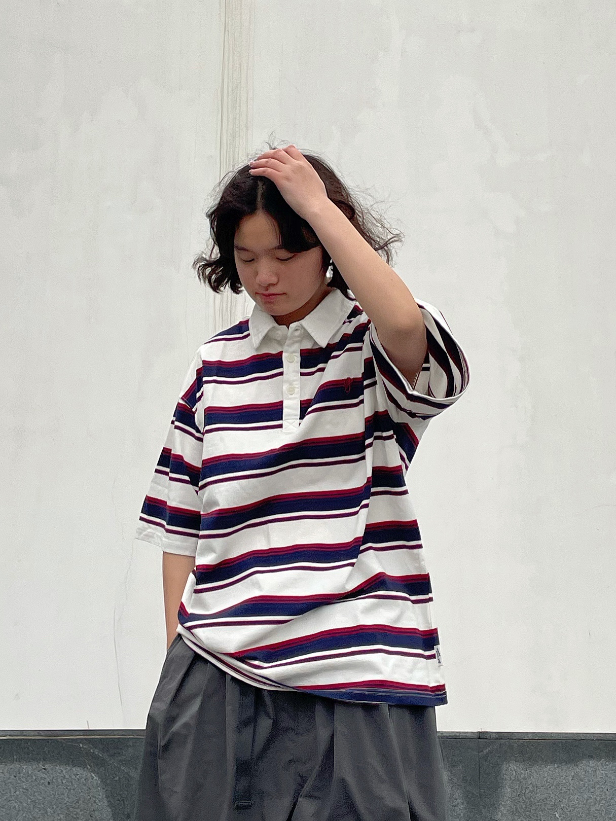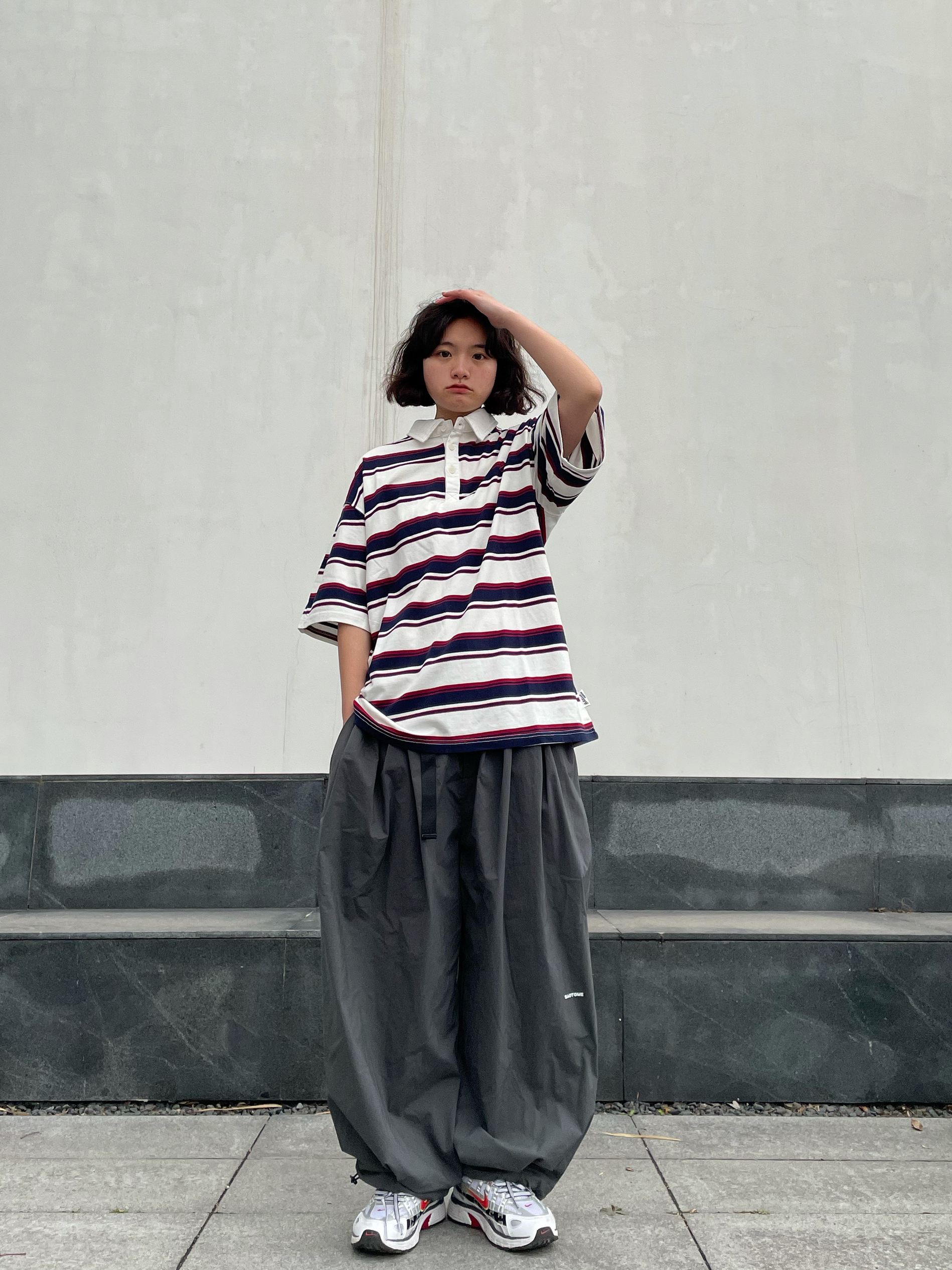 👔:BDCT字母刺绣条纹短袖Polo衫 条纹显瘦!polo衫设计我太喜欢啦。校园风十足,非常好驾驭啦! 👖:早乙女惠子 灯笼束腿休闲长裤,灰色作为基础色也是很好搭配,上身搭配什么都不太会出错啦! 👟:nike p-6000 自己过的开心时会顺便爱一下别人