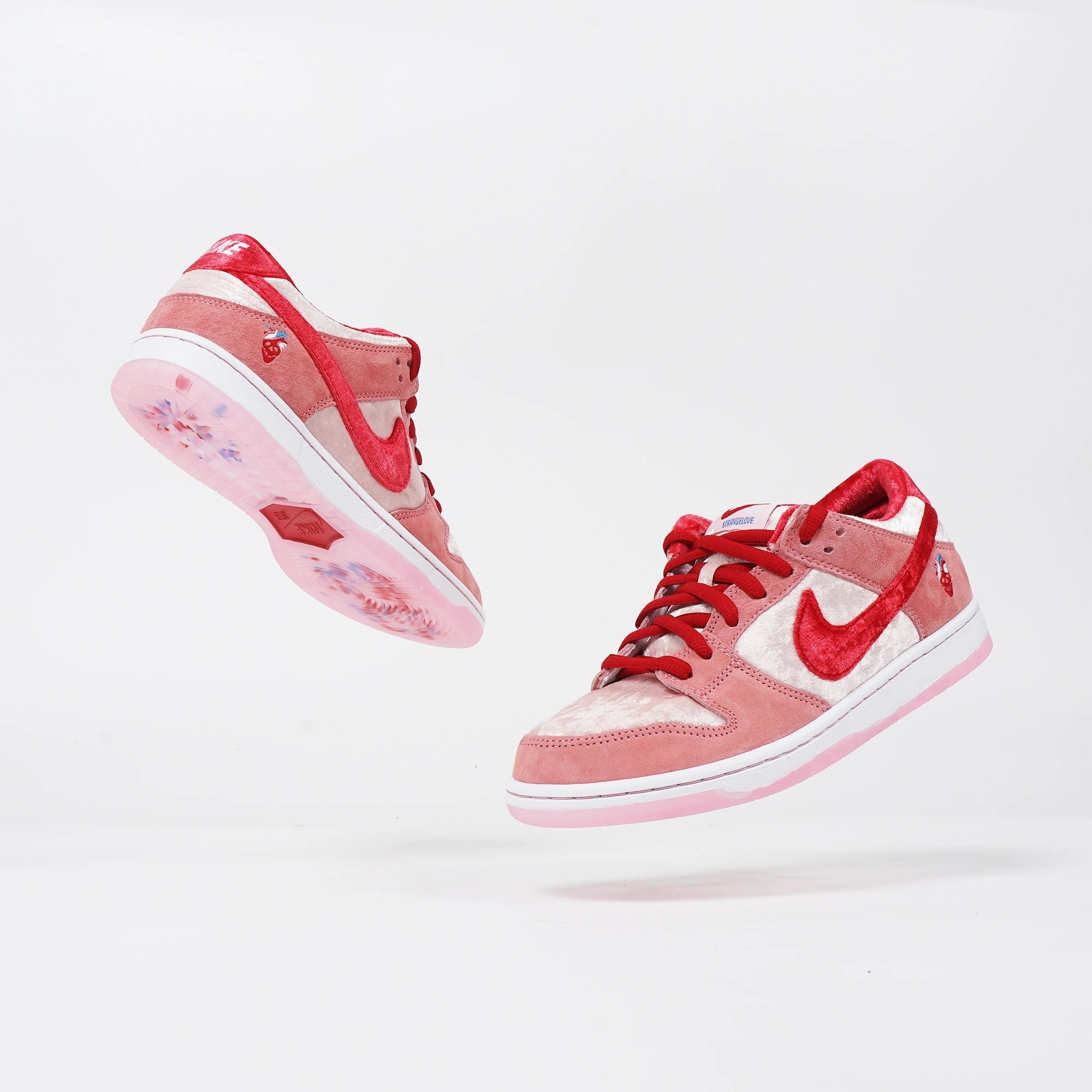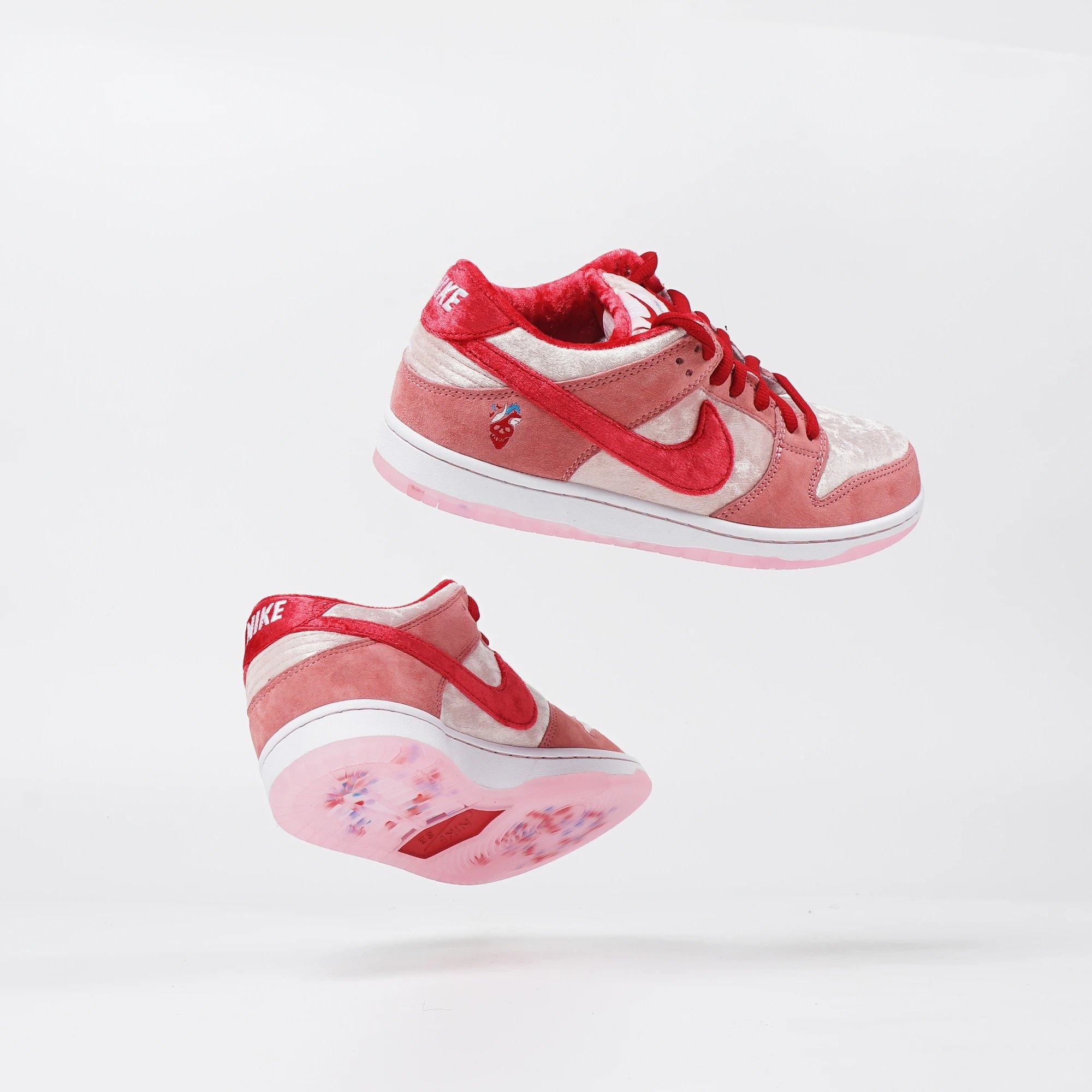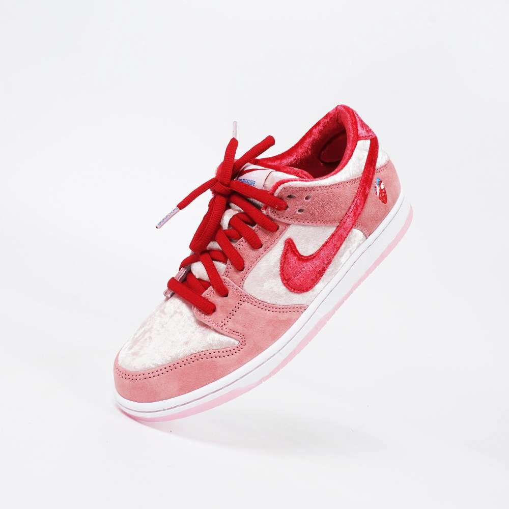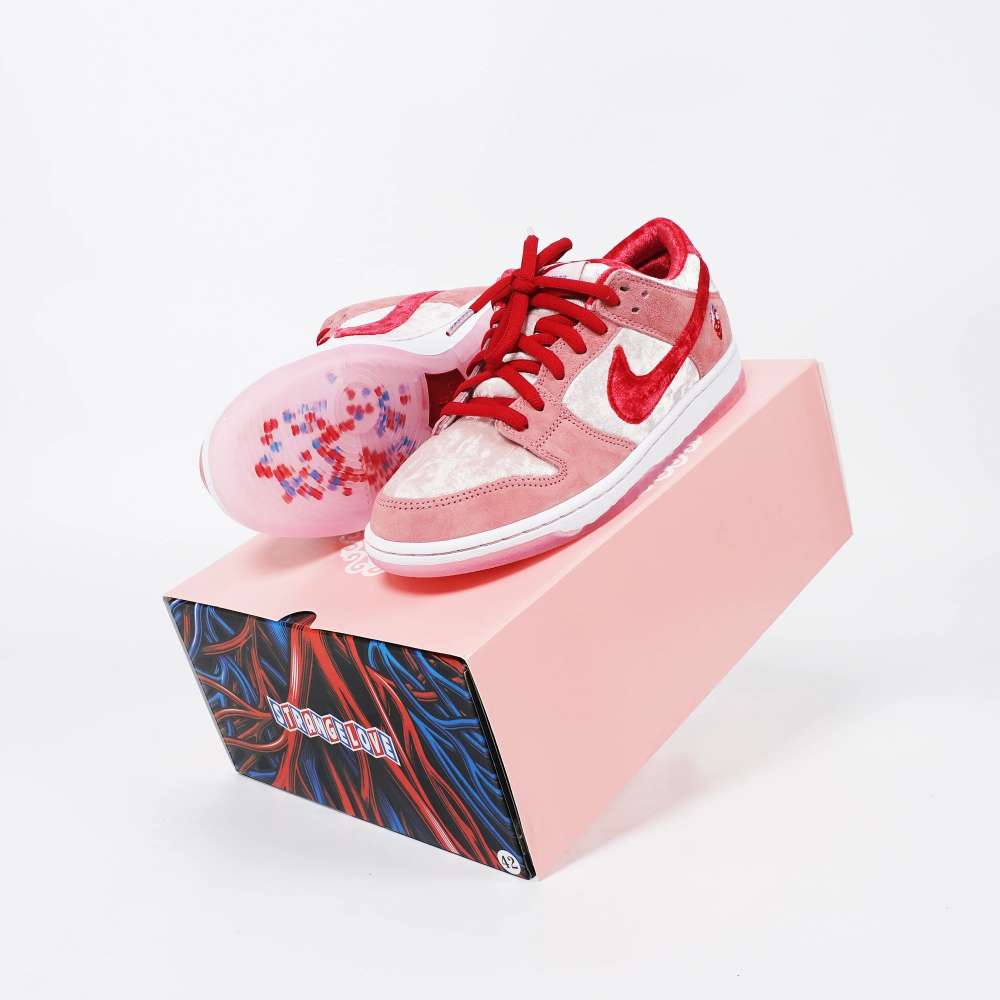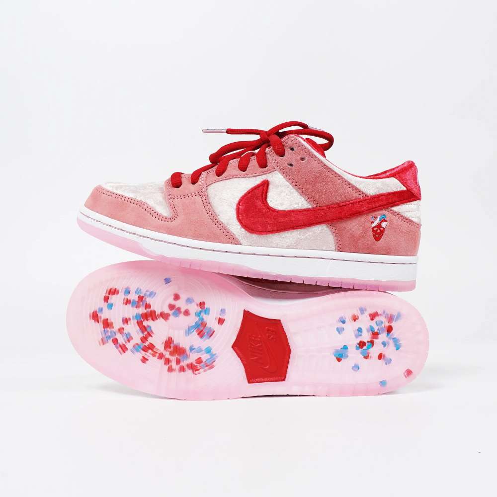 StrangLove x SB DUNK low 情人节限定(粉白配色,瞬间击中你的少女心) 鞋身:粉浅色绒面革~玫瑰红 Swoosh天鹅绒+鞋底:半透明果冻外底+鞋垫:特意将爱神丘比特变幻为卡通💀,射出的爱神之箭 命中滑板。✨ 亮点:后跟点缀的StrangeLove标志性【HeartSkulls】骷髅💀心脏刺绣。爱心 情人节限定真的是一个少女心满满,非常nice的一双鞋。(还不知道 怎么哄女...