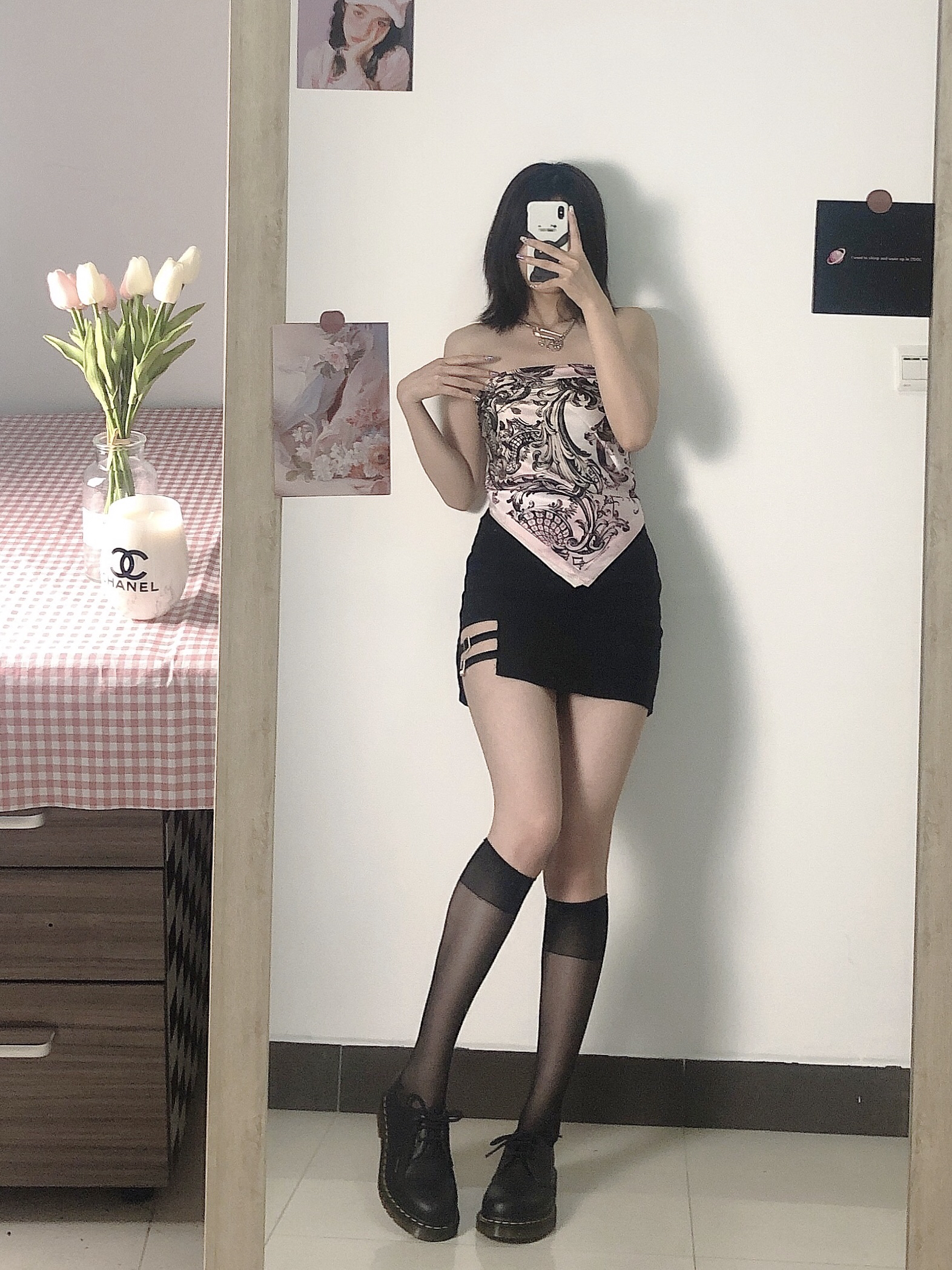 黑粉色系 - 丝巾:fallenangel(ins品牌) 裙子:诗尚品(拼夕夕) 鞋子:Dr.Martens 超喜欢的马丁鞋,短款的,很好搭配,黑色系不会觉得很死板,我穿38码刚好合适哦~推荐入手很棒哦!日常搭配也好穿