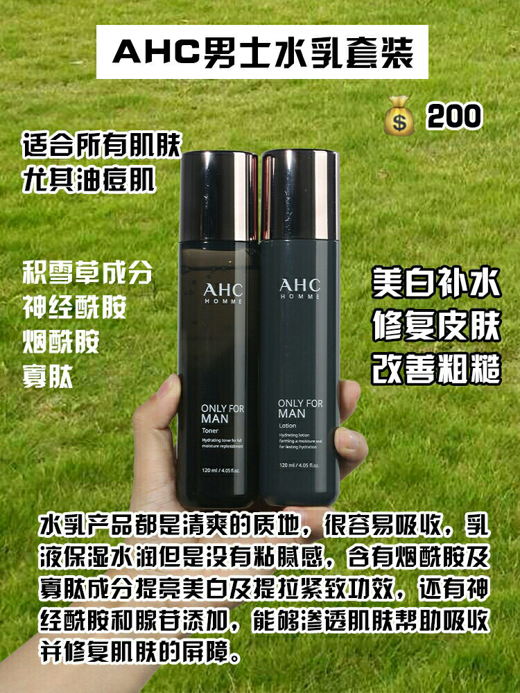 🃏水乳是男士学会护肤的第二步,一个帅气的男生必然会有一款涂在脸上非常舒服的水乳套装。接下来我就整理了六款水乳套装,每个套装都会有自己得优点,同学们也要根据自己的选择去购买呦🙊 1️⃣第一款AHC套装也是经常出现在我笔记里的护肤品了,因为我使用了这个套装一次真的被它折服了,首先量真的很大,特别适合男生;其次对男生很友好,涂在脸上基本没有油腻感,特别适合补水,很容易吸收。 2️⃣第二款碧欧泉特别适合油...