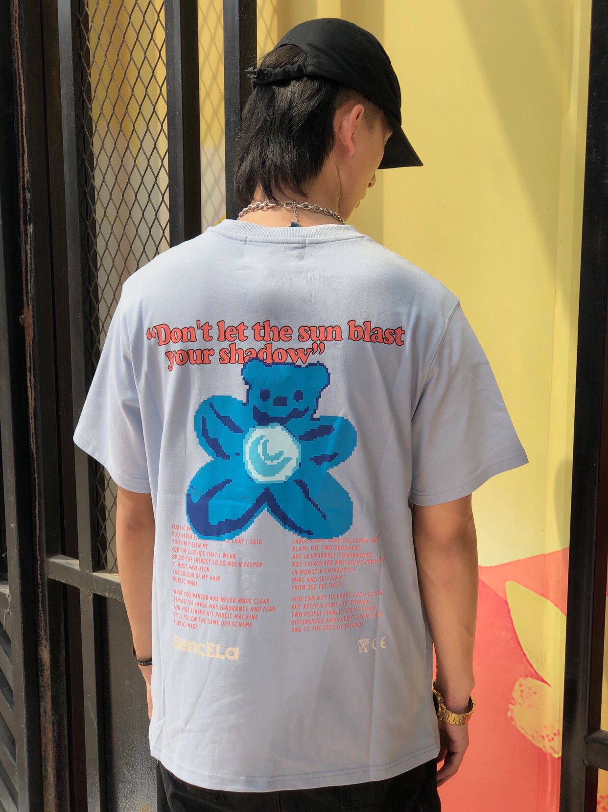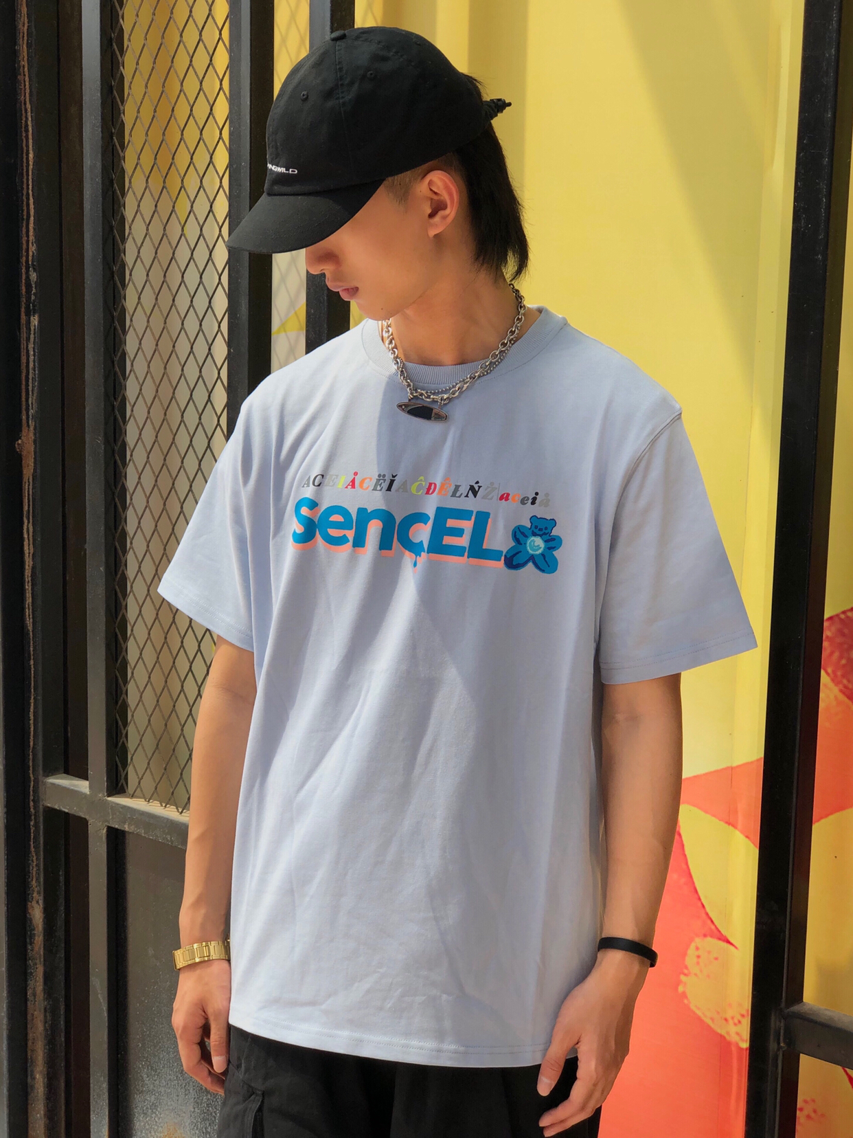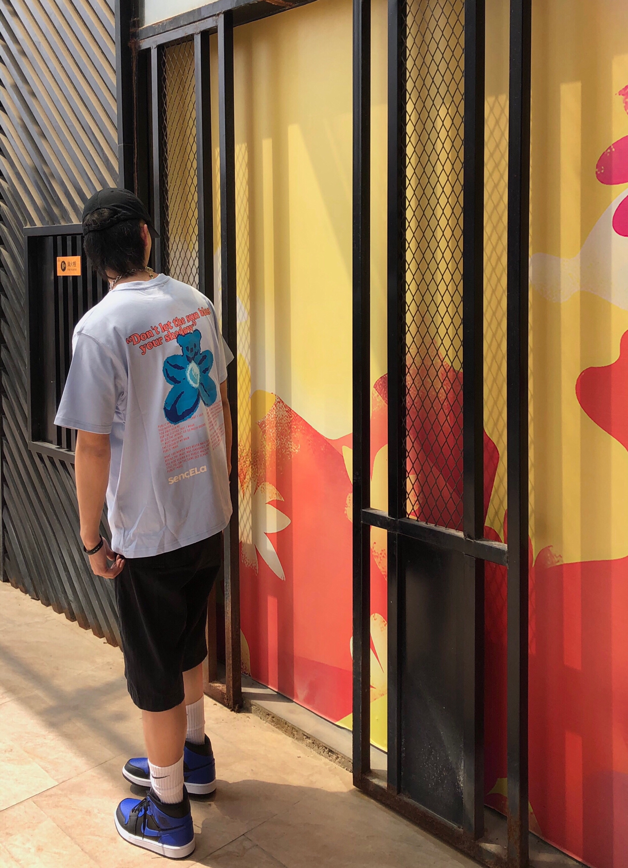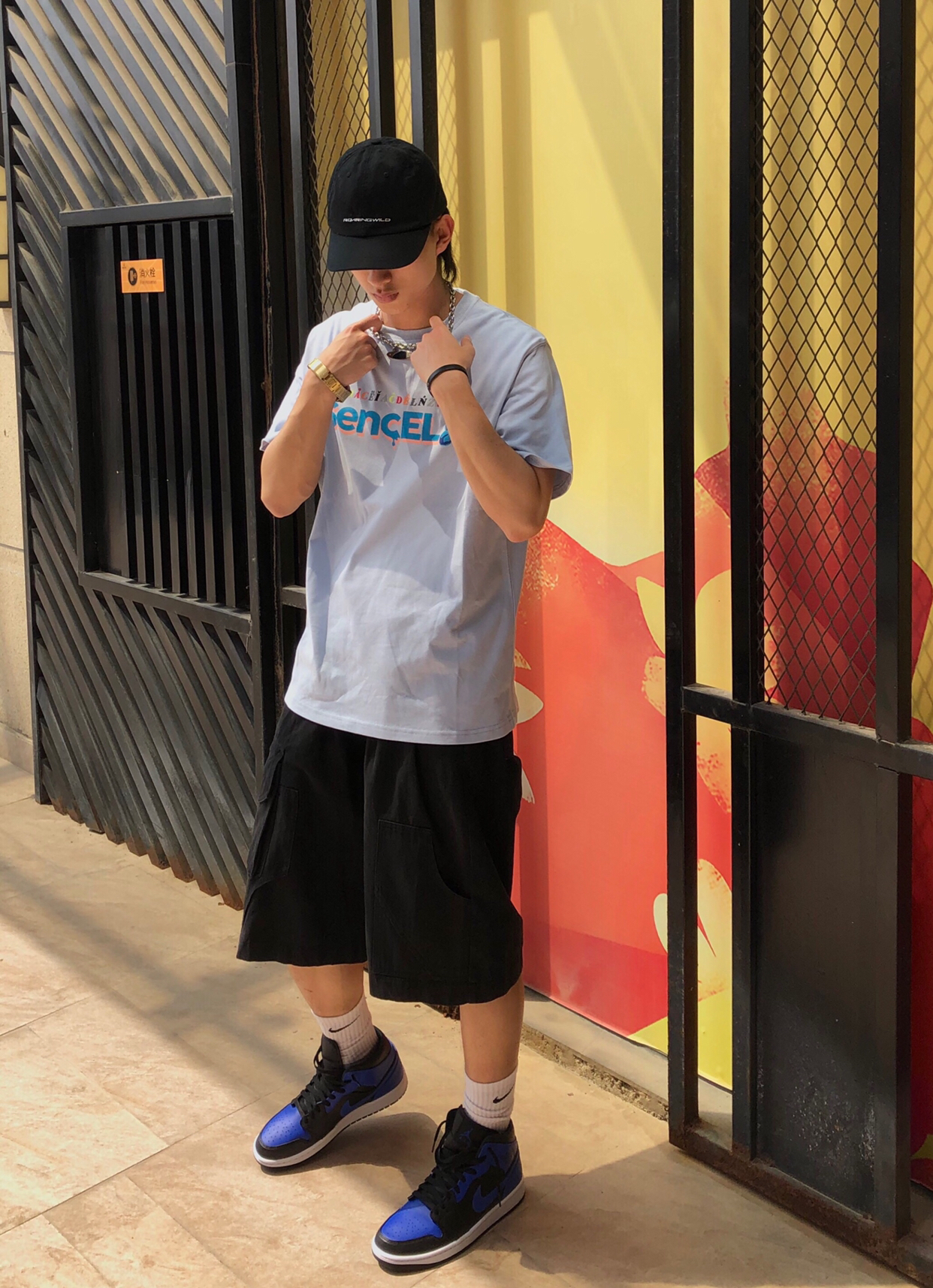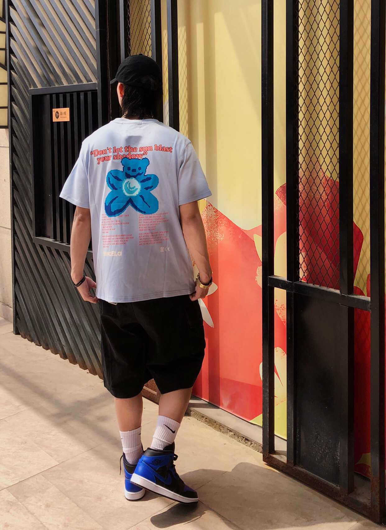 帽子:ROARINGWILD 衣服:Sencela 裤子:私物 鞋子:Air jordan 1 黑蓝 搭配:天蓝色的的短袖,小熊的图案也是相当不错的,印花也很好,在裤子我选择了大筒短裤来搭配,鞋子选择黑蓝色aj1和衣服形成搭配。