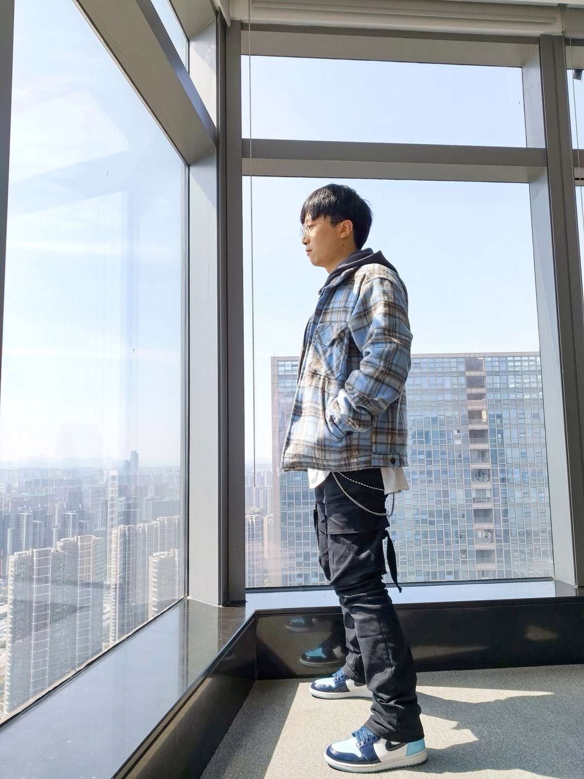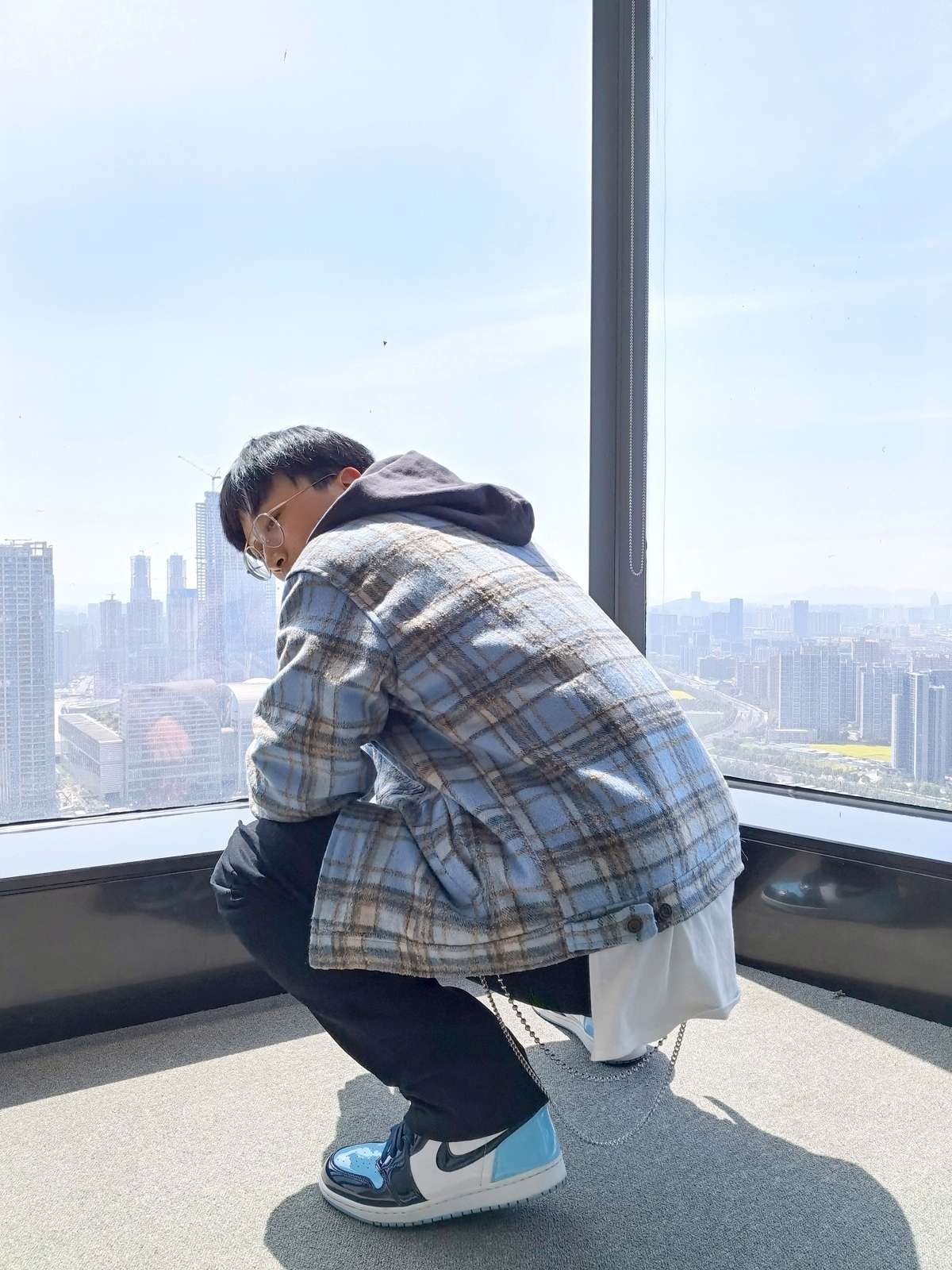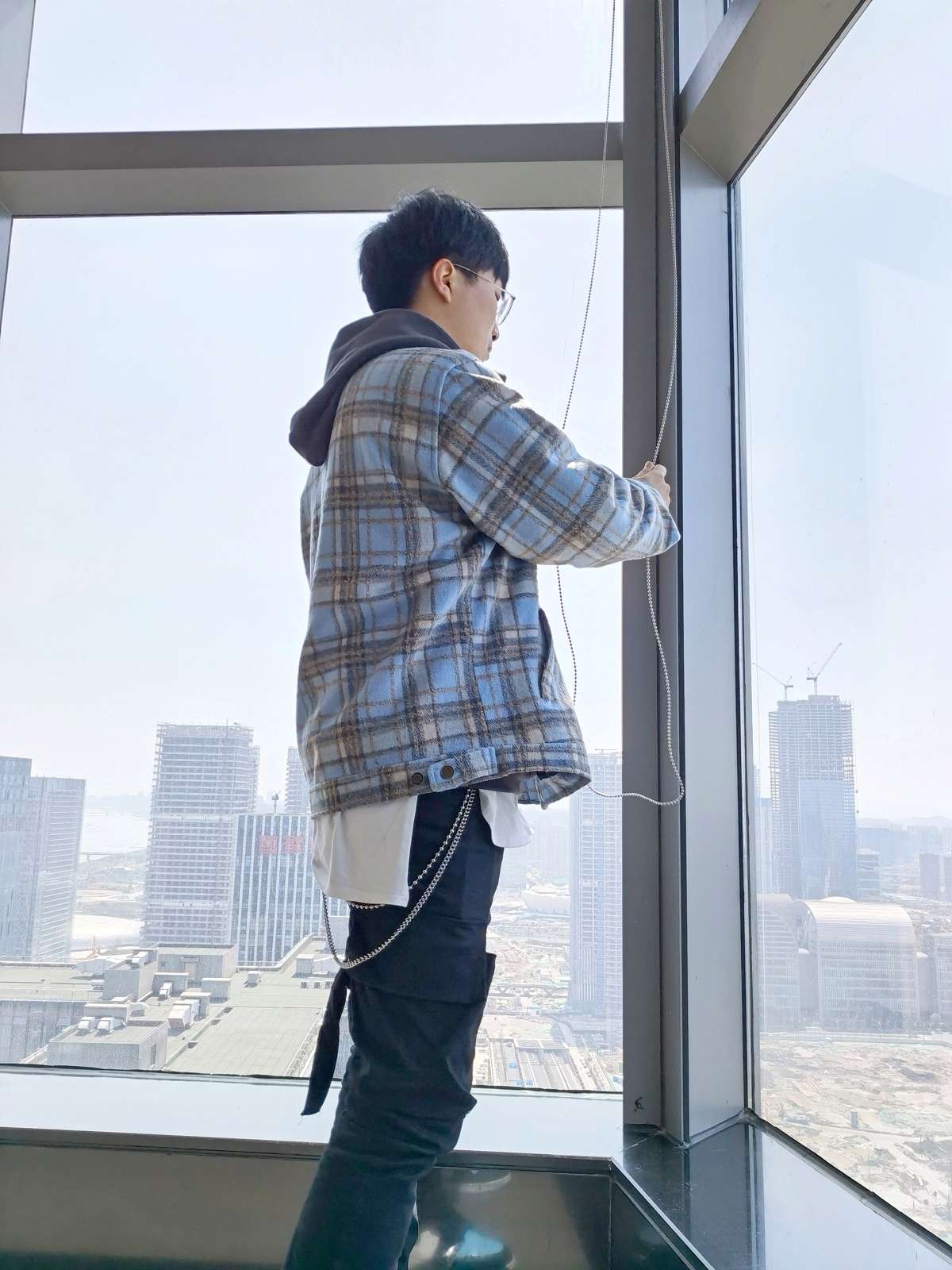 浅蓝色格子复古外套,版型挺阔,配色清新,与窗外的晴空万里非常般配,穿上它男生变小奶狗,女生变小仙女。 内搭前短后长打底,裤子挂双链,增加层次感与细节。 微喇叭裤,裤腿上有抽绳设计,修腿又有型。