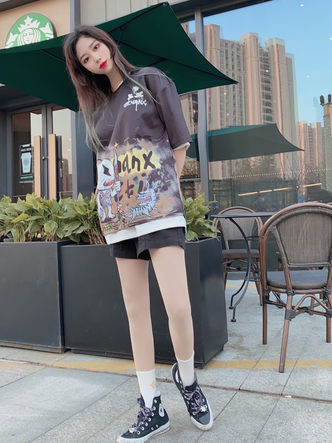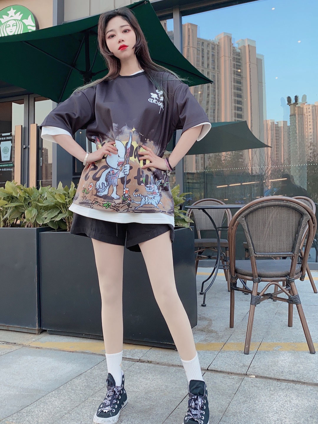 在管不住嘴的美食时代5555怎么办呢!一件黑色显瘦的T恤当然十分重要啦!太空棉的丝滑触感让冬天不再闷热,黑色和嘻哈涂鸦印花也让你的黑色不再单调! 👔:Genanx涂鸦印花宽松短袖T恤 👖:Iconslab插扣工装五分裤 👟:米奇联名匡威 喜欢就冲呀!