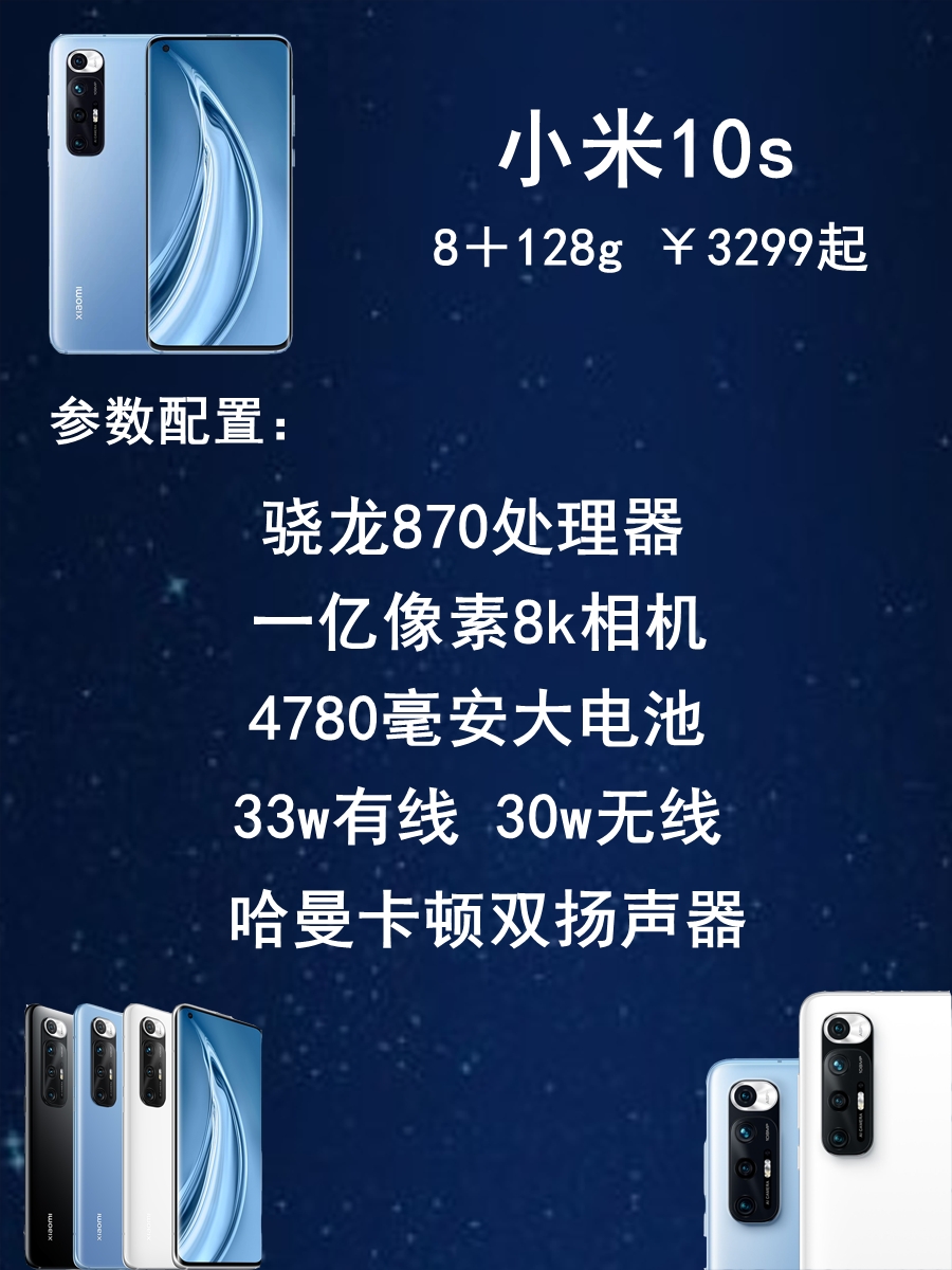 发布会十分密集的三月份即将过去,各大厂商的手机发布会都接近尾声了,今天我就来整理一下几款很值得购买的3000左右的性价比手机🤫 1、小米10s 6.67寸90hz曲面屏、骁龙870处理器、Lpddr5、ufs3.0、4780毫安电池、33瓦有线 30瓦无线 10瓦反向充、后置1.08亿 ois防抖主摄🤗+1300万广角+200万景深+200万微距、前置2000万、屏幕指纹、双1216线性扬声器、...
