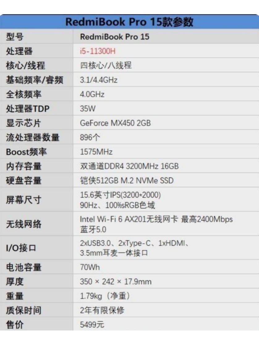 RedmiBook Pro 15详细参数规格如图: