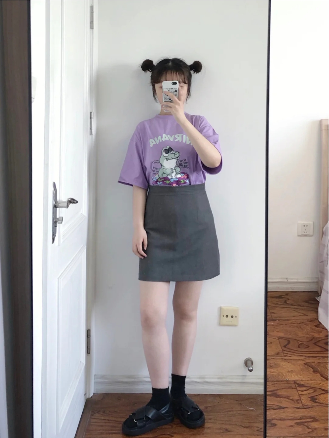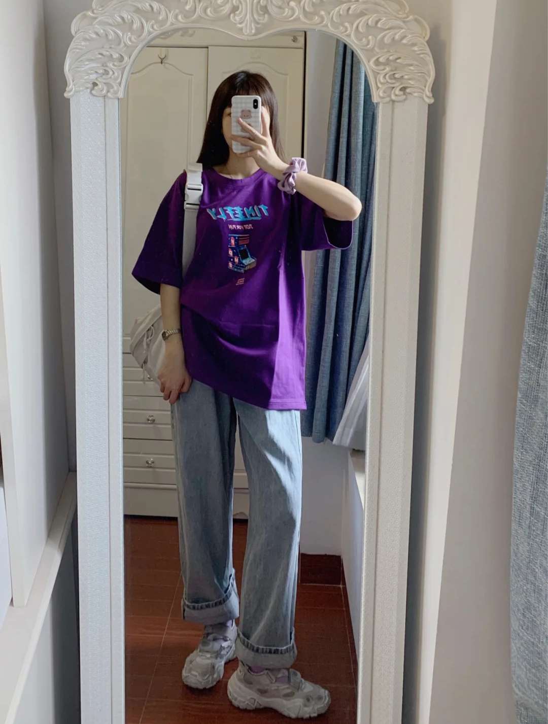 饱和度很高的紫色就特显白,搭配深色牛仔裙很高级,巨显腿长!