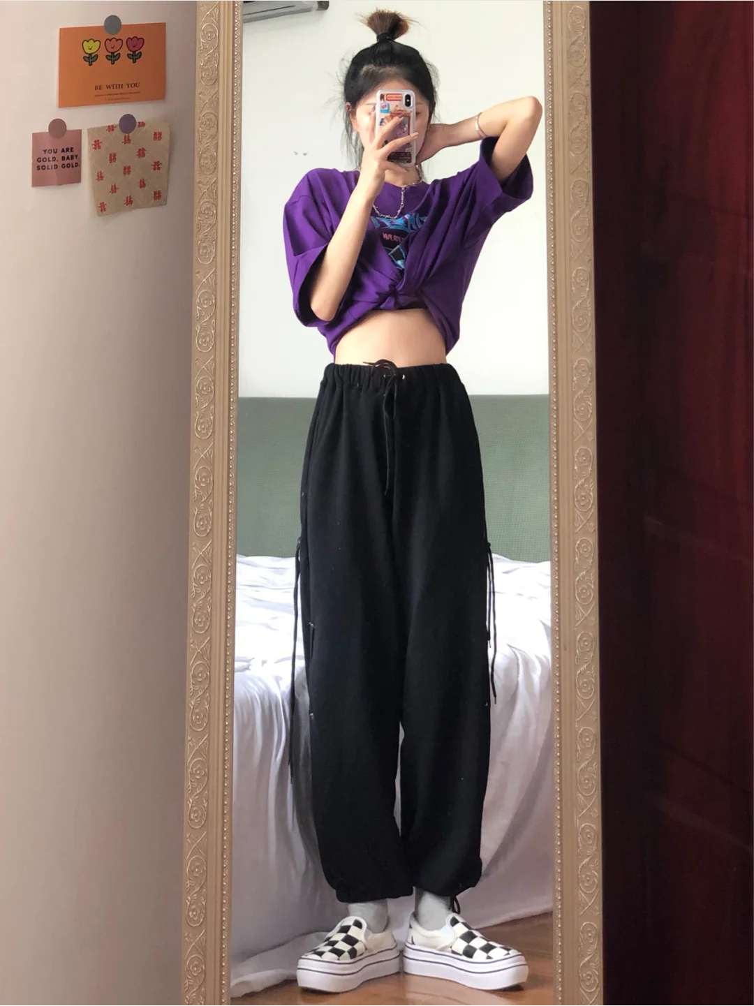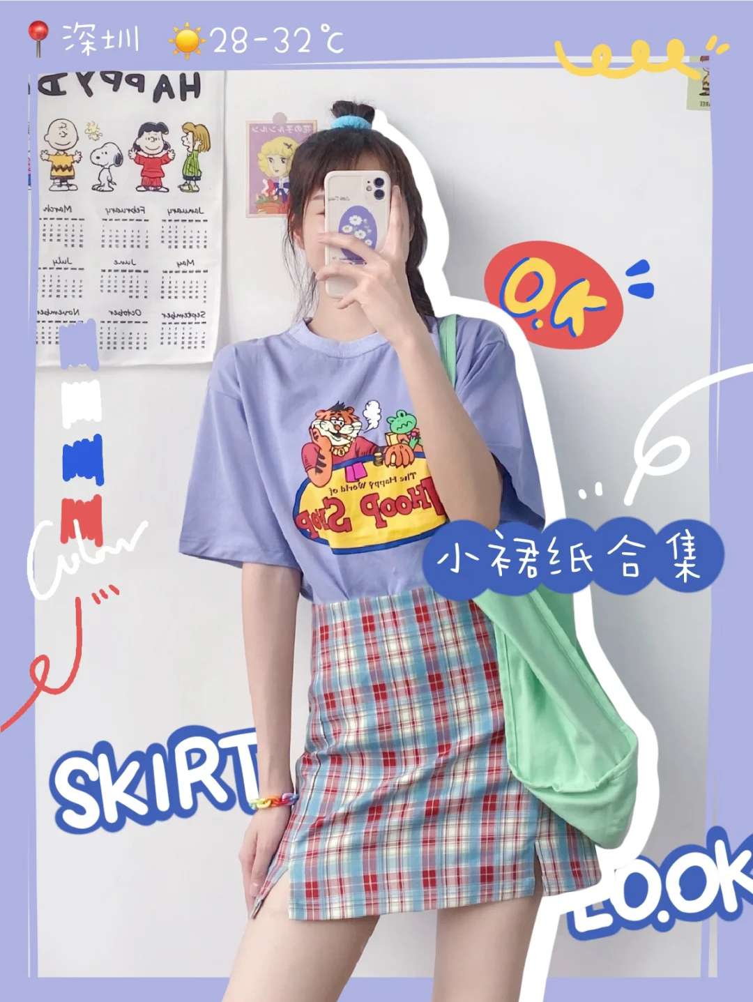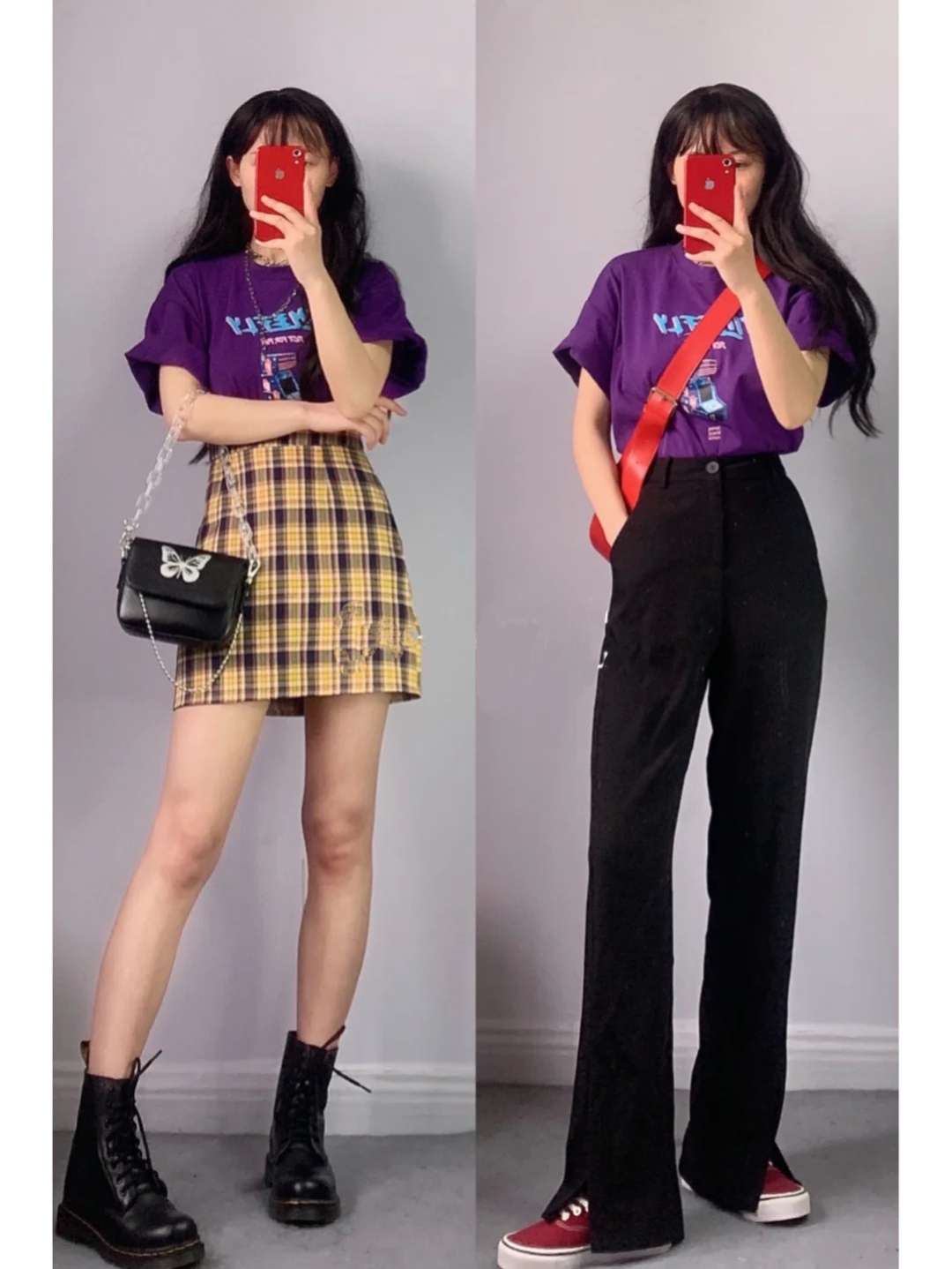 这套是甜酷女孩穿搭!清新紫色国潮T+温柔的格子裙很仙!
