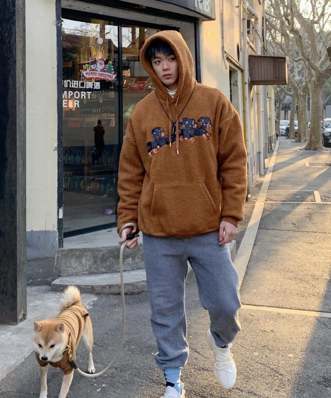 上衣是橘棕色毛绒卫衣,裤子是毛尼质地的灰色宽松运动裤。这样的搭配走在街上基本不会和别人撞衫。