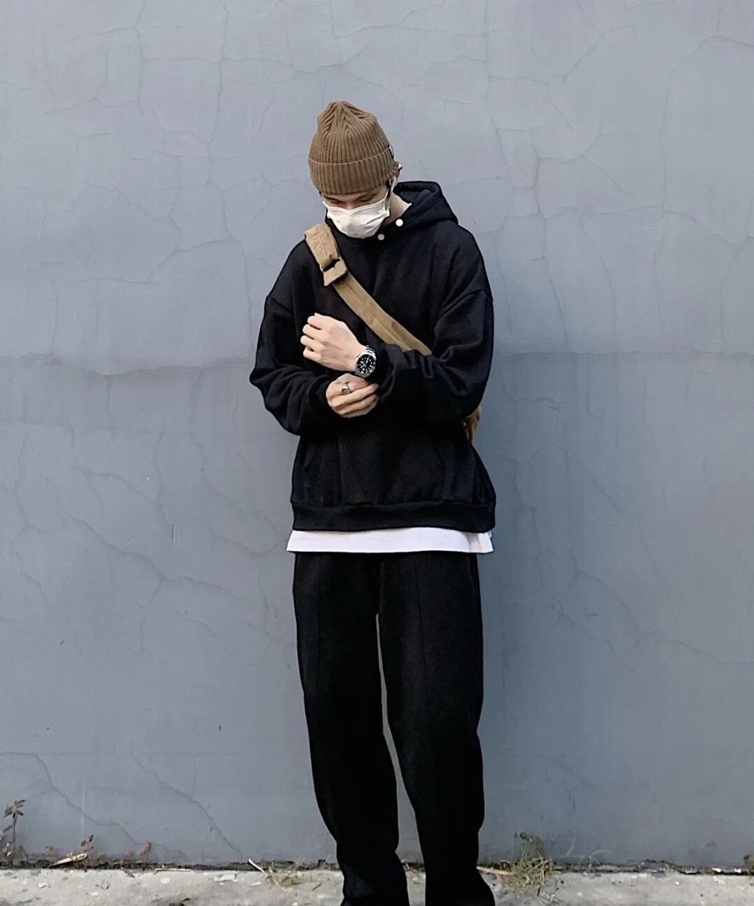 棕色针织帽🧶,打底白t外搭黑色纽扣连帽卫衣增加层次感。搭配棕色斜挎包与帽子和鞋子呼应。下身选择黑色垂感卫裤,锥形直筒版型,显瘦百搭。