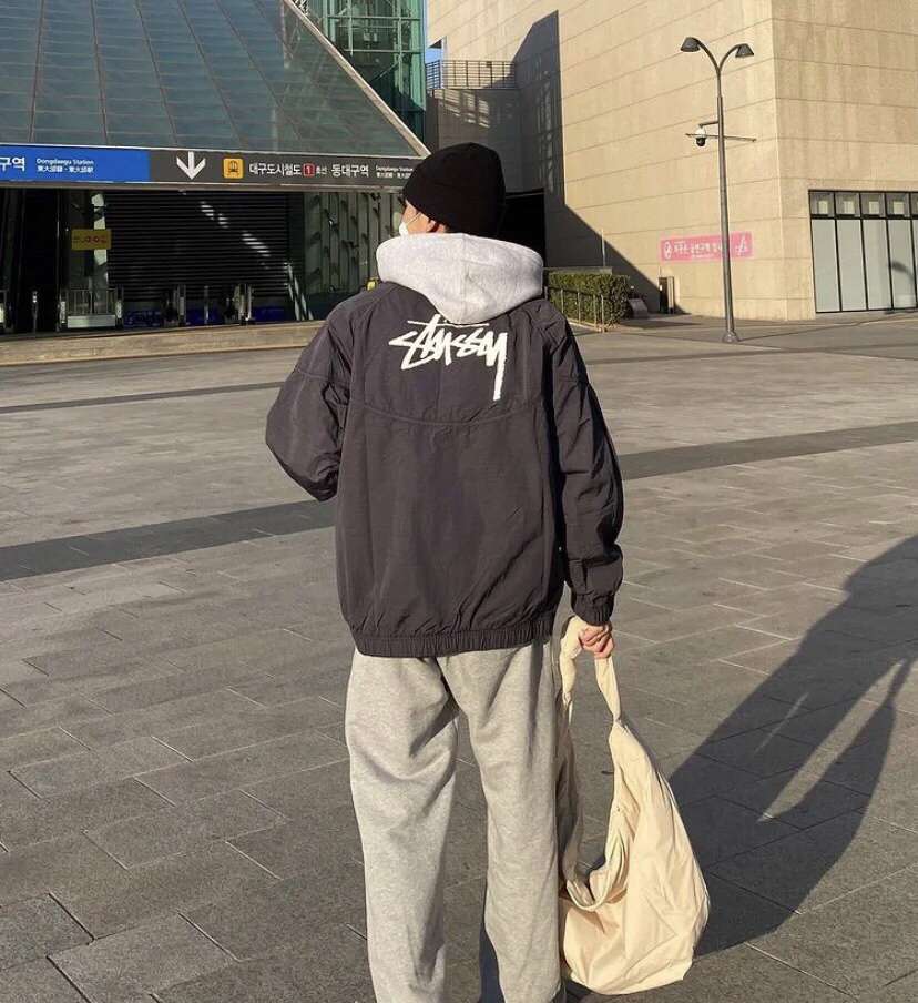 一身灰色卫衣卫裤搭配同色系深灰色外套,整体干净清爽,非常显高。再选择一个米黄色的背包最为提亮,超经典的一套。
