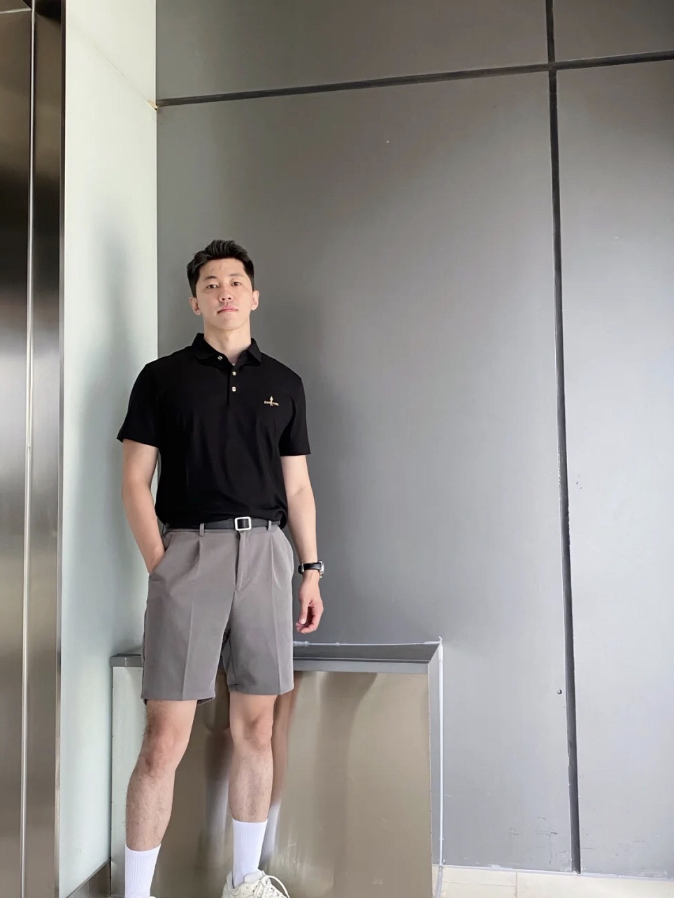 上衣👕是一件黑色Polo衫,男生夏天很容易出汗,穿纯棉优质面料的上衣很透气,不会觉得闷热。下身搭配简约西装裤,还可以配手拎商务包。