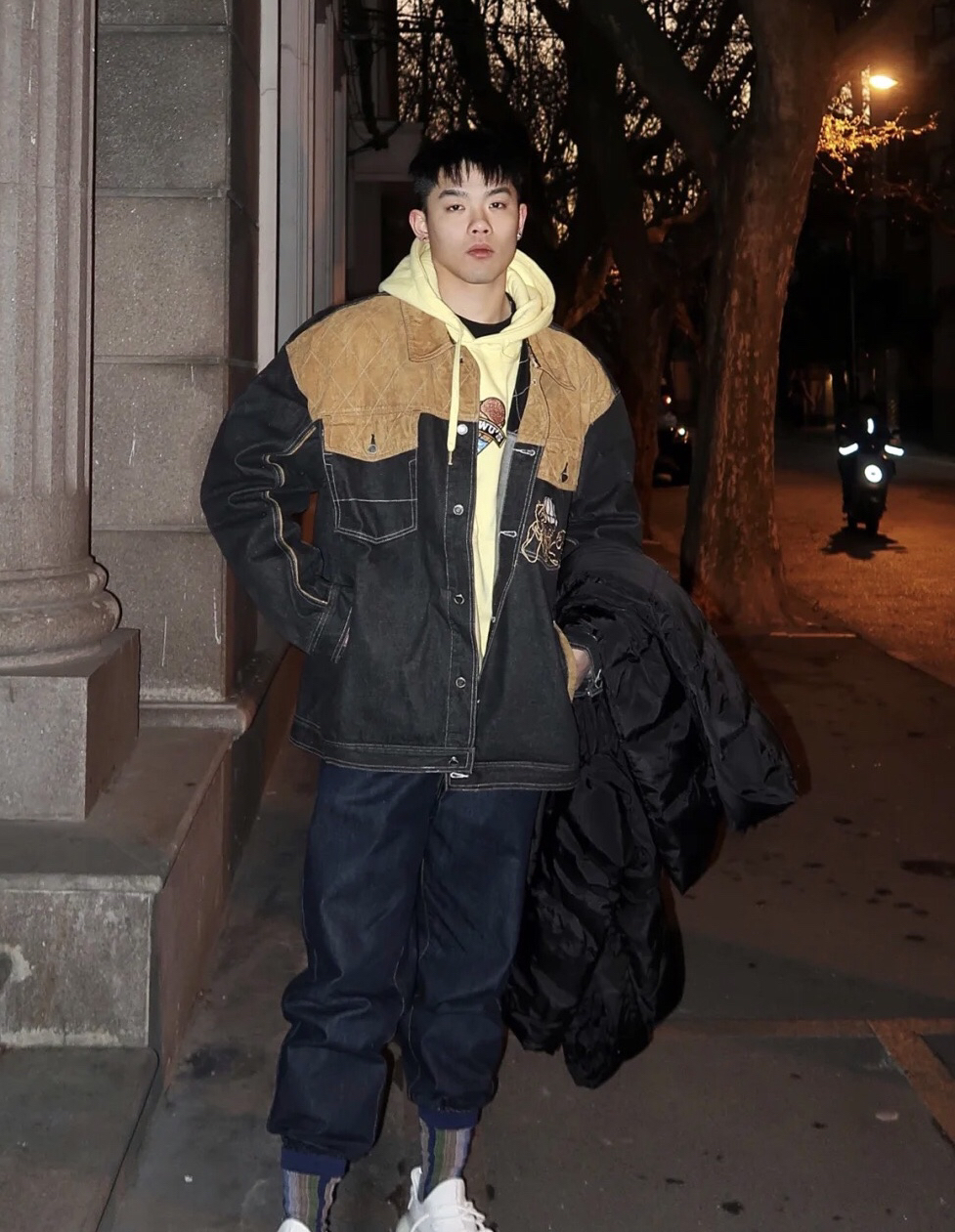 穿大件的衣服真的很显头小,不要担心衣服会臃肿,看整体搭配穿出范就行。深灰色牛仔外套搭配蓝色束脚牛仔裤,复古美式的感觉就出来了。