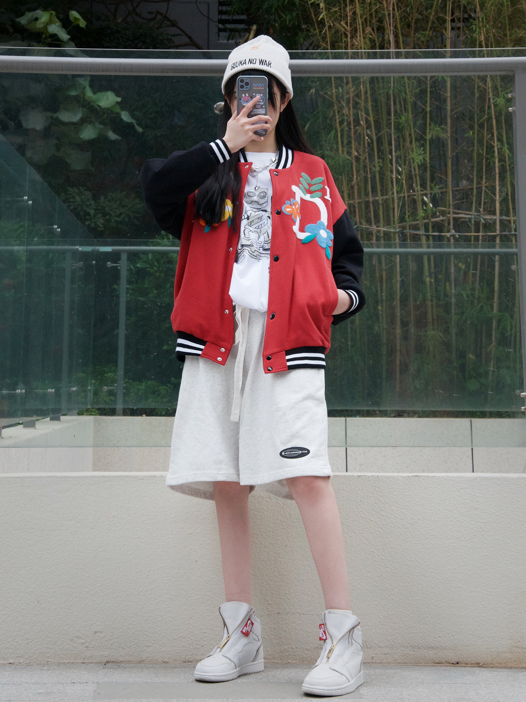 短袖:freamve 外套:freamve 裤子:chrrota 项链:guuka 今年特别流行的vibe风格必备单品之一就是棒球服,如果还没有入手的你,可以看一下这件棒球服!普遍棒球服都是棉和pu结合的材质,这件是纯棉的,包括袖子也是全棉的!袖子是红黑结合不是全红。涂鸦图案是植物和蝴蝶,充满着阳光正能量,涂鸦用的是毛巾绣的工艺,视觉效果很好!这件棒球服很百搭,普普通通一件白T配短裤就有型了。