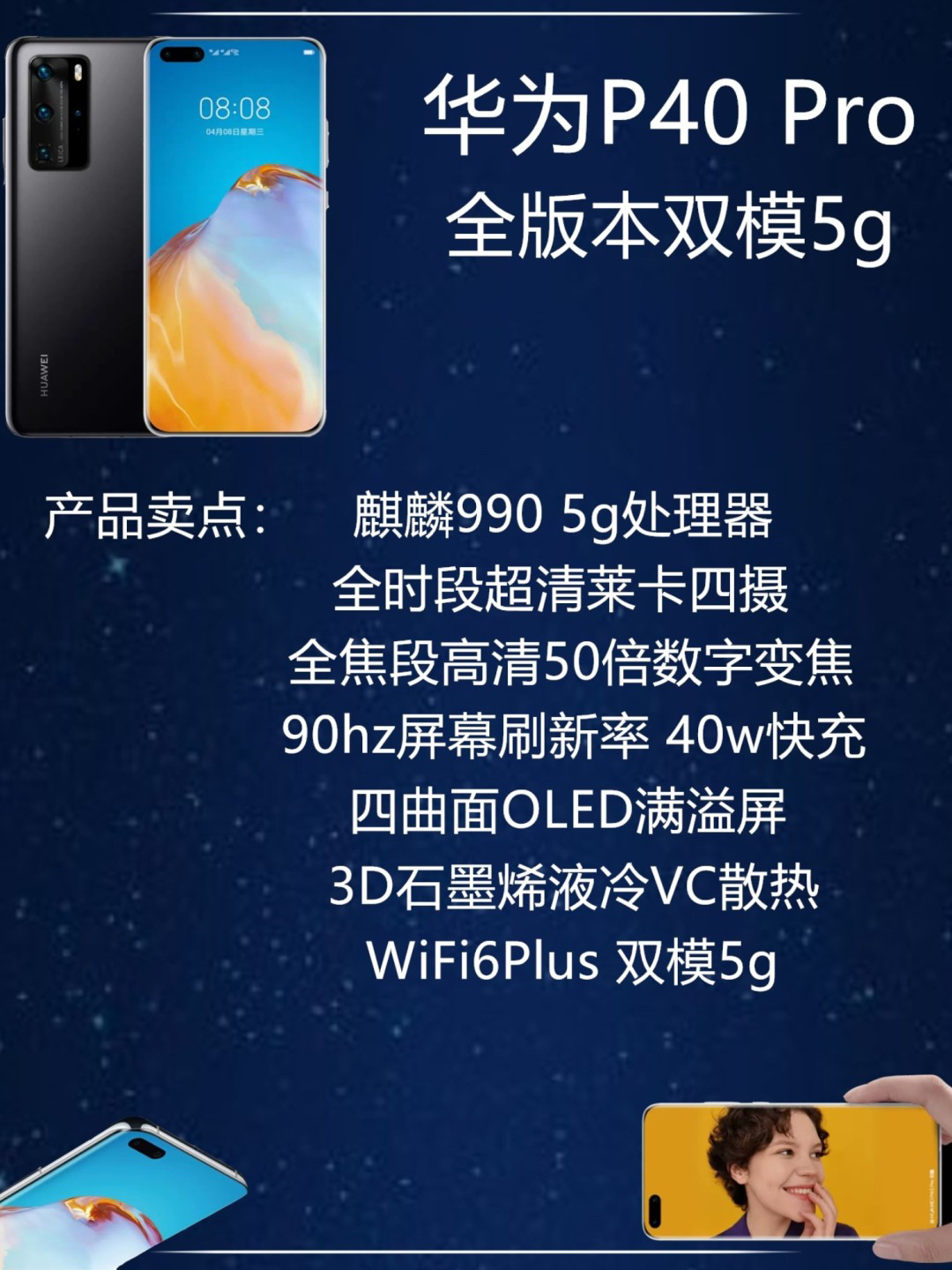 现在的线下渠道销售两个版本,一个是p40标准版,一个是Pro版,个人认为Pro版本升级更大,更吸引我的眼球怎么办?钱包好像有点不受控制 首先我们来看一下它的重要参数: 华为p40pro 麒麟990处理器、重209g、厚8.95mm、4200mAh电池、40w有线、27w无线快充、支持无线反向充电、6.58英寸 90hz四曲面屏幕、支持DCI-P3广色域、3200万+景深前置、5000万索尼imx7...
