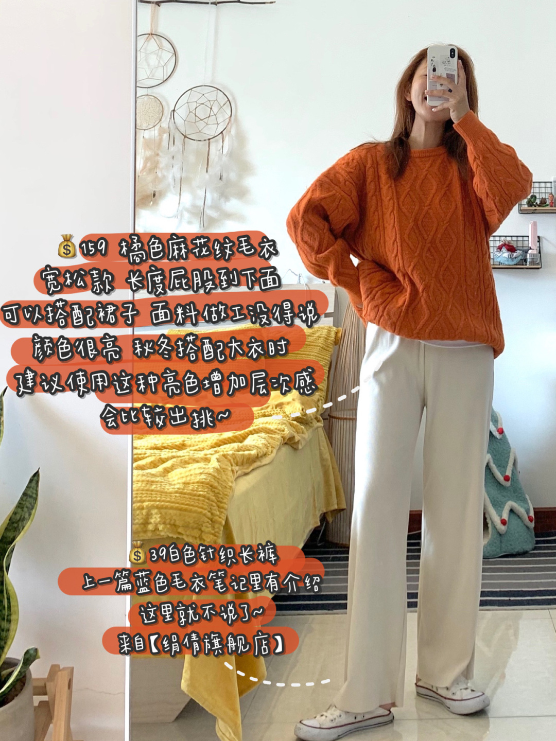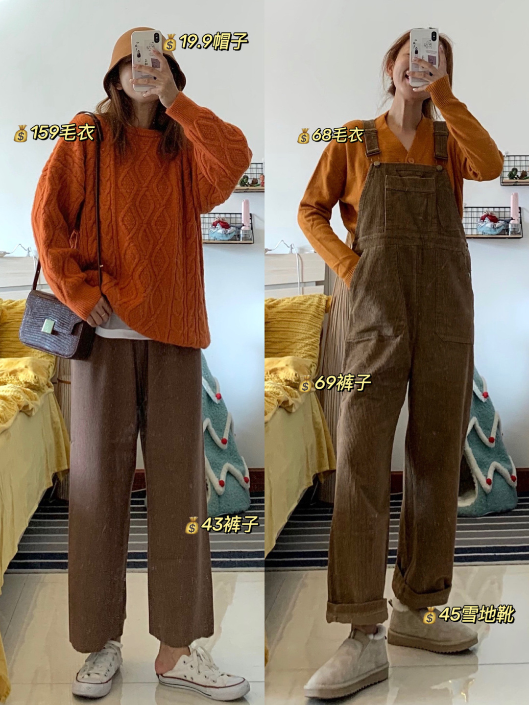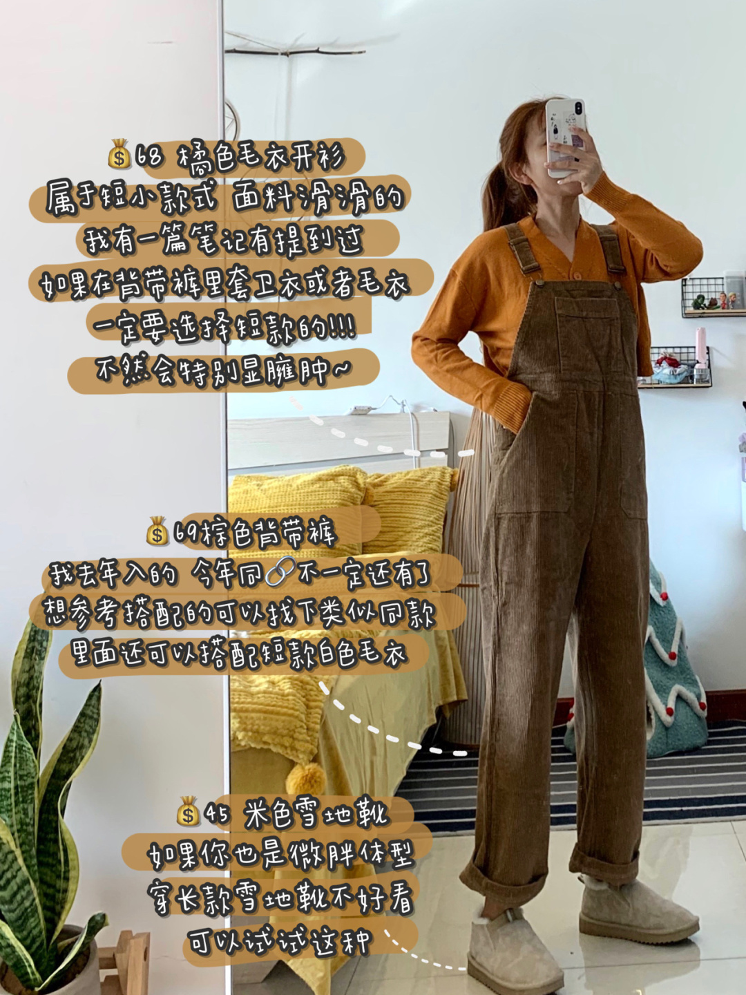 一样是棕色和桔色搭配 只是简单换了条裤子 就是从韩系通勤风 变成了可爱和盐系风格 灯芯绒背带裤 因为材质问题穿上不会让你看着特别瘦 配个米色雪地靴是可可爱爱的感觉~棕色毛毡帽前面笔记有,毛衣在👆,其余单品不知道还有没有,大家看下尾图,就不单独再说啦~