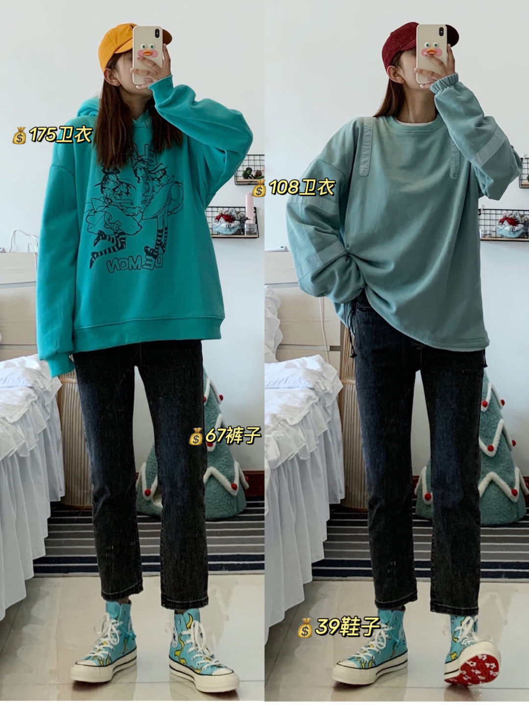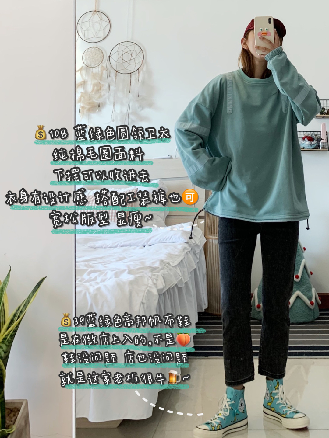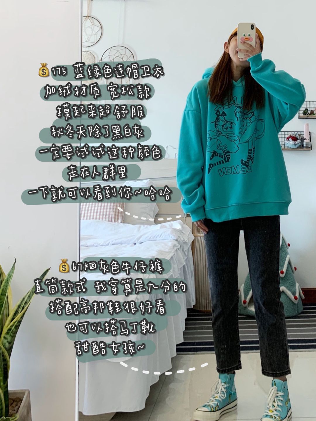 我到现在也不知道卫衣的颜色到底算蓝色还是算绿色 我知道它们有一个好听的名字叫湖蓝色 这两件卫衣都不是过分荧光的蓝绿色 我拍照现在基本都是手机后置提个亮 我这么黑黄的皮肤穿都可以穿 是不会显黑的~