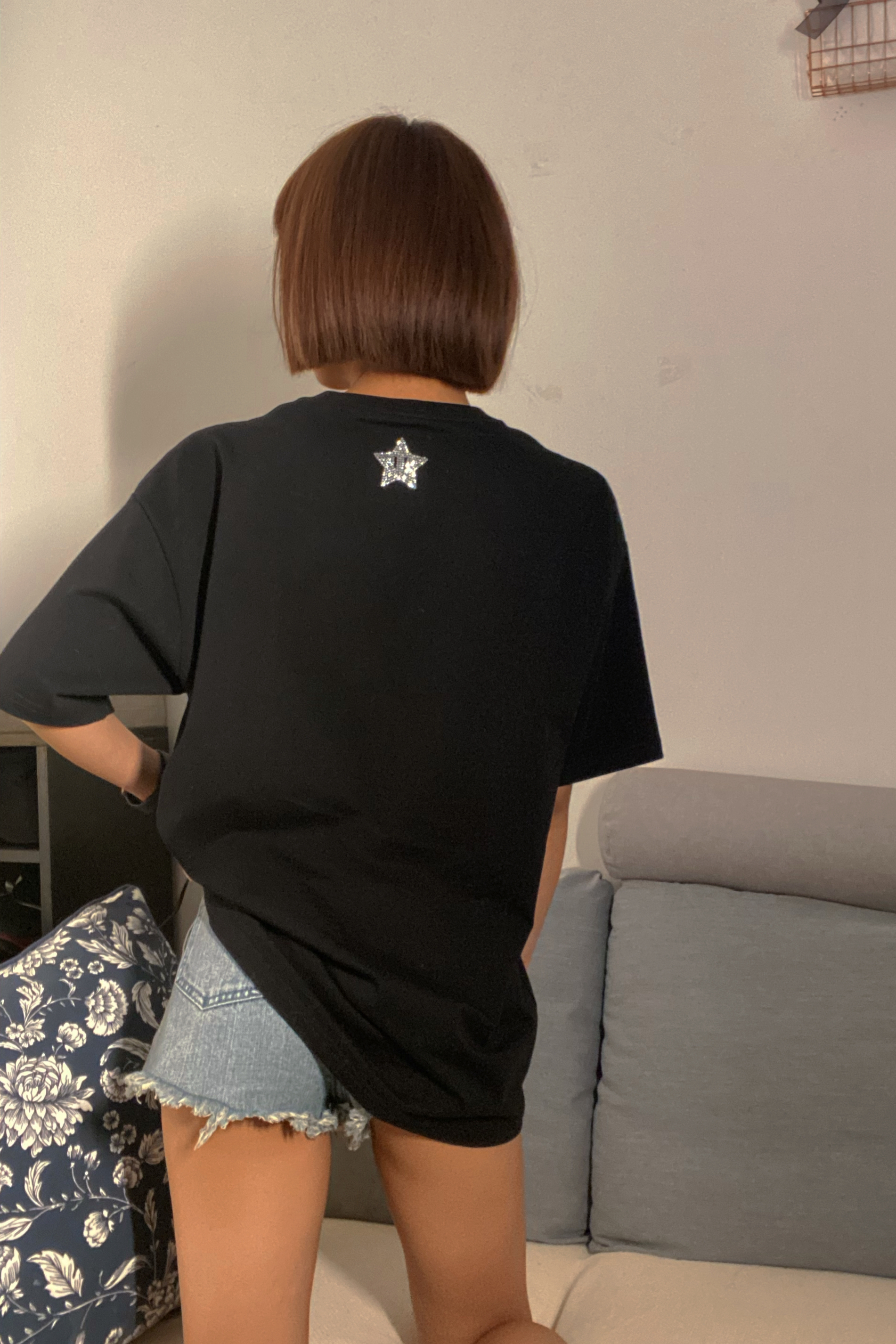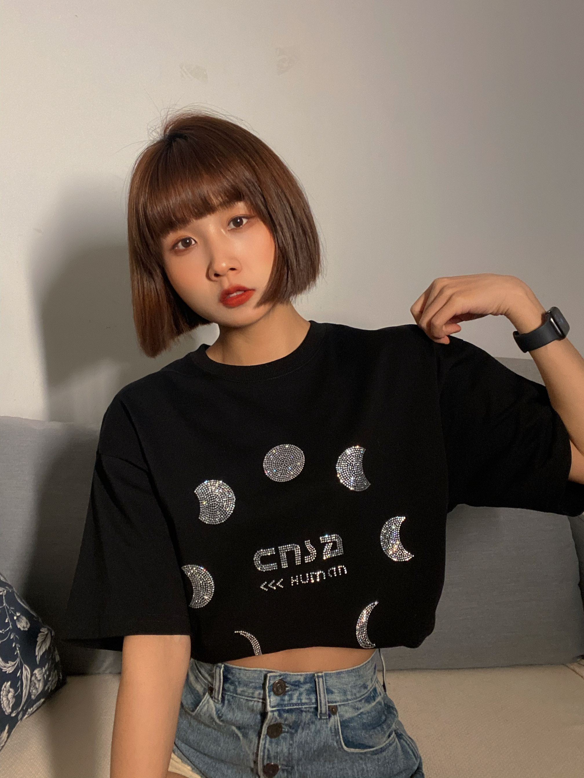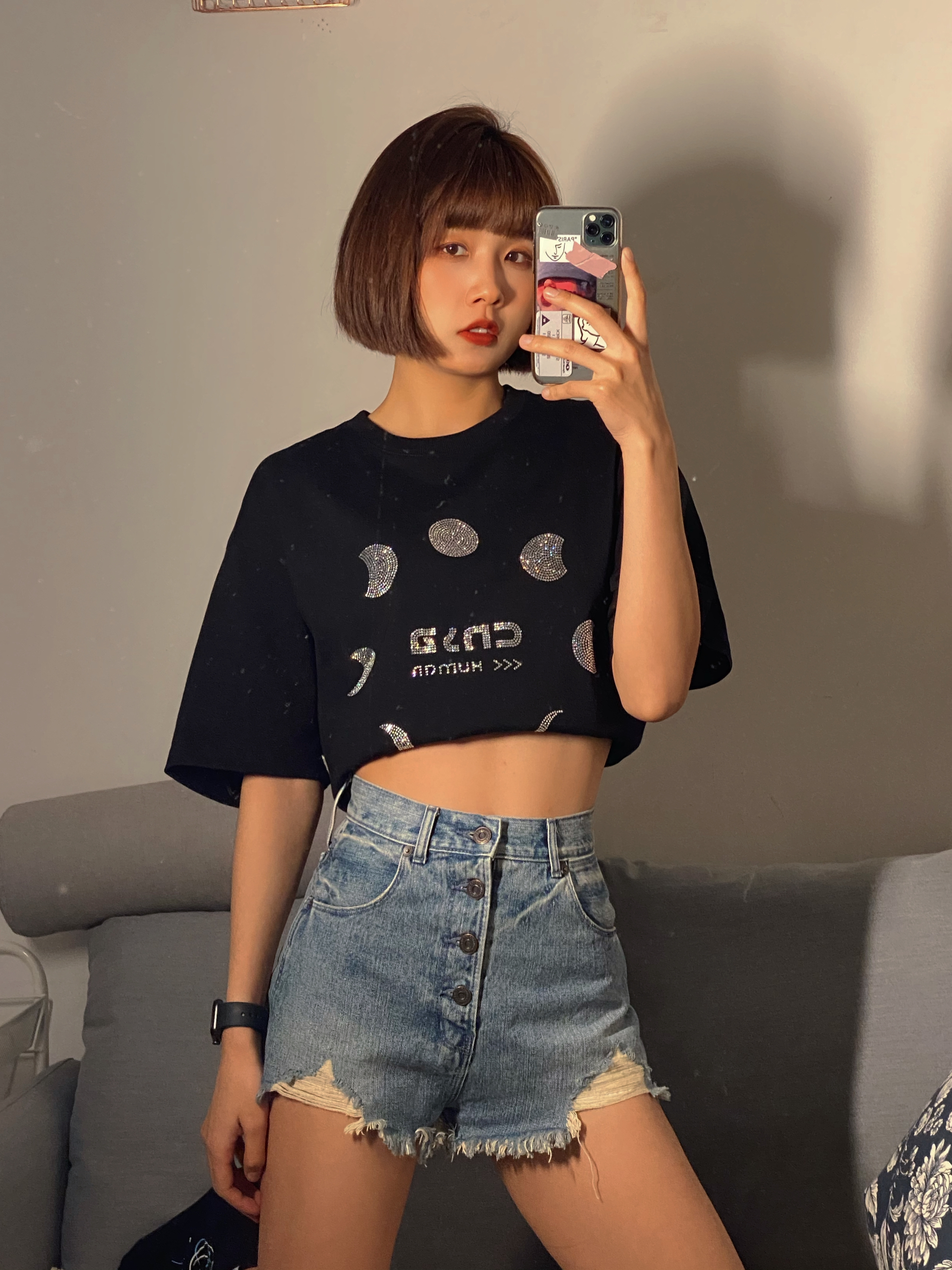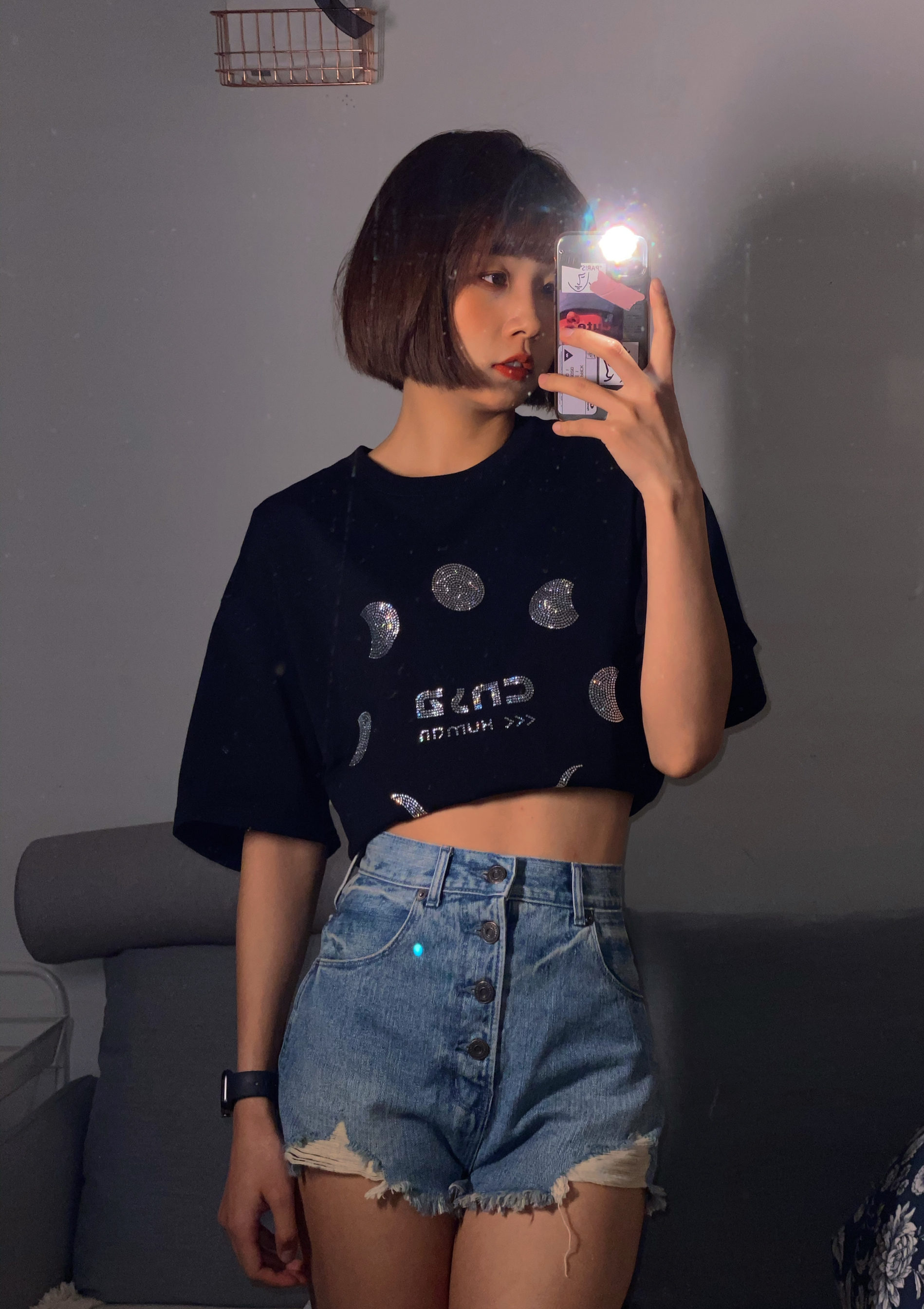 169cm 50kg 👕:FEAROM,月食烫钻的装饰设计短袖,面料厚实,oversize的款式超级百搭,辣妹折起来穿也超🉑️ 🩳:moussy,经典四扣短裤,背后口袋有柳钉设计,超显腿长~ 🧦:上森派系,薄厚合适,泼墨的反光设计超🆒