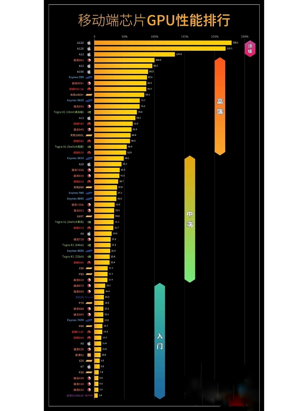 这应该是最全的手机芯片天梯图了,有需要保存一下叭 不得不说一下,苹果太流批了。原本以为CPU方面已经被追赶的差不多了,结果忽略了GPU的比较。。。现在看最新iPadPro的a12z甚至能比肩桌面级英特尔i7 1065g7处理器你的下一台电脑何必是电脑 还有就是联发科天玑1000+真的🉑买,别看是联发科,两千出头的价能略强于去年旗舰855比肩今年华为旗舰990,并且这颗u综合来看也没有翻车。它不香嘛...