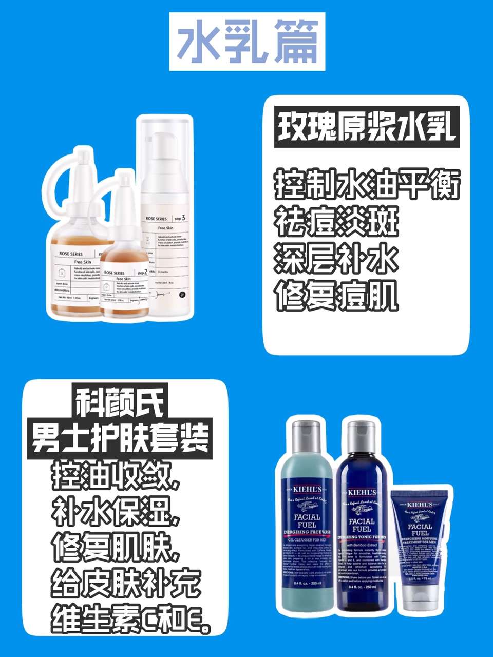 分为洁面啫喱、爽肤水和保湿乳液,爽肤水的效果是控油收敛,补水保湿,保湿乳液的作用是修复肌肤,给皮肤补充维生素C和E。